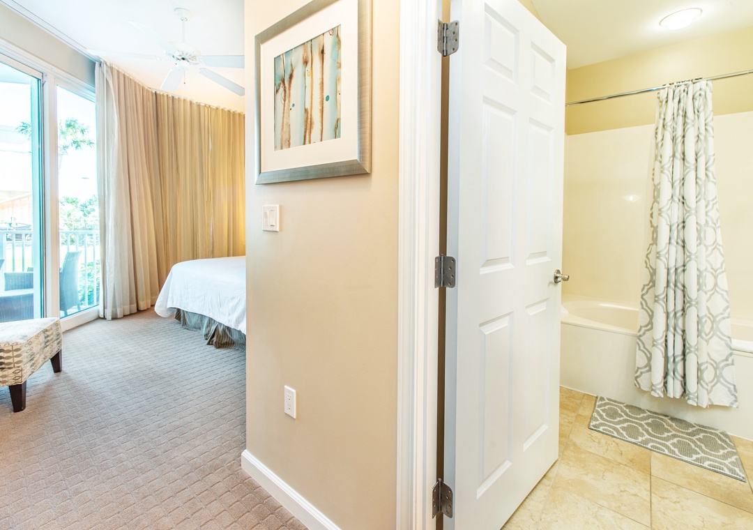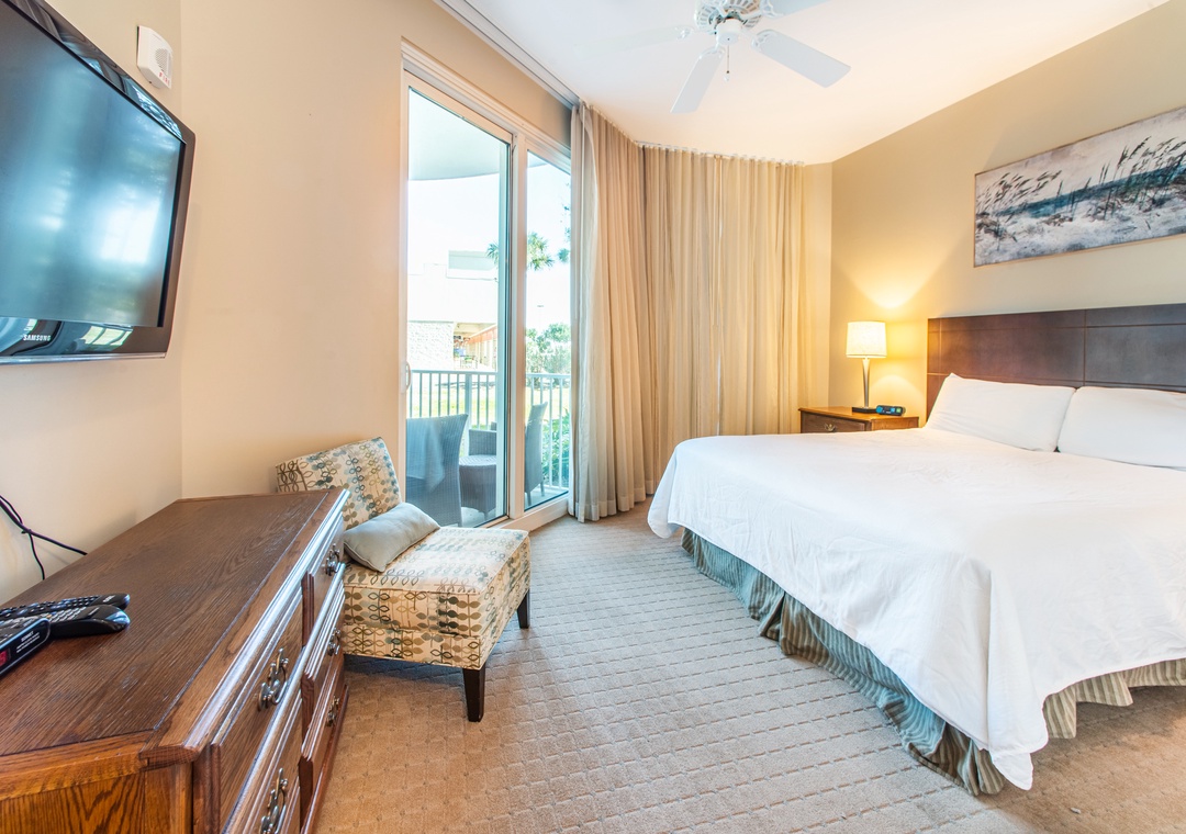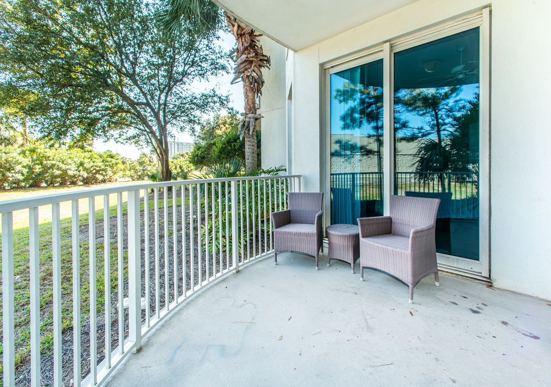 You'll never want to leave the Palms of Destin! Stay here for a true 'resort' experience. Palms Resort #1106 is a Junior 2BR/2BA, which is a 2 bedroom with a full-size master bedroom plus a smaller bedroom and two full sized bathrooms, one with a walk-in shower. This ground floor unit is convenient for easy no stairs access to the pool and on-site restaurant. Soak in the lovely green space & pristine landscaping from your private ground floor patio! With a king bed in the master, a custom full over queen bunk bed in the guest room, and a sleeper sofa in the living room, this lovely condo sleeps 6 guests comfortably. Updated furnishings throughout, multiple flat screen TVs, and your own washer and dryer complete this beautiful unit. Palms Resort #1106 is sure to make you feel right at home on your beach getaway!