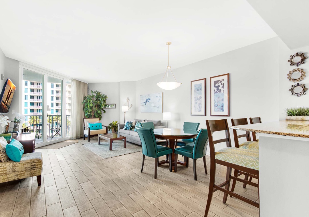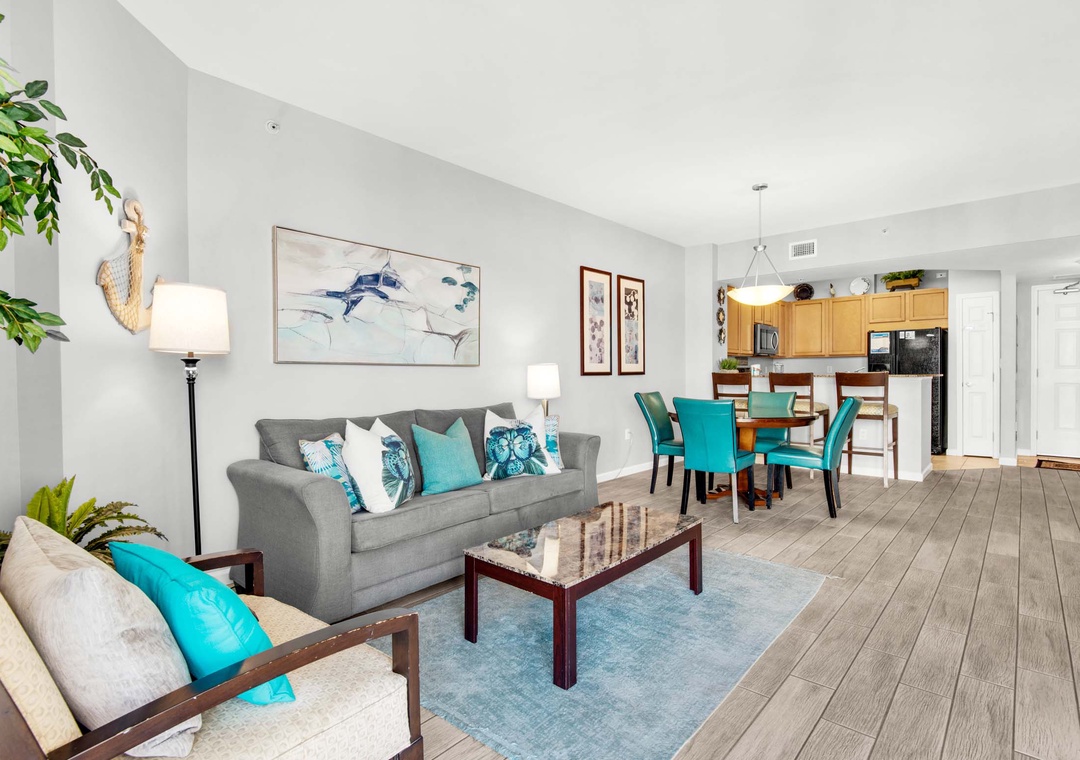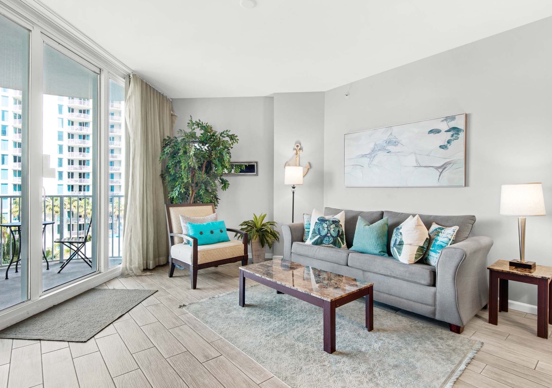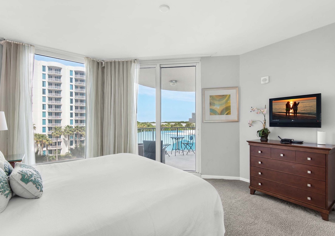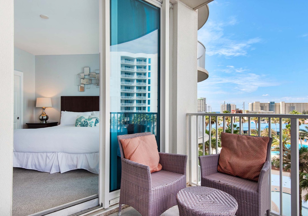 Welcome to Palms Resort #1505. This beautiful junior 2 bedroom, 2 bathroom offers a king in the master bedroom with balcony access and En suite, a smaller guest bedroom with a twin bed and twin trundle plus direct access to the second bathroom, and the living room has a sleeper sofa making this condo sleep 6 guests comfortably. Enjoy pool views from the balcony, a washer/dryer for your convenience, and a spacious living room with beautiful furnishings. Come enjoy all that the Destin Palms Resort has to offer at Palms Resort #1505!