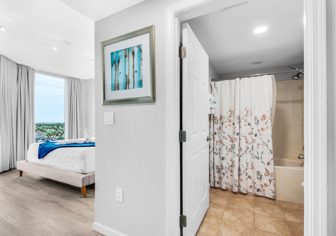 Welcome to Palms Resort #1512. This beautiful junior 2-bedroom, 2-bathroom features new flooring throughout, new furnishings, decor, and more! Offering a king bed in the master bedroom with balcony access and En suite, a smaller guest bedroom with twin over twin bunk beds, and direct access to the second bathroom, making this condo sleep 6 guests comfortably. There is a full size washer/dryer for your convenience and a spacious living room with beautiful furnishings. Have breakfast sitting on your private balcony and taking in the views. Come enjoy all that the Destin Palms Resort has to offer at Palms Resort #1512!