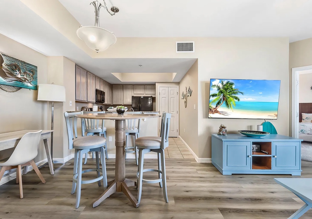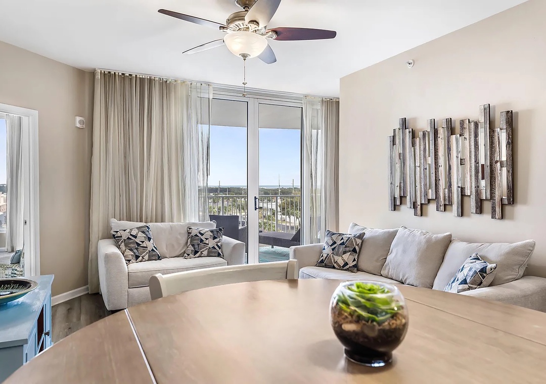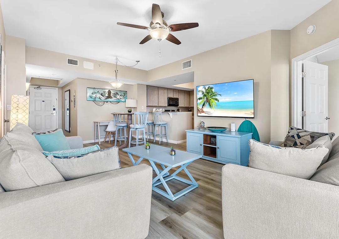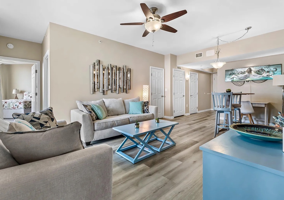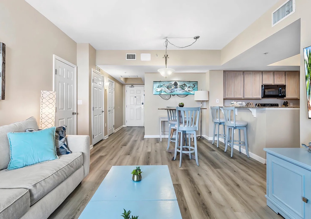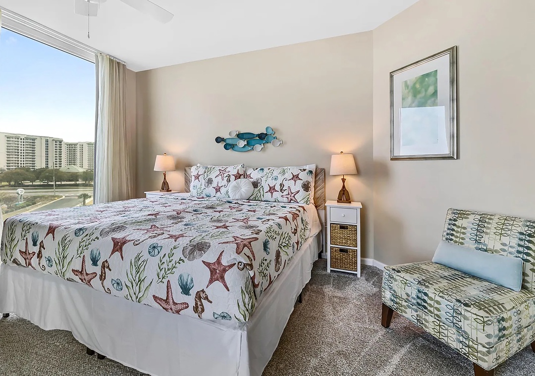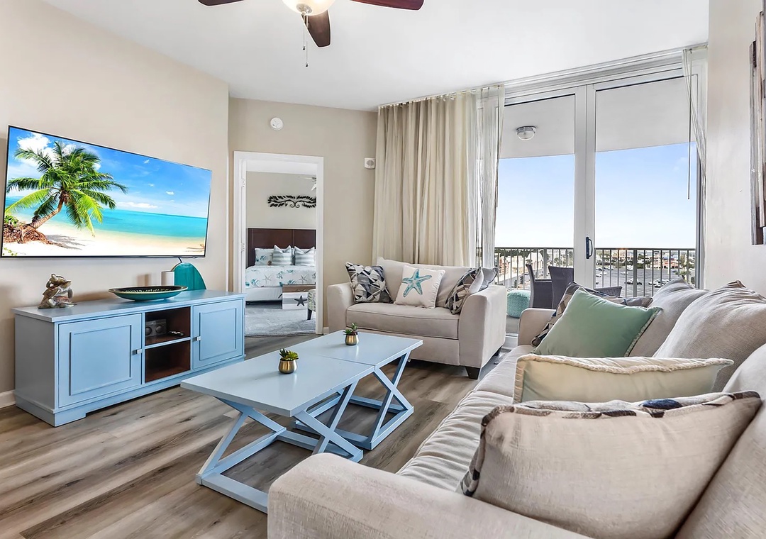 If you are looking for a family-friendly place to call your next home away from home, look no further than Palms Resort #1516. This lovely condo is a full 2BR/2BA featuring a king bed in the master bedroom with balcony access, a king bed in the guest bedroom with balcony access, and a sleeper sofa in the living room to sleep up to 4 guests comfortably. Enjoy the beautiful custom furnishings, appliances, and stackable washer/dryer for your convenience. You'll never want to leave the Palms of Destin where you will experience a true 'resort' experience. The 11,000-square-foot, 259,000-gallon zero-entry pool is DESTIN’S LARGEST LAGOON POOL. You'll be blown away by the 5 dancing waterfalls, walking bridges, and spacious lounging area. There's a 21,000-gallon heated pool, children's splash area, and whirlpool. Make lasting memories at Palms Resort #1516.
