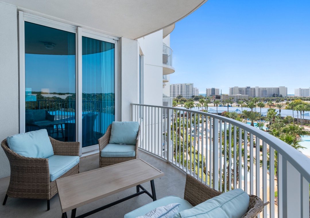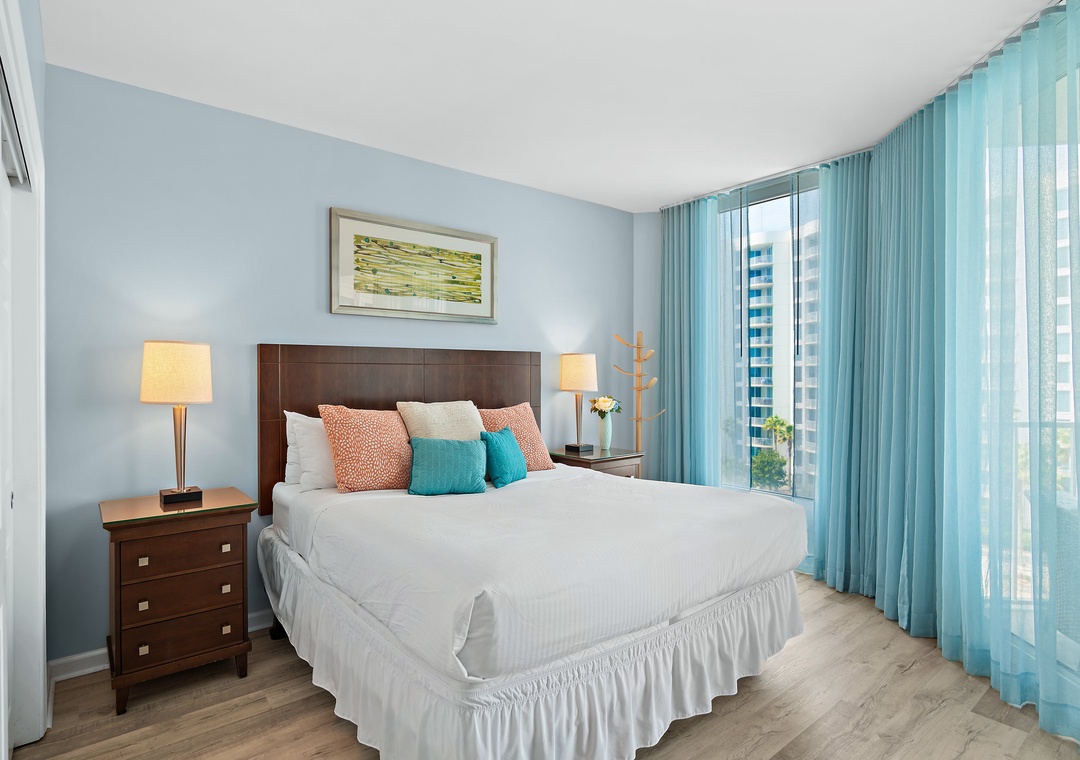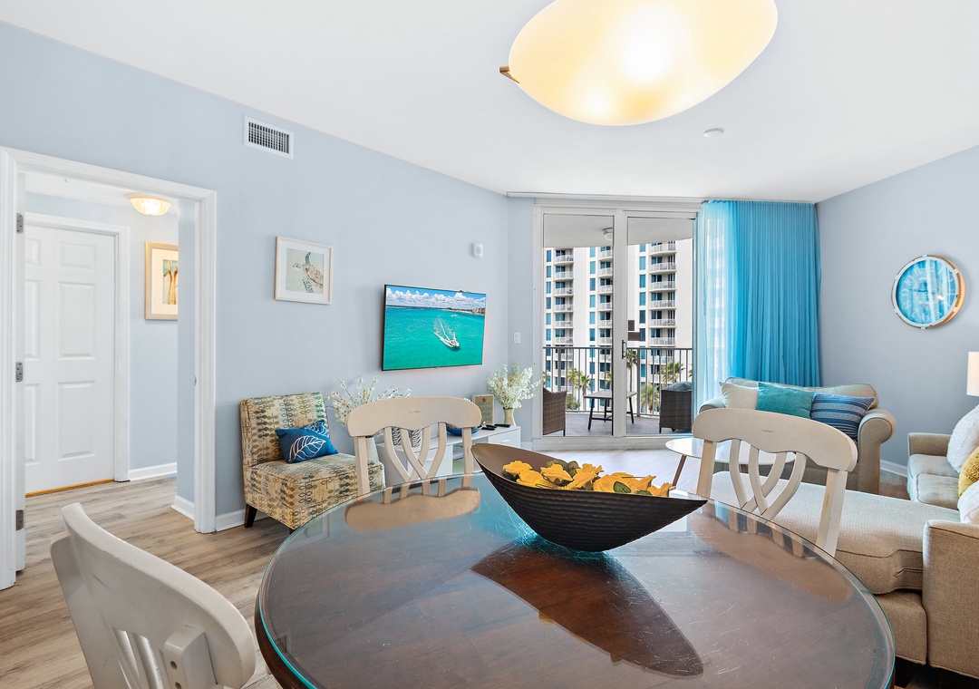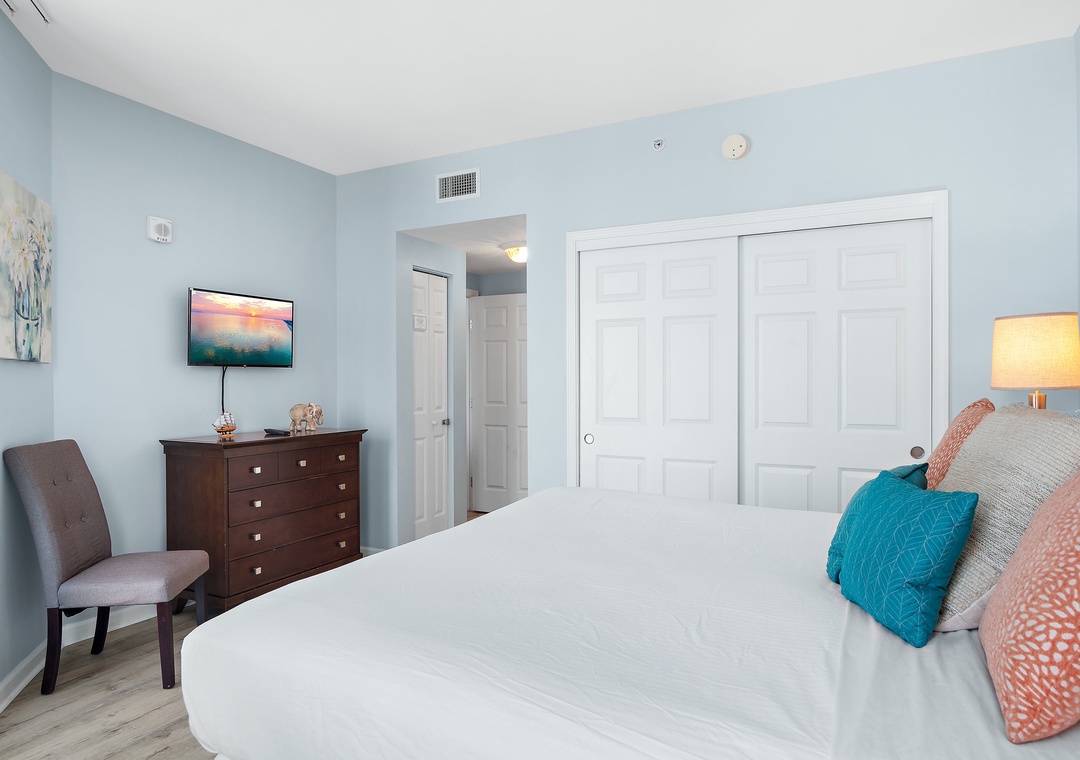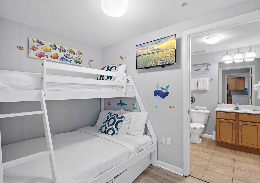 Welcome to Palms Resort #1603! This Junior 2BR/2BA condo features a full-sized master bedroom and a smaller second bedroom, both with private access to full bathrooms—one of which includes a walk-in shower. The master suite offers a king-sized bed and flat-screen TV, while the second bedroom includes a twin-over-full bunk bed, flat-screen TV, and direct bathroom access. For extra sleeping space, there's a twin sleeper sofa in the living room, bringing the total accommodation to 6 guests. The condo is beautifully furnished, with a spacious living area, flat-screen TV, and a private washer and dryer for added convenience. Start your mornings with stunning Gulf views from the expansive balcony and enjoy all the amenities The Palms of Destin has to offer—including the lagoon-style pool. Make Palms Resort #1603 your next vacation retreat!