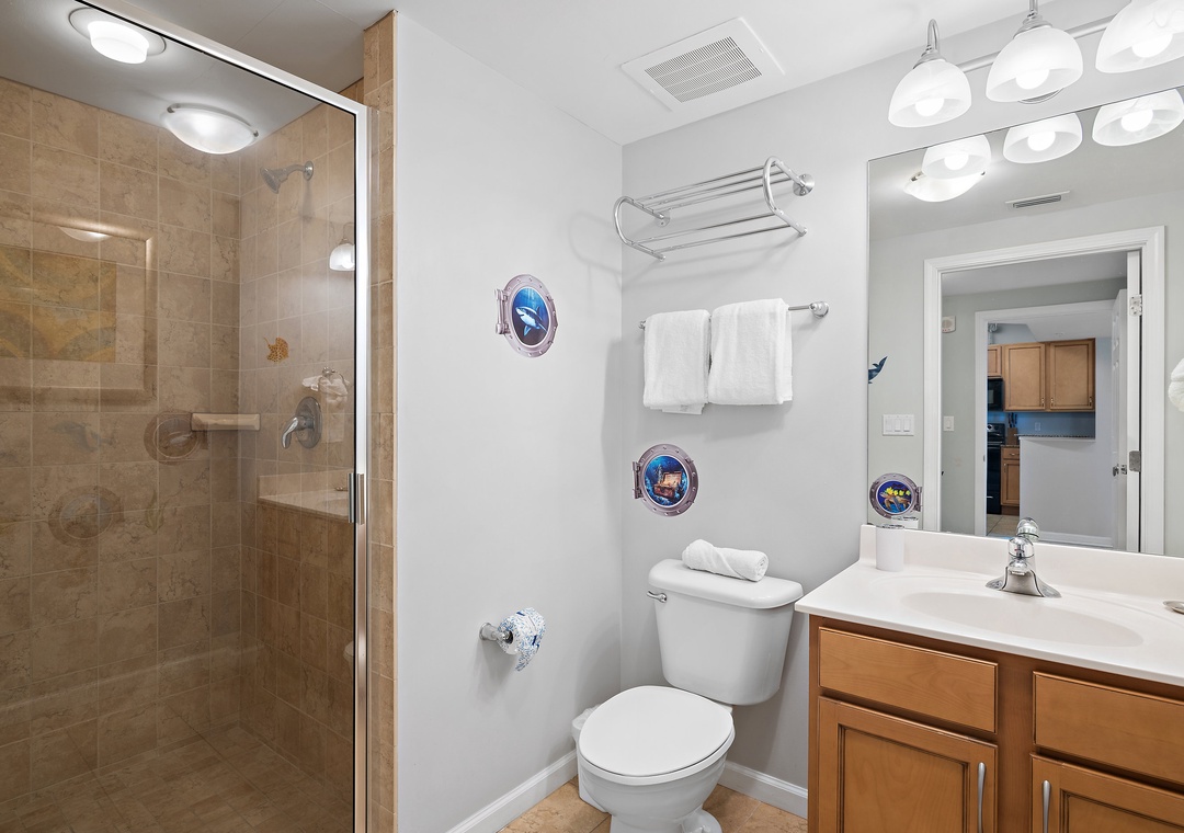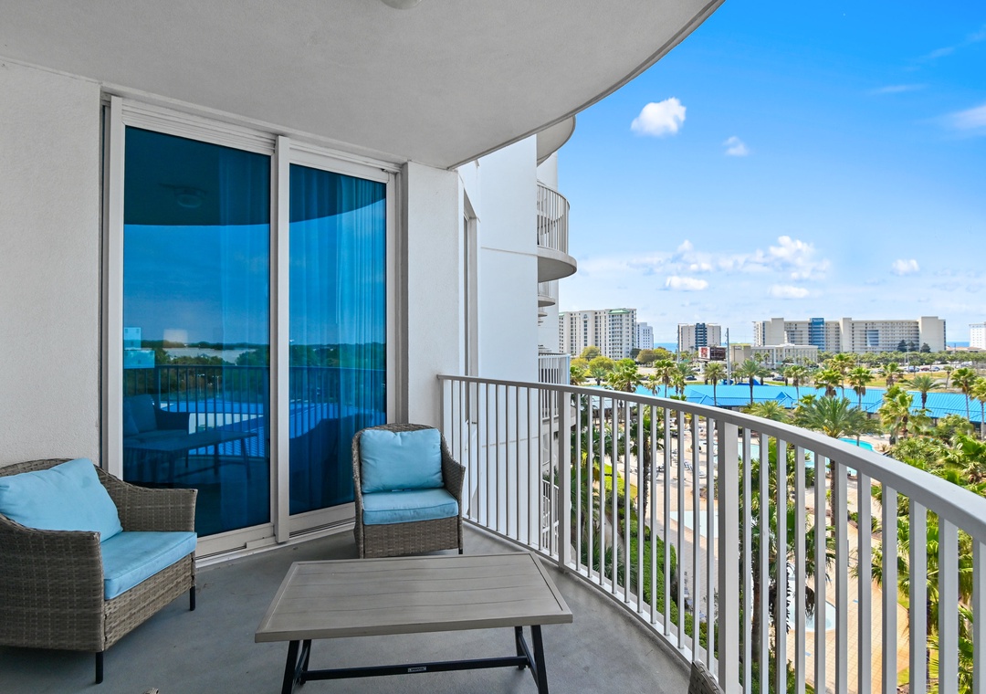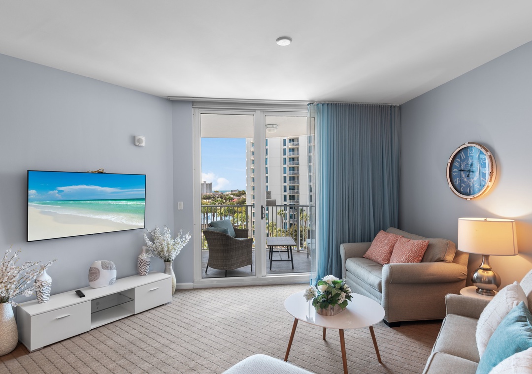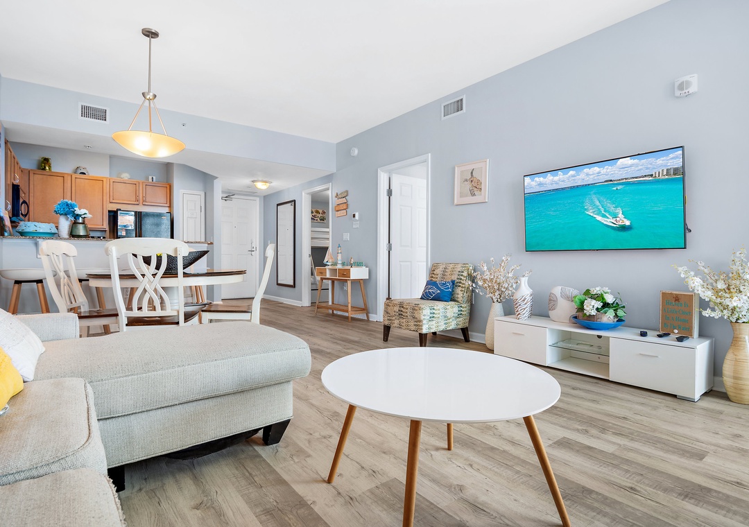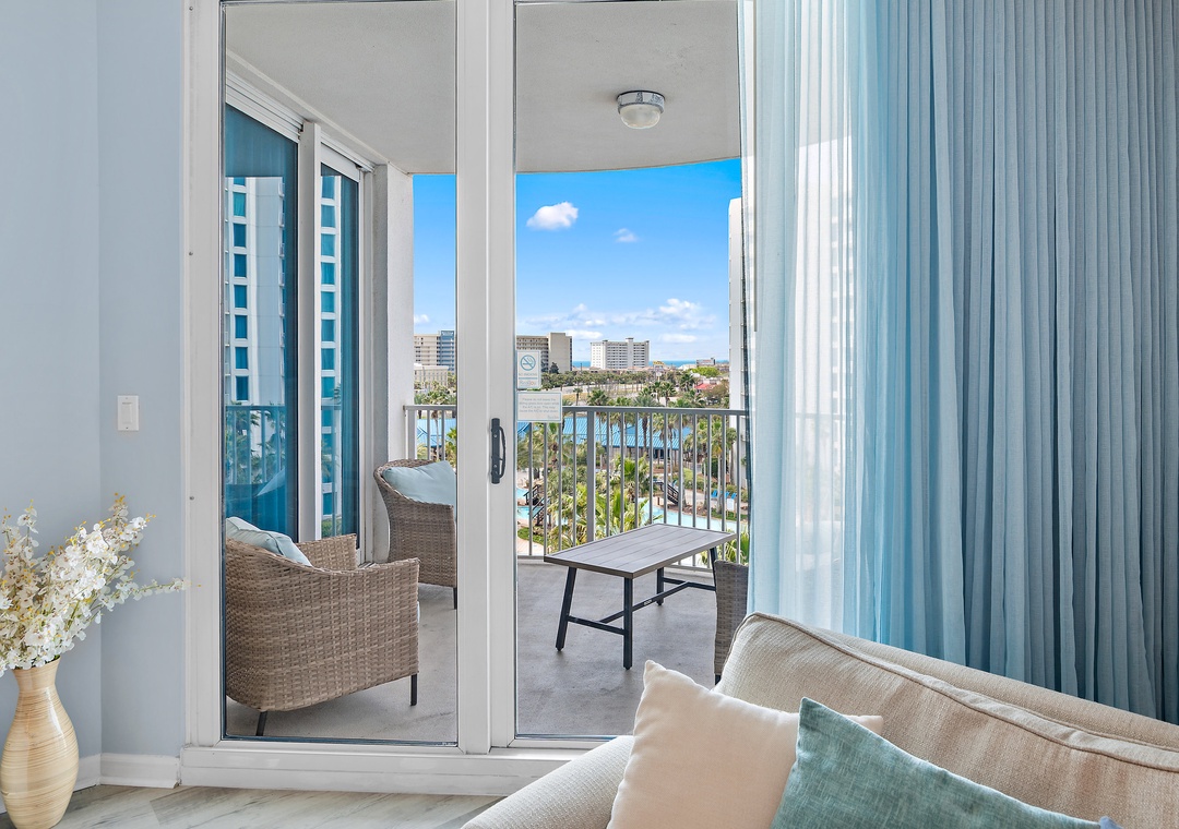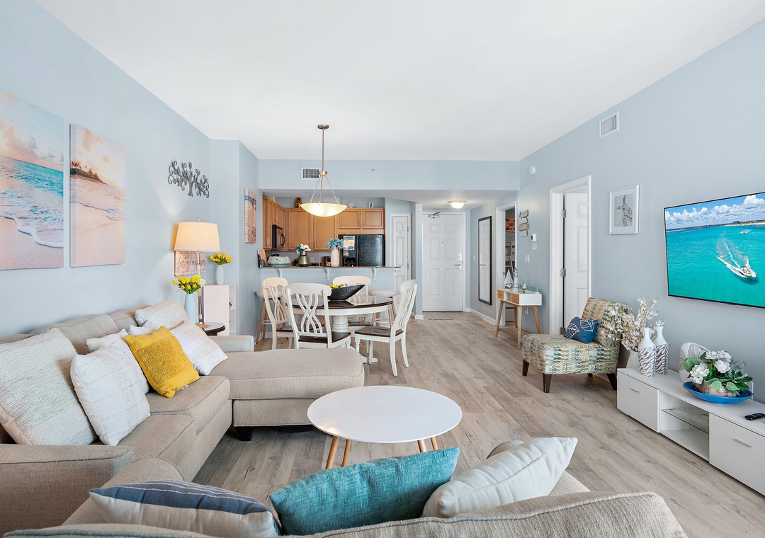 Welcome to Palms Resort #1603! This Junior 2BR/2BA condo features a full-sized master bedroom and a smaller second bedroom, both with private access to full bathrooms—one of which includes a walk-in shower. The master suite offers a king-sized bed and flat-screen TV, while the second bedroom includes a twin-over-full bunk bed, flat-screen TV, and direct bathroom access. For extra sleeping space, there's a twin sleeper sofa in the living room, bringing the total accommodation to 6 guests. The condo is beautifully furnished, with a spacious living area, flat-screen TV, and a private washer and dryer for added convenience. Start your mornings with stunning Gulf views from the expansive balcony and enjoy all the amenities The Palms of Destin has to offer—including the lagoon-style pool. Make Palms Resort #1603 your next vacation retreat!