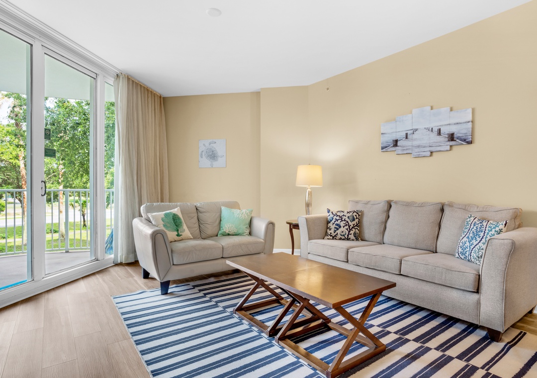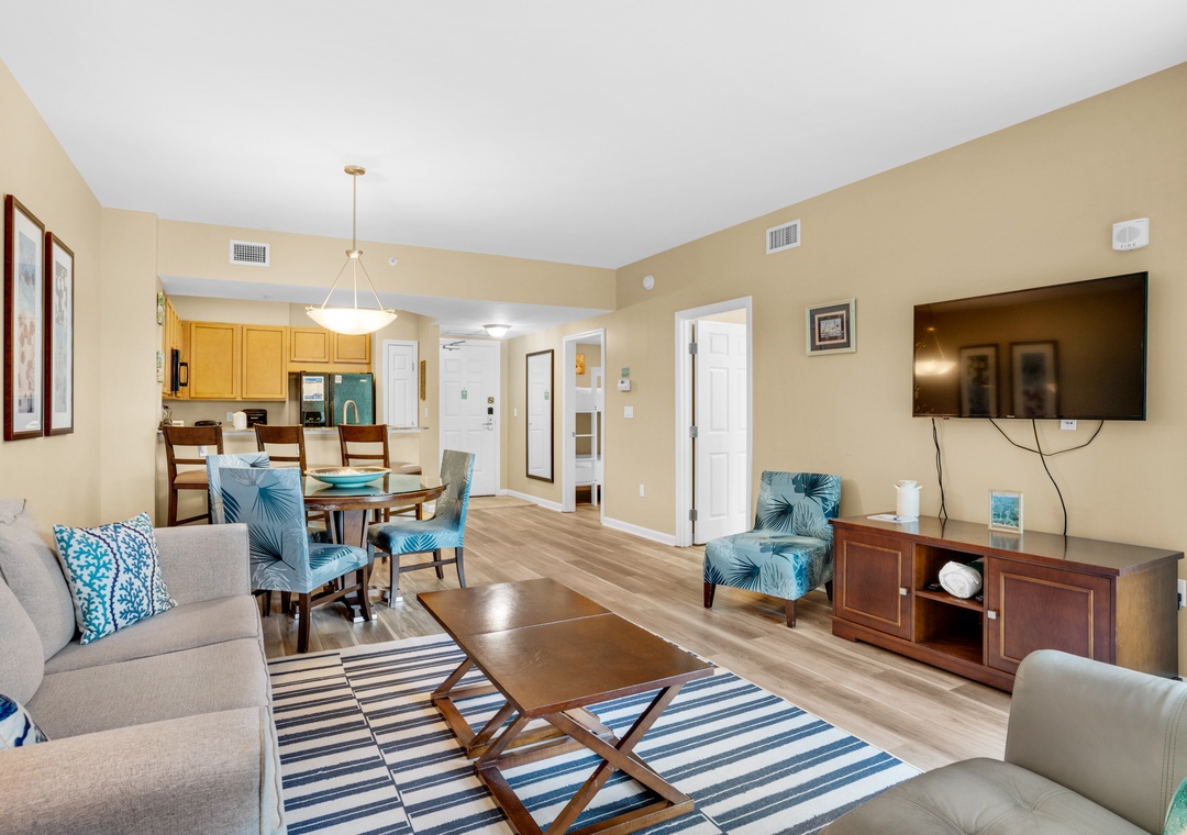 Welcome to The Palms of Destin #2210. This is a beautiful junior 2-bedroom, 2 bathrooms! Offers a king in the master bedroom with balcony and ensuite bathroom access, a smaller guest bedroom with a full over full bunk bed plus direct access to the second bathroom. This condo sleep 6 guests comfortably. A washer/dryer for your convenience, and a spacious living room. All the rooms have flat screen tv's if you want to relax after a long day at the beach. Come enjoy the lagoon pool and all that The Palms of Destin has to offer at Palms Resort #2210.