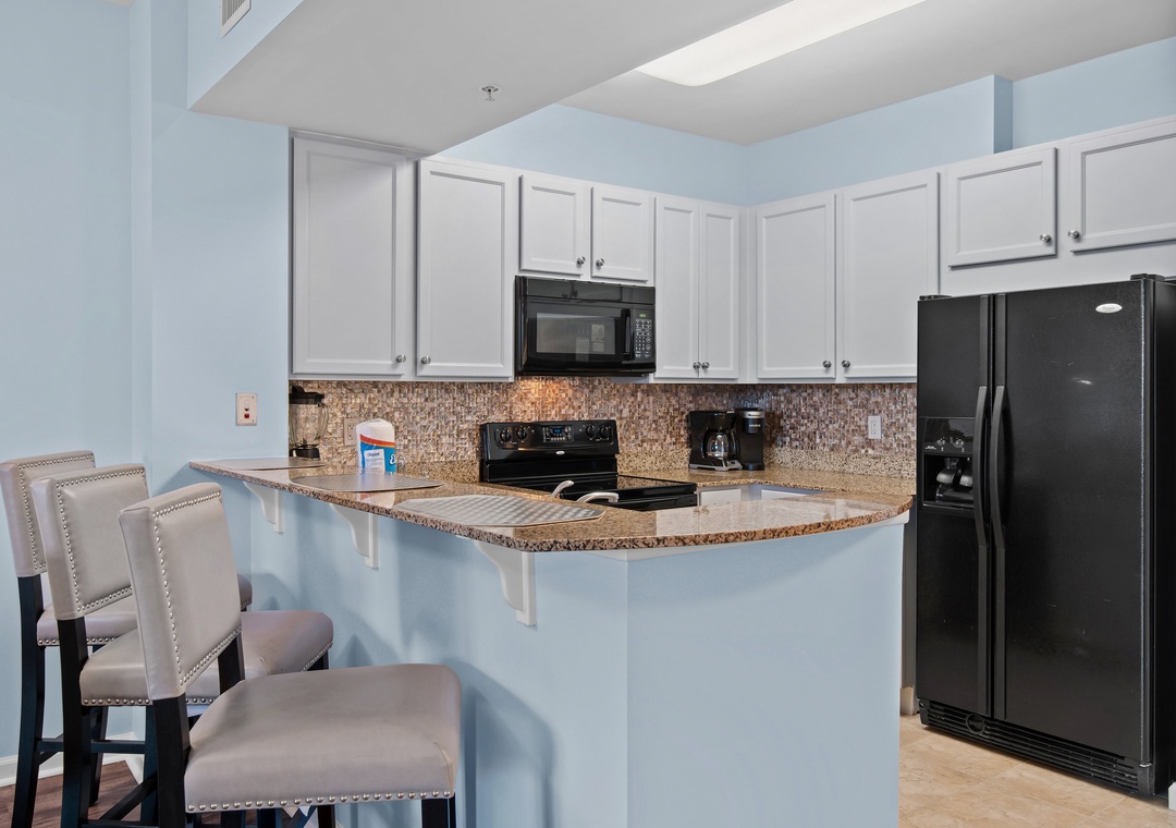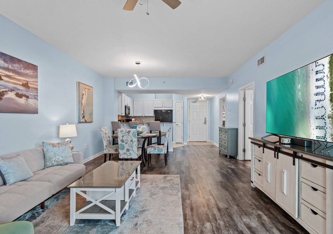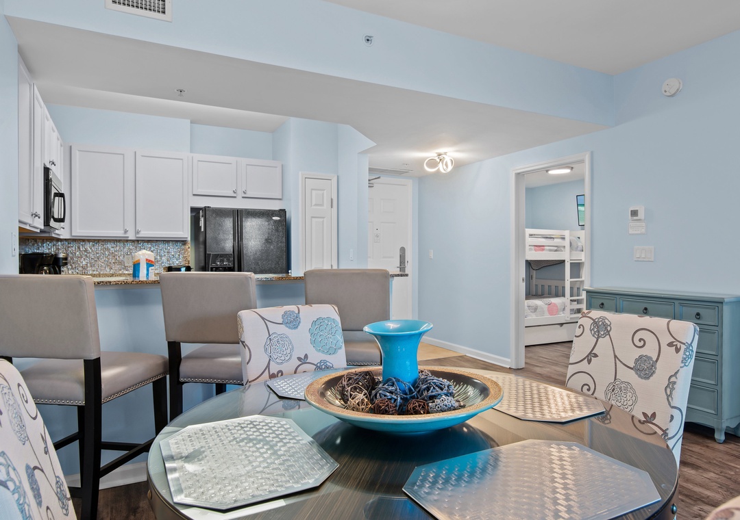 Welcome to Palms Resort #2406! This Junior 2BR/2BA unit offers the perfect blend of comfort and convenience, featuring a spacious master bedroom with a king-sized bed and a private full bathroom with a walk-in shower. The second bedroom is a separate room with a door and includes a twin-over-twin bunk bed—ideal for children or smaller adults—and a TV for added entertainment. You'll also enjoy a second full bathroom, a cozy futon in the living area, and the convenience of an in-unit washer and dryer. For families, we've included a folding crib, highchair, and a rollaway sleeper stored in the closet for your use. Come experience why the fun never stops at Palms Resort #2406!
