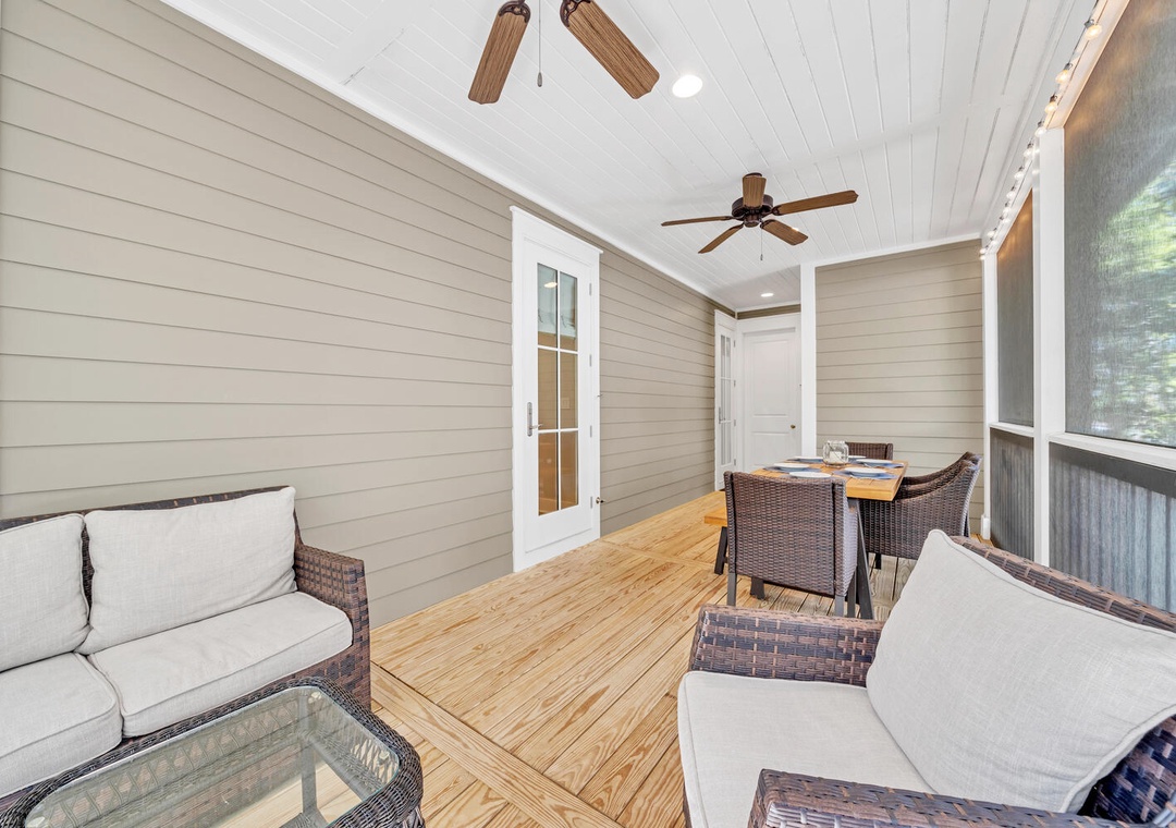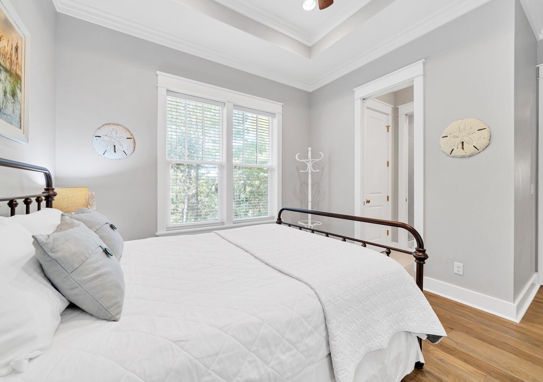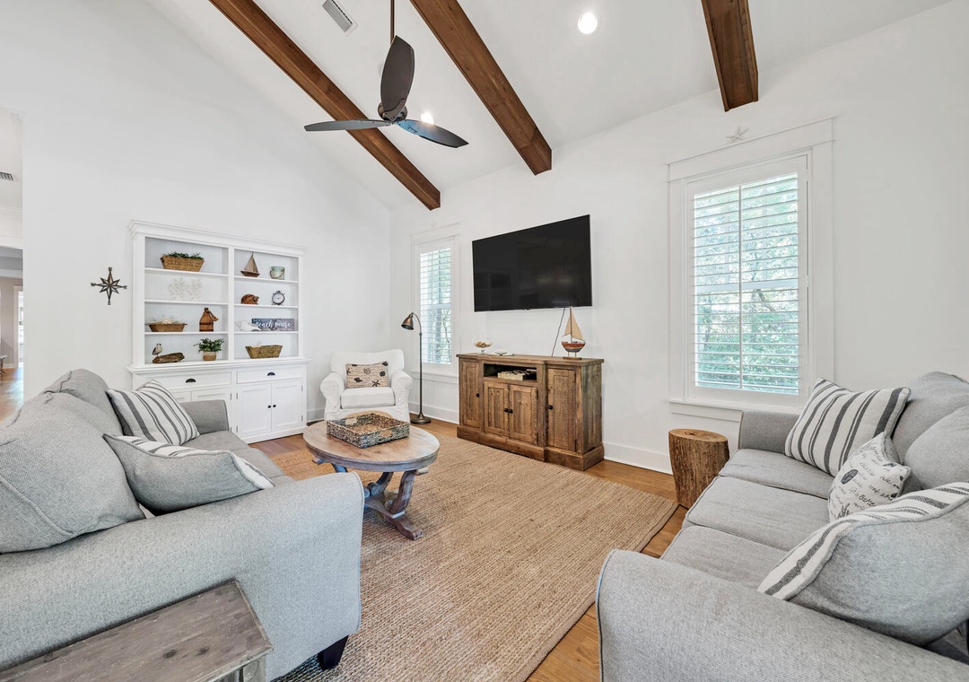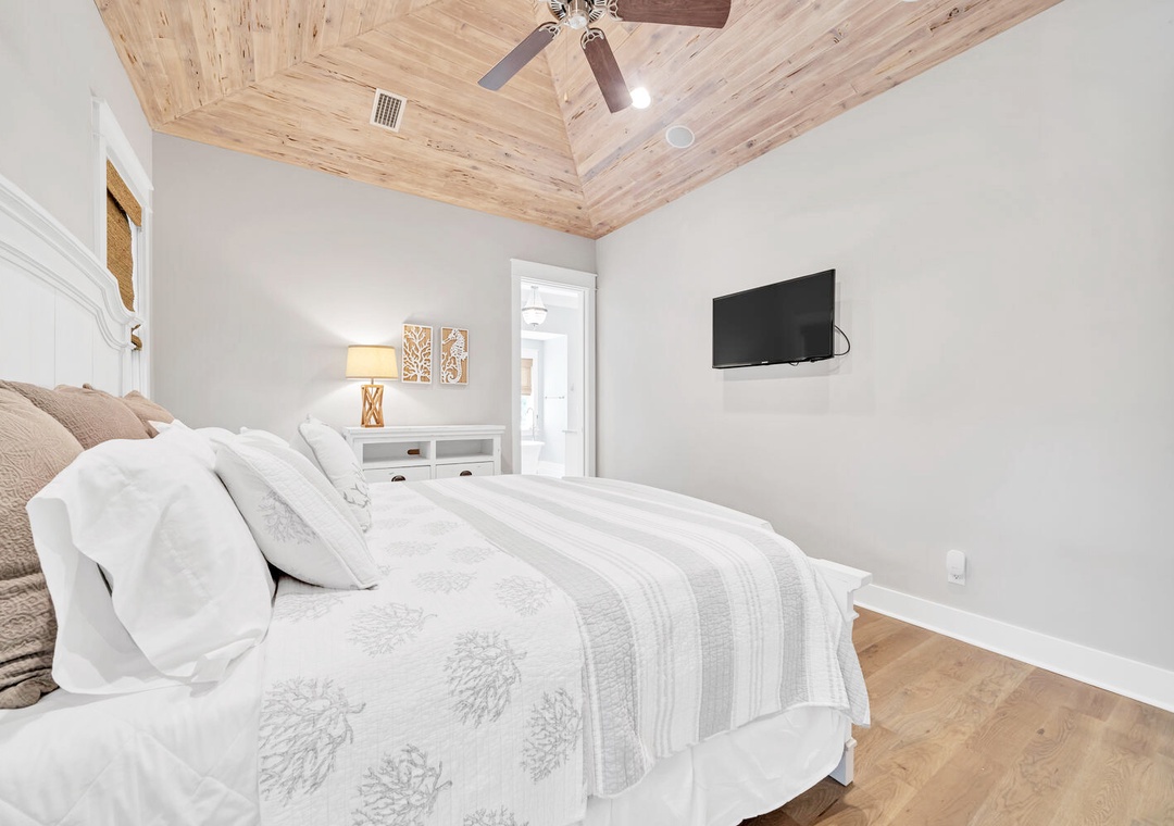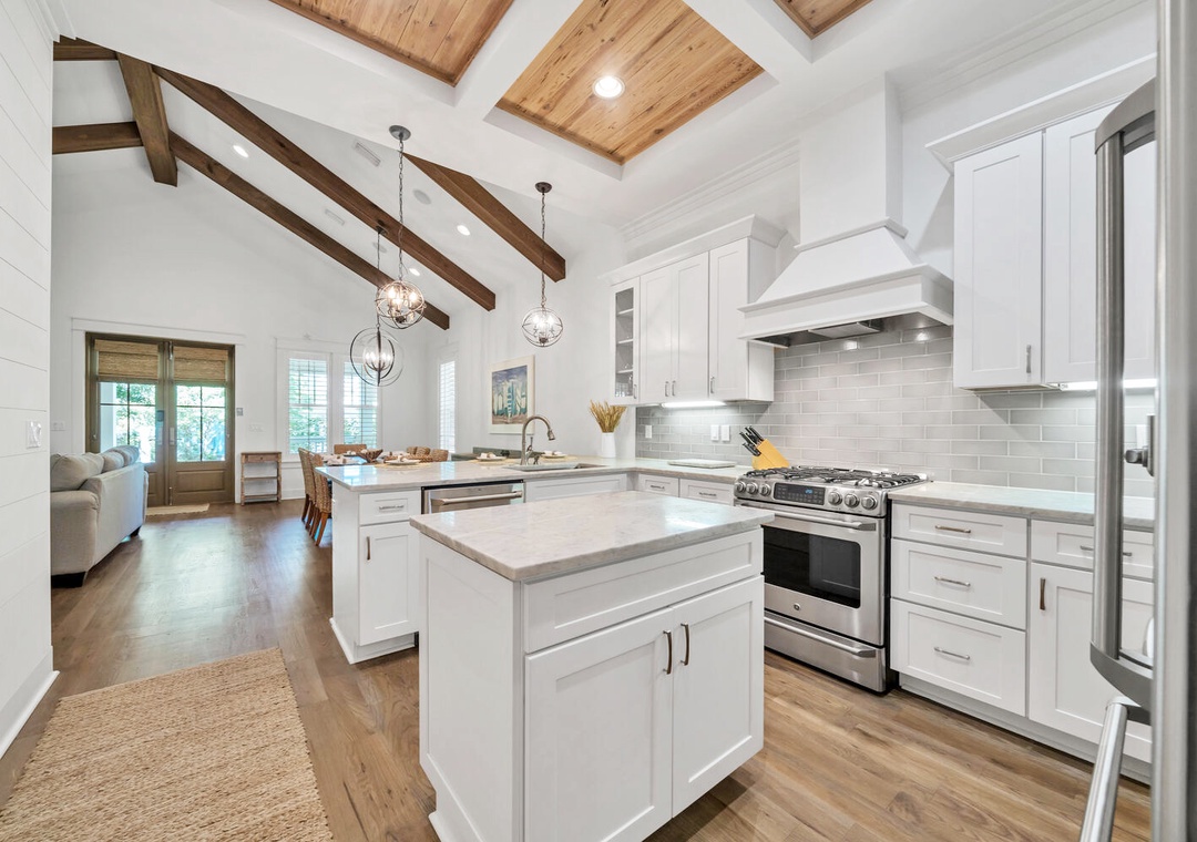 Peaceful Easy Feeling is a beautiful 4 bedroom, 4.5 bath home located in a tranquil setting in Forest Lakes. You will love the serenity of the neighborhood lake that’s surrounded by nature trails. Enjoy your morning coffee surrounded by tall pines from the large covered back patio, then relax in the evening on the covered balcony accessible from either the side entry foyer or master suite. Once you arrive you'll be greeted with soaring 12ft ceilings accented with custom ceiling cross beams and gorgeous hardwood flooring. The bright, white gourmet kitchen will please any chef with its top-of-the-line stainless steel appliances, solid quartz countertops, and upgraded Florida cottage interior trim detail. Sleeping a maximum of 12 guests, there are two queen guest bedrooms and a king master bedroom on the main floor, and an enclosed bunk room down the stairs on the first floor with two twin-over-full bunkbeds, as well as a sofa sleeper in the living area. The king master suite boasts a spacious bathroom with double vanities, a soaking tub, and a separate tile shower.