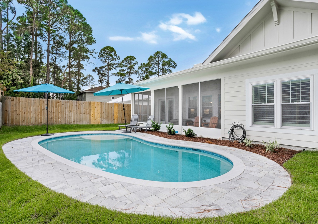 Located on the quiet west end of Panama City Beach with Rosemary-30A to the north, Pearl Flamingo is the perfect home for your next beach vacation getaway. This modern 2 bedroom, 2 bath home and features a brand new private pool (Heated for add'l $40/nt) in the fenced in backyard! You'll have plenty of parking in the spacious driveway and you'll love having your morning cup of coffee on the spacious front porch. The bright, white kitchen is a chef's dream with gorgeous granite countertops and all stainless steel appliances. The open concept living area has loads of natural light and it’s the perfect spot to relax after a day in the sun. Sleeping up to 6 guests comfortably there's a king bed in the master bedroom, two XL twin beds in the guest bedroom, a twin rollaway bed and a sofa sleeping in the living area. Come have the beach vacation of a lifetime at Pearl Flamingo, and see why families come back year after year!
