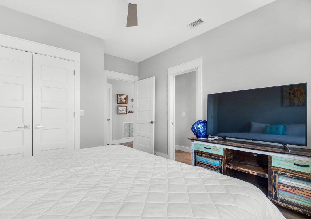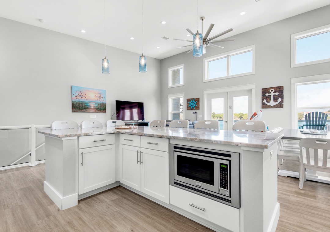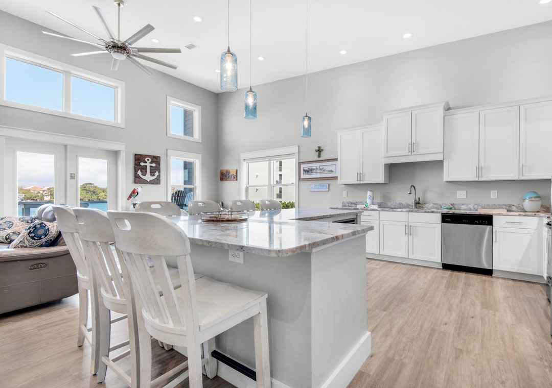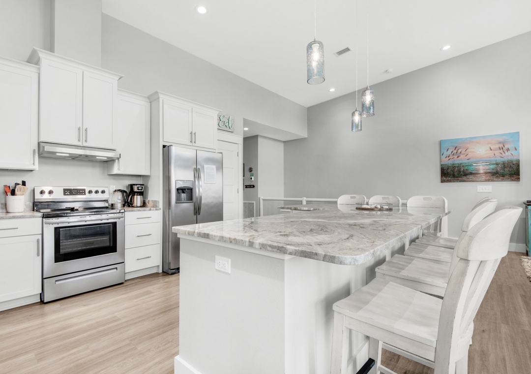 If you are looking for a family-friendly place to call your next home away from home, look no further than Pelican at Sound Side. This beautiful 4 bedroom, 3 bath waterfront townhome is only a short 10 to 20-minute walk to the beach. This property hits the location jackpot! The location is perfect, with easy access to the beach and stunning waterfront views from the balcony and patio. This newly built two story home offers a spacious getaway perfect for spending quality time with family and friends while on vacation! The kitchen is a culinary dream, with everything you need to masterfully create meals. Prepare anything from simple beach snacks to full-course dinners in the well-equipped kitchen with stainless steel appliances and a breakfast bar with four seven counter stools. The oversized pantry is large enough to store with all the items you’ll need for the week and more! The large farmhouse table is great for both dining or an evening of board games. Speaking of games, there are plenty of games to keep everyone entertained!