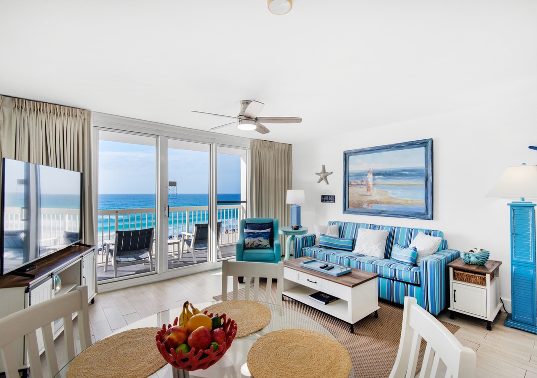 Pelican Beach Resort 505 features stunning Gulf Front Views from your private 5th-floor balcony. This beautifully decorated 1BR/2BA condo comfortably sleeps 6 and offers a fabulous kitchen with stainless appliances and new furnishings. Gaze across the endless Gulf Shoreline from your private beachfront balcony or unwind with your loved ones after a fun day at the beach. The master bedroom has a king-size bed and a private bathroom. A set of twin bunk beds is situated in a niche located in the hallway, positioned just next to the unit's second full bath for easy access. There is also a queen sleeper sofa and a 65' TV in the living room. Make Pelican Beach Resort 505 your next beach destination and find out why this is a Destin vacation favorite!