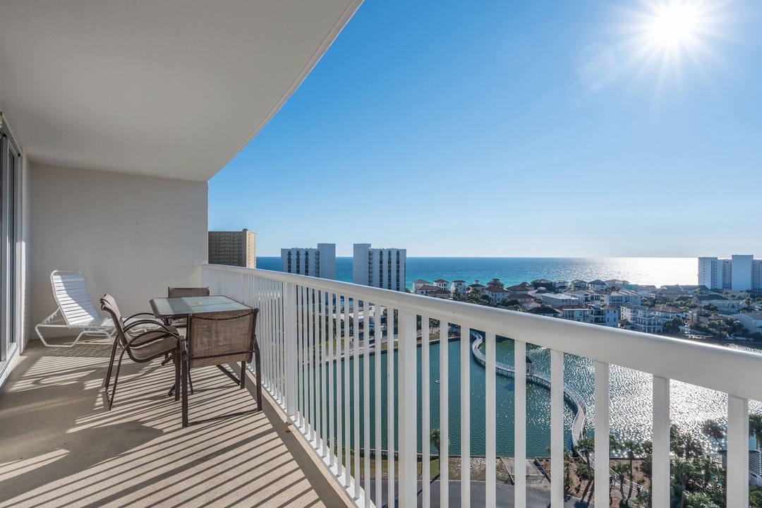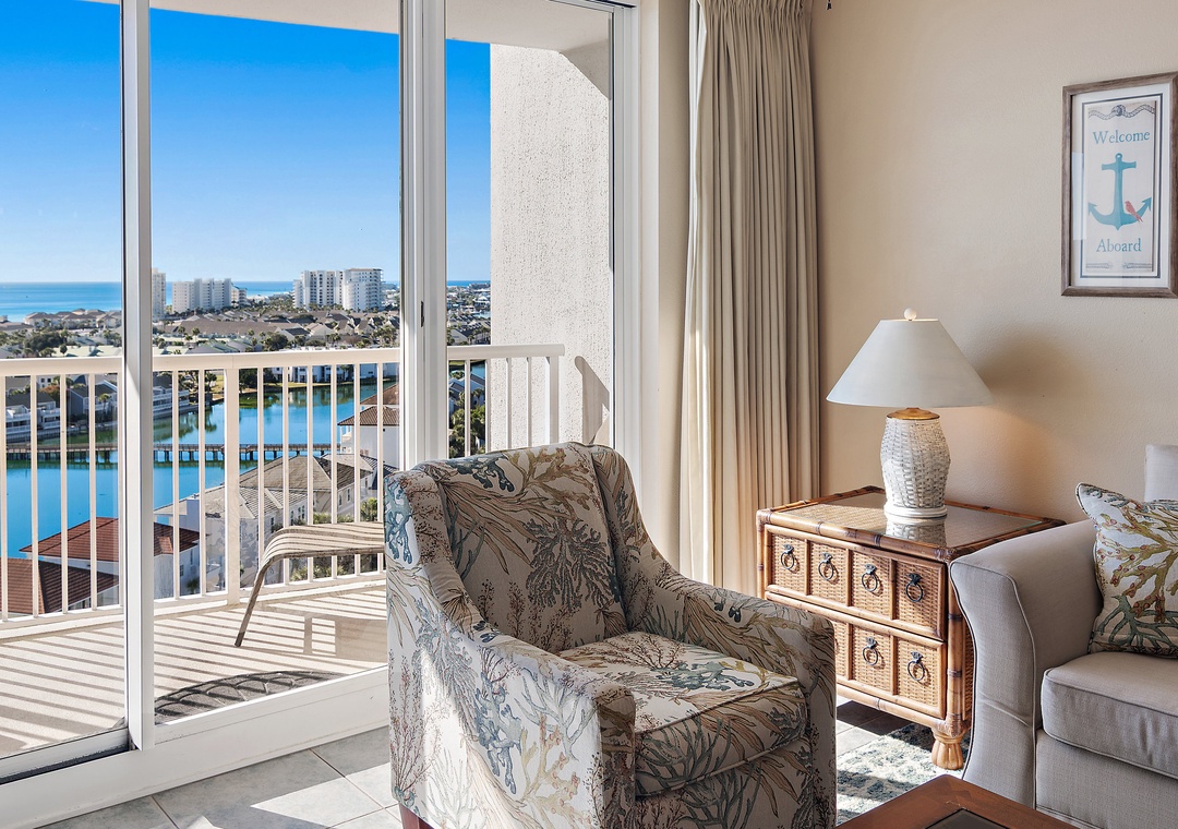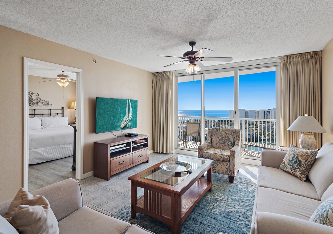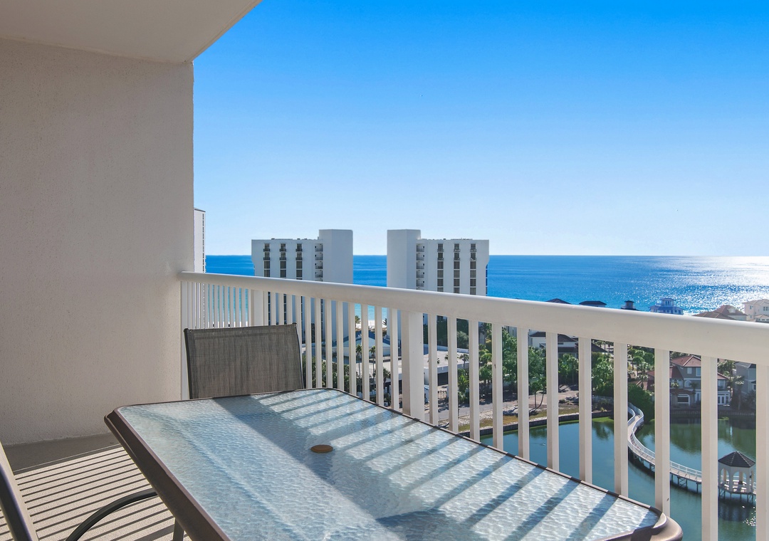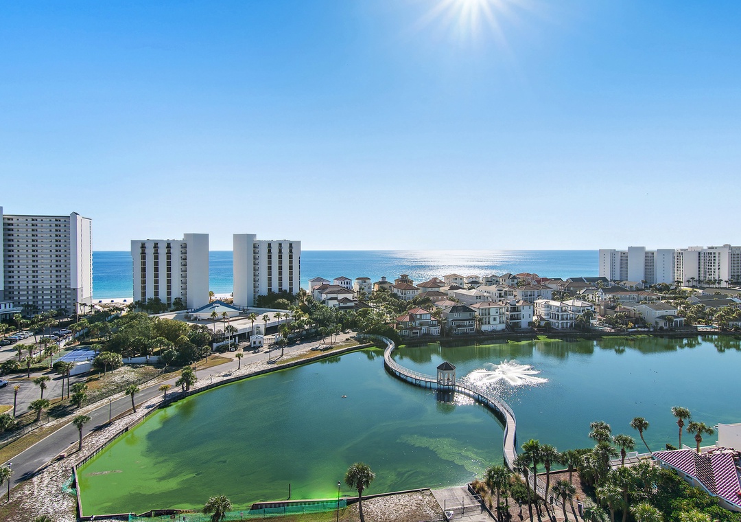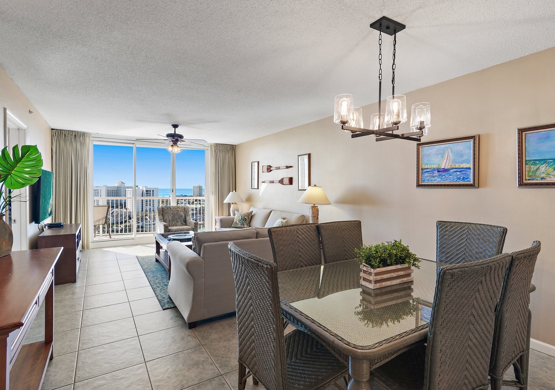 Welcome to Pelican Beach Terrace 1203! This beautifully renovated 2-bedroom, 2-bathroom condo on the 12th floor offers stunning panoramic views of the Gulf of Mexico, Destin Harbor, and East Pass. Step out onto your private, furnished balcony, accessible from both the master bedroom and the living room, and take in breathtaking sunsets over the water. Inside, the modern kitchen features elegant countertops, a breakfast bar island, and a dining area with seating for six—perfect for gathering with family and friends. The master suite boasts a comfortable king bed, while the guest bedroom offers a twin-over-double bunk. A queen sleeper sofa in the living room allows the condo to sleep up to six guests comfortably. For your convenience, a washer and dryer are located in the unit. Outside, enjoy the resort-style amenities including three swimming pools, a kiddie pool, two hot tubs, fitness rooms, and a tennis court. Fire up the grill at the outdoor BBQ area for a fun family cookout. Come experience why the fun never ends at Pelican Beach Terrace 1203, your perfect Destin getaway awaits!