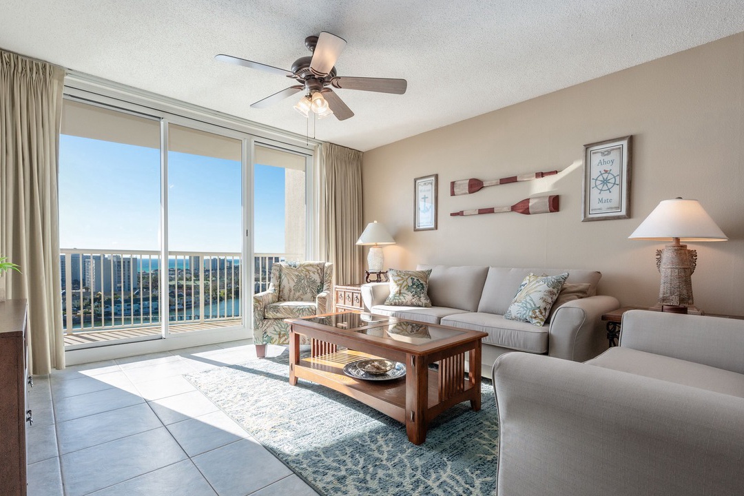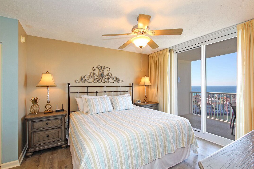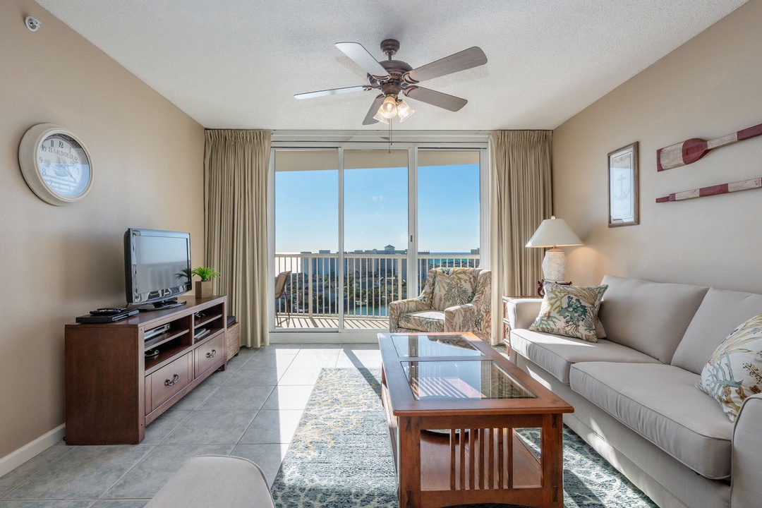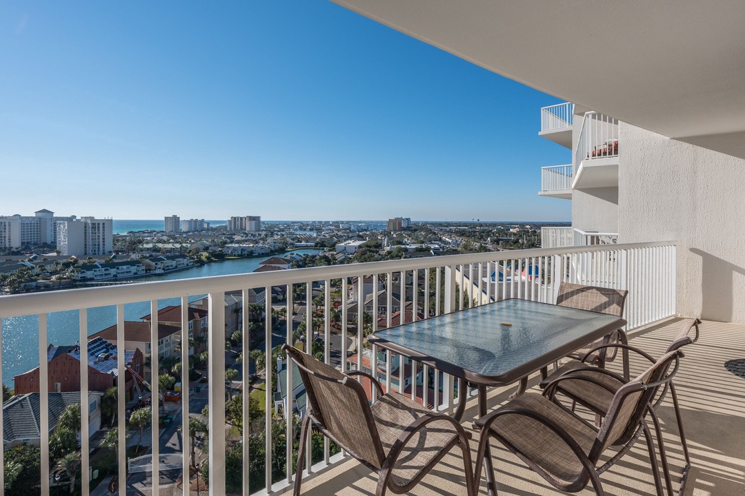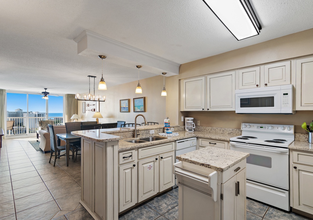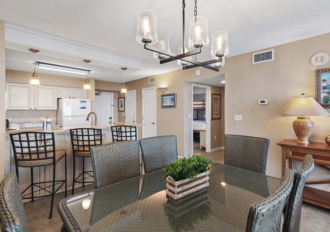 Welcome to Pelican Beach Terrace 1203! This beautifully renovated 2-bedroom, 2-bathroom condo on the 12th floor offers stunning panoramic views of the Gulf of Mexico, Destin Harbor, and East Pass. Step out onto your private, furnished balcony, accessible from both the master bedroom and the living room, and take in breathtaking sunsets over the water. Inside, the modern kitchen features elegant countertops, a breakfast bar island, and a dining area with seating for six—perfect for gathering with family and friends. The master suite boasts a comfortable king bed, while the guest bedroom offers a twin-over-double bunk. A queen sleeper sofa in the living room allows the condo to sleep up to six guests comfortably. For your convenience, a washer and dryer are located in the unit. Outside, enjoy the resort-style amenities including three swimming pools, a kiddie pool, two hot tubs, fitness rooms, and a tennis court. Fire up the grill at the outdoor BBQ area for a fun family cookout. Come experience why the fun never ends at Pelican Beach Terrace 1203, your perfect Destin getaway awaits!
