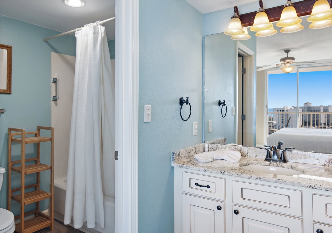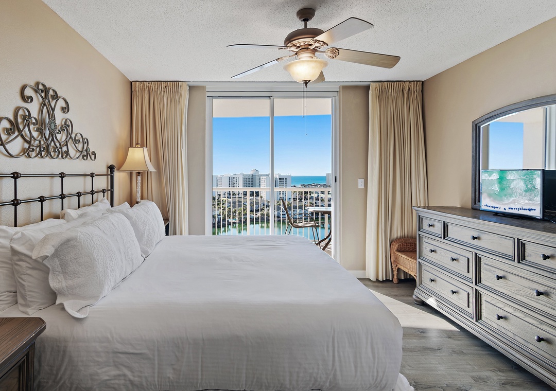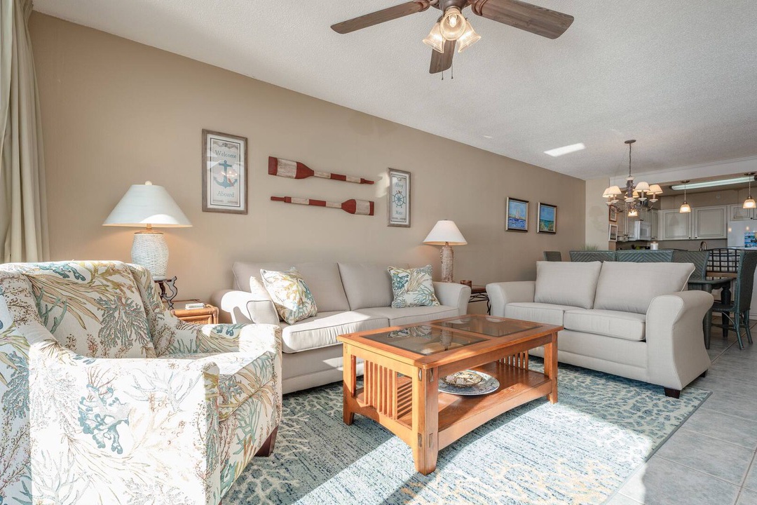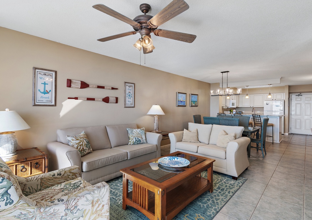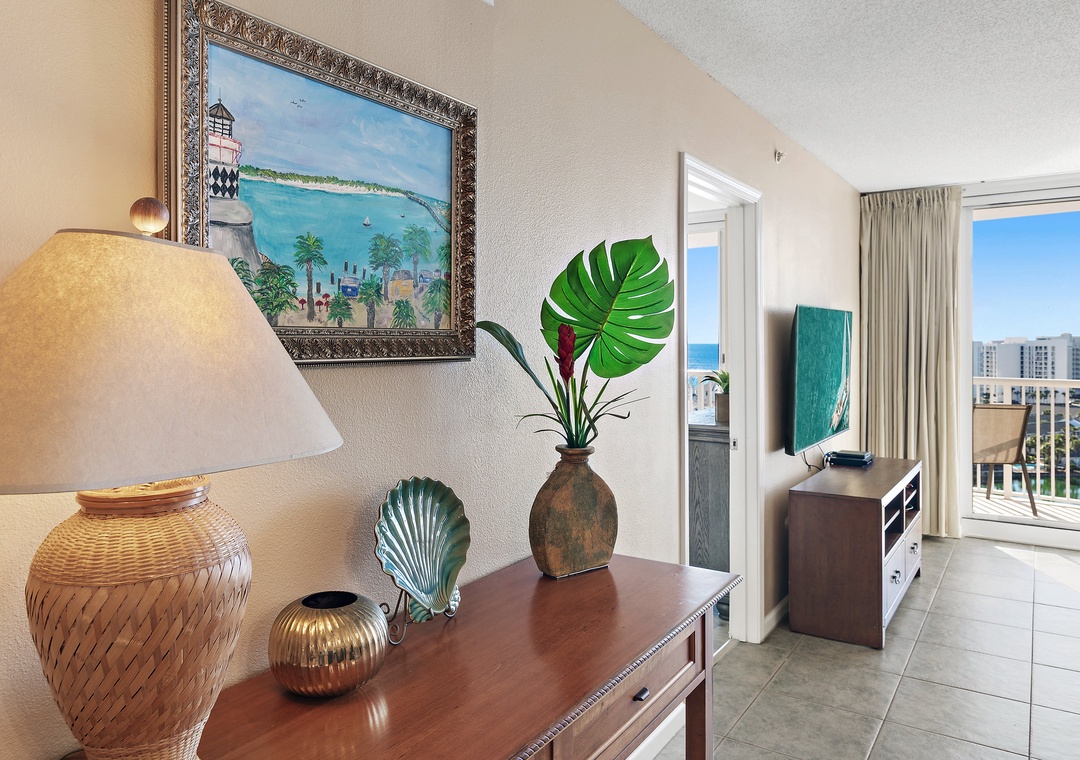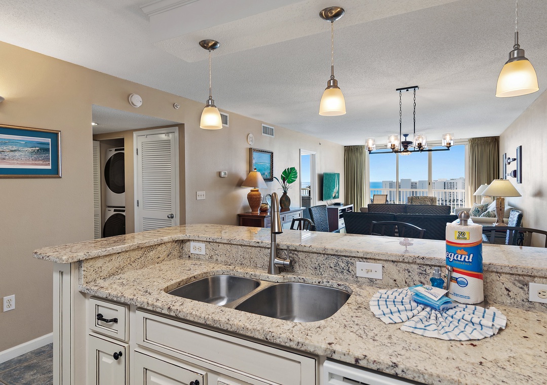 Welcome to Pelican Beach Terrace 1203! This beautifully renovated 2-bedroom, 2-bathroom condo on the 12th floor offers stunning panoramic views of the Gulf of Mexico, Destin Harbor, and East Pass. Step out onto your private, furnished balcony, accessible from both the master bedroom and the living room, and take in breathtaking sunsets over the water. Inside, the modern kitchen features elegant countertops, a breakfast bar island, and a dining area with seating for six—perfect for gathering with family and friends. The master suite boasts a comfortable king bed, while the guest bedroom offers a twin-over-double bunk. A queen sleeper sofa in the living room allows the condo to sleep up to six guests comfortably. For your convenience, a washer and dryer are located in the unit. Outside, enjoy the resort-style amenities including three swimming pools, a kiddie pool, two hot tubs, fitness rooms, and a tennis court. Fire up the grill at the outdoor BBQ area for a fun family cookout. Come experience why the fun never ends at Pelican Beach Terrace 1203, your perfect Destin getaway awaits!