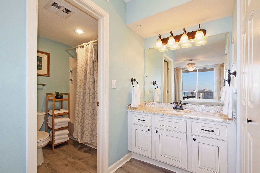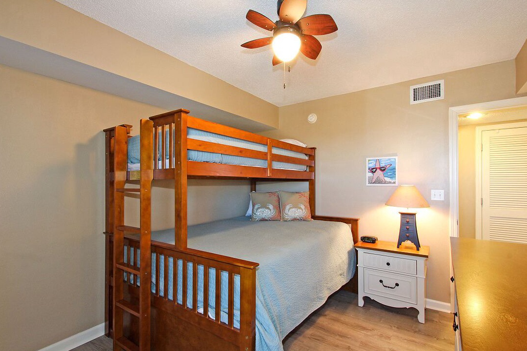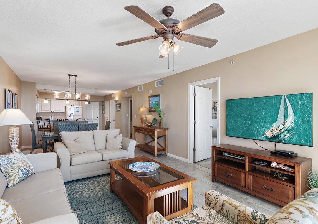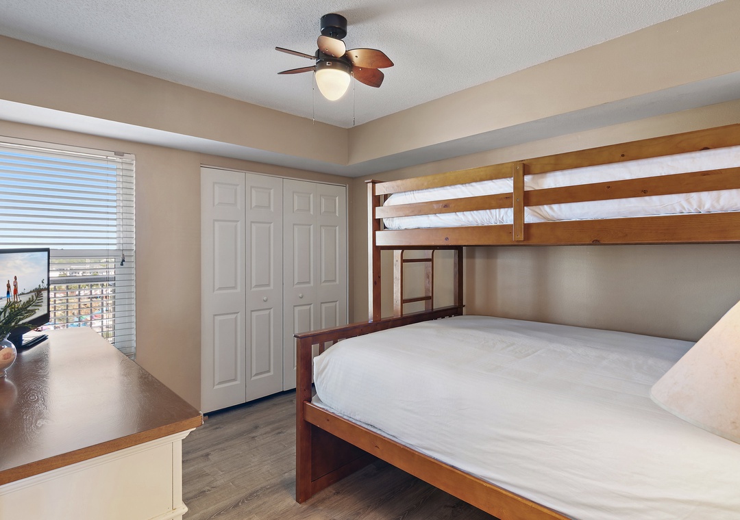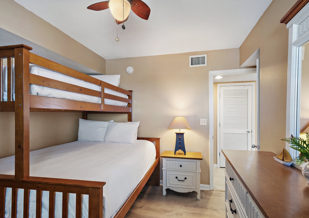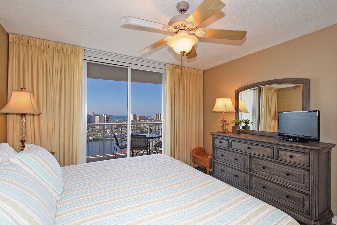Welcome to Pelican Beach Terrace 1203! This beautifully renovated 2-bedroom, 2-bathroom condo on the 12th floor offers stunning panoramic views of the Gulf of Mexico, Destin Harbor, and East Pass. Step out onto your private, furnished balcony, accessible from both the master bedroom and the living room, and take in breathtaking sunsets over the water. Inside, the modern kitchen features elegant countertops, a breakfast bar island, and a dining area with seating for six—perfect for gathering with family and friends. The master suite boasts a comfortable king bed, while the guest bedroom offers a twin-over-double bunk. A queen sleeper sofa in the living room allows the condo to sleep up to six guests comfortably. For your convenience, a washer and dryer are located in the unit. Outside, enjoy the resort-style amenities including three swimming pools, a kiddie pool, two hot tubs, fitness rooms, and a tennis court. Fire up the grill at the outdoor BBQ area for a fun family cookout. Come experience why the fun never ends at Pelican Beach Terrace 1203, your perfect Destin getaway awaits!