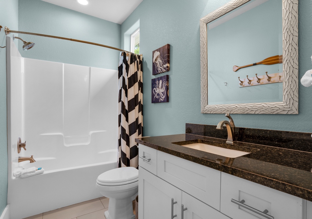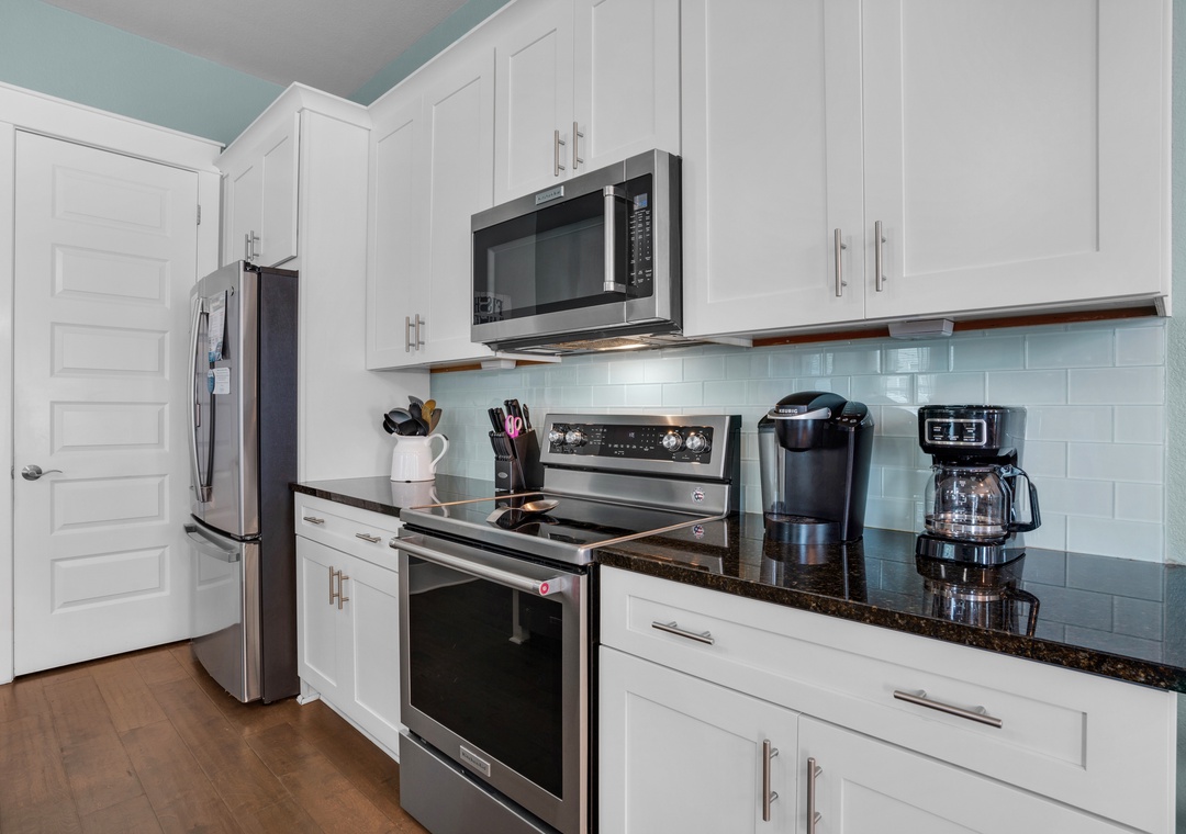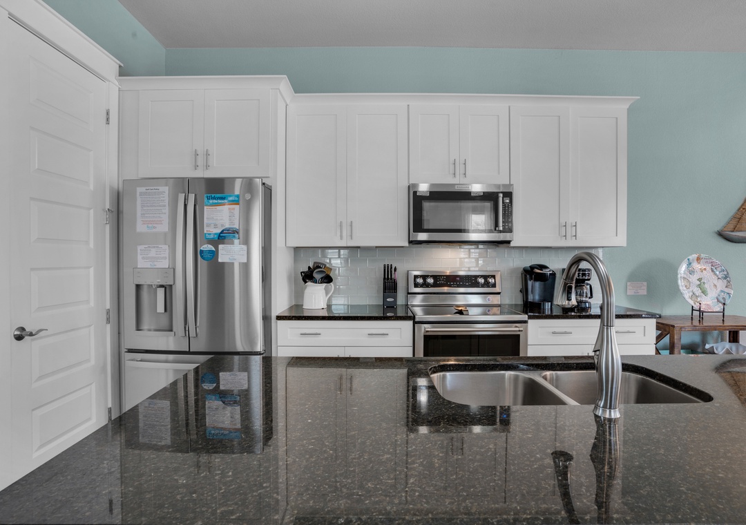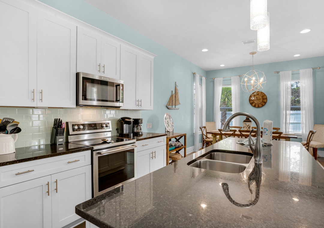Penelope Palms is a 4 bedroom, 4 bathroom home that is beautifully furnished; complete with a fully up-to-date kitchen, dark hardwood floors, granite countertops, stainless steel appliances, washer/dryer, and parking for up to 4 vehicles. With 3 king beds and two sets of Full over Full Bunk Beds, this home sleeps up to 12 guests comfortably! The home is equipped with all Roku TV's for your entertainment and enjoyment. A 6-Seater Low Speed Vehicle (LSV) is available for an additional fee to make your trips to the beach ultra-convenient! This well-appointed planned community is within walking distance to the Beach(approximately 1250 yards) and Community pool. This home is sure to give you the perfect beach experience!