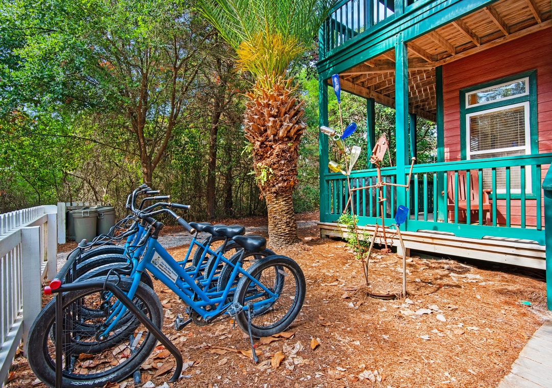 Very funky and cool home just a block from public beach access a an easy walk to food trucks, restaurants, shops and more and Watercolor. We especially liked the cool shade of the trees around the property, the outdoor spaces, and the complimentary bicycles. We will look for this place next time we visit.- Reviewed On: 4/25/2021