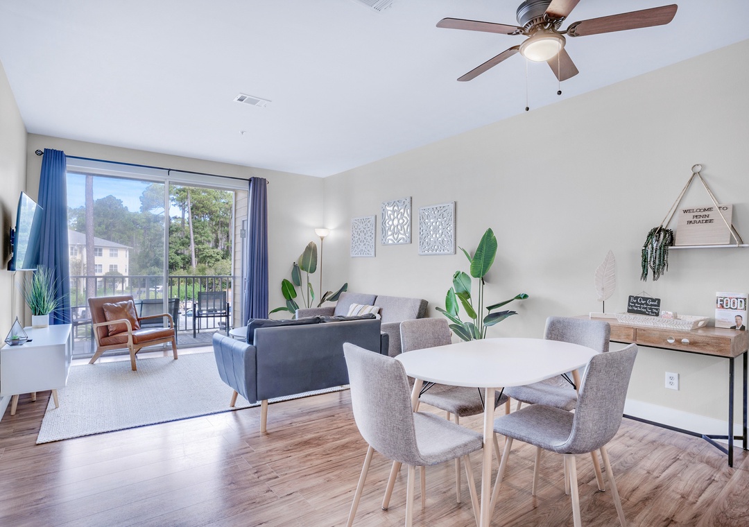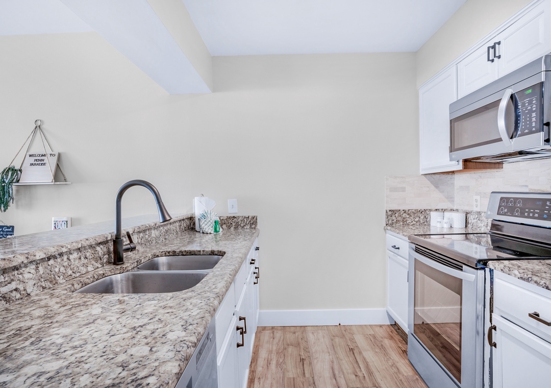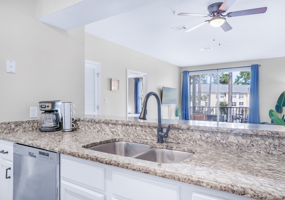 Penn's Paradise is a perfect getaway at the Pointe of View Condominiums. This chic, updated 2BR/2BA condo is located on the 2nd floor and has serene views of the pond from the private balcony. There is plenty of room to relax in the cozy living room which is adjacent to the dining area, complete with a table for 4 and an additional 4 seats at the eat-in bar. The kitchen is well-appointed with stainless steel appliances and granite counters. There is even a washer/dryer in the unit for your convenience! The Master bedroom has a king bed with an ensuite bathroom. Additionally, there is a guest bedroom with a full over full bunk bed and a futon in the living room, allowing this condo to have sleeping accommodations for 8 guests although the maximum occupancy is 7. This location can't be beaten, with multiple beach access points within a short drive, and fabulous shopping and dining options at Grand Boulevard within walking distance. Penn's Paradise will truly become your next paradise vacation!
