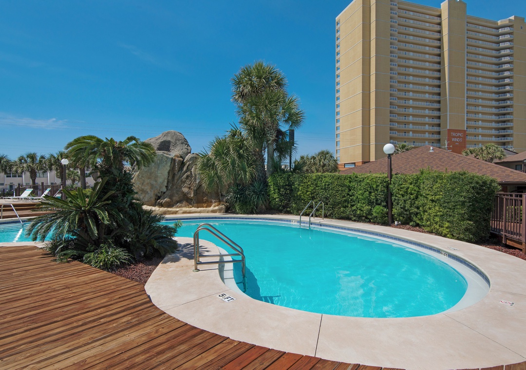 Located only 3 miles from Pier Park, Portside Resort sits on 16 acres and offers easy beach access right across the street. So, you will find sugar-white sands and emerald waters only a short walk away. This complex has 3 community pools on site (one seasonally heated), 3 tennis courts, a shuffleboard area, a hot tub, and a clubhouse. Being on the quiet west end and covered in beautiful palm trees and peaceful landscaping, Portside Resort is idyllic for families seeking a calm, relaxing beach experience.