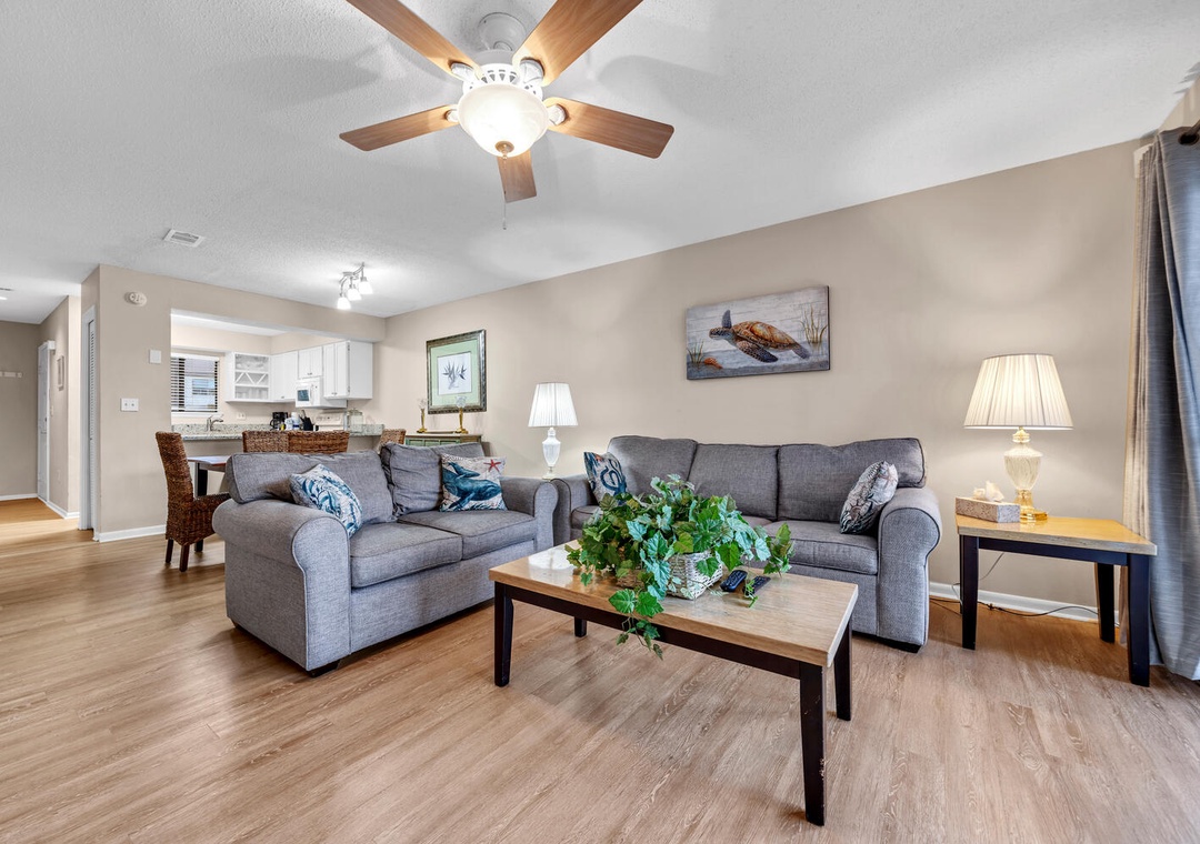 Welcome to Portside P6, a beautiful 2 bedroom, 1.5 bathroom townhome located in the quiet west end of Panama City Beach. Nestled within Portside Resort, this townhome has access to loads of amenities including 3 community pools, 3 tennis courts, shuffleboard areas, and more. On the first floor, you will find an open kitchen, living and dining area filled with natural light from a large sliding glass doors that lead to the covered patio. The kitchen is fully equipped and there is plenty of seating in the dining area. There are sleeping arrangements for 7 people with a queen bedroom bedroom, a twin-over full bunkbed in the second bedroom, and a sleeper sofa in the living area downstairs. You'll love the balcony on the second floor which is the perfect spot to catch the Florida sunset. Come make Portside P6 your family vacation tradition, the beach it waiting!
