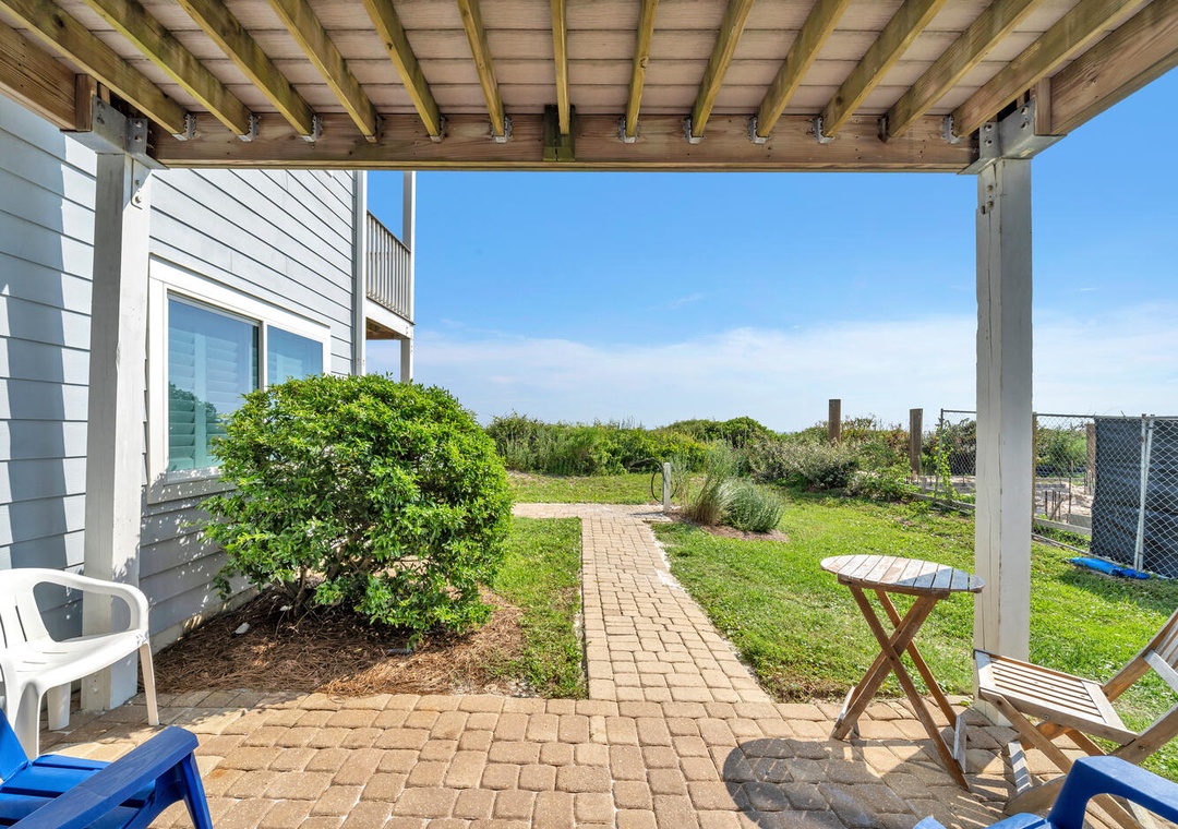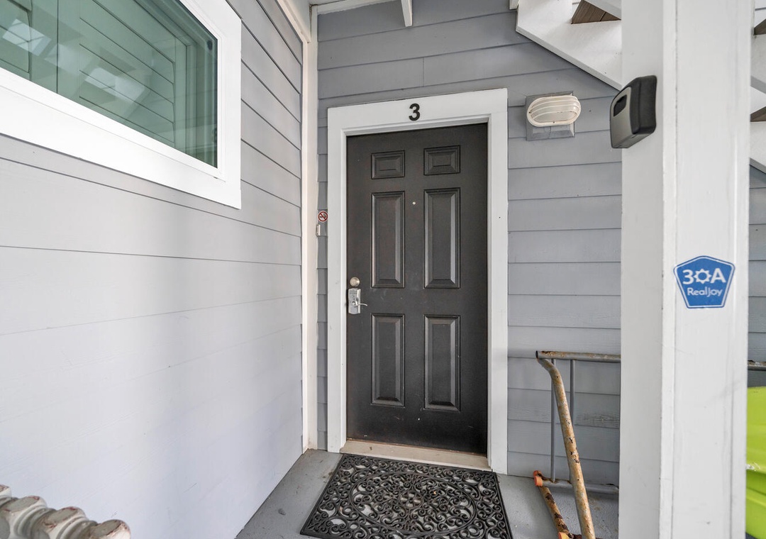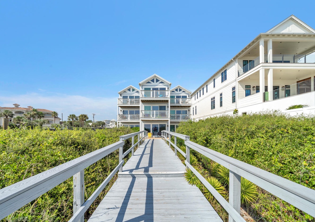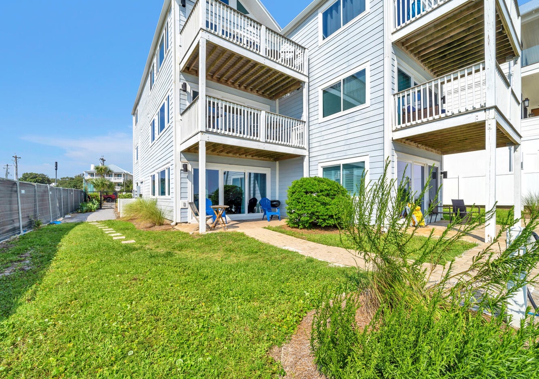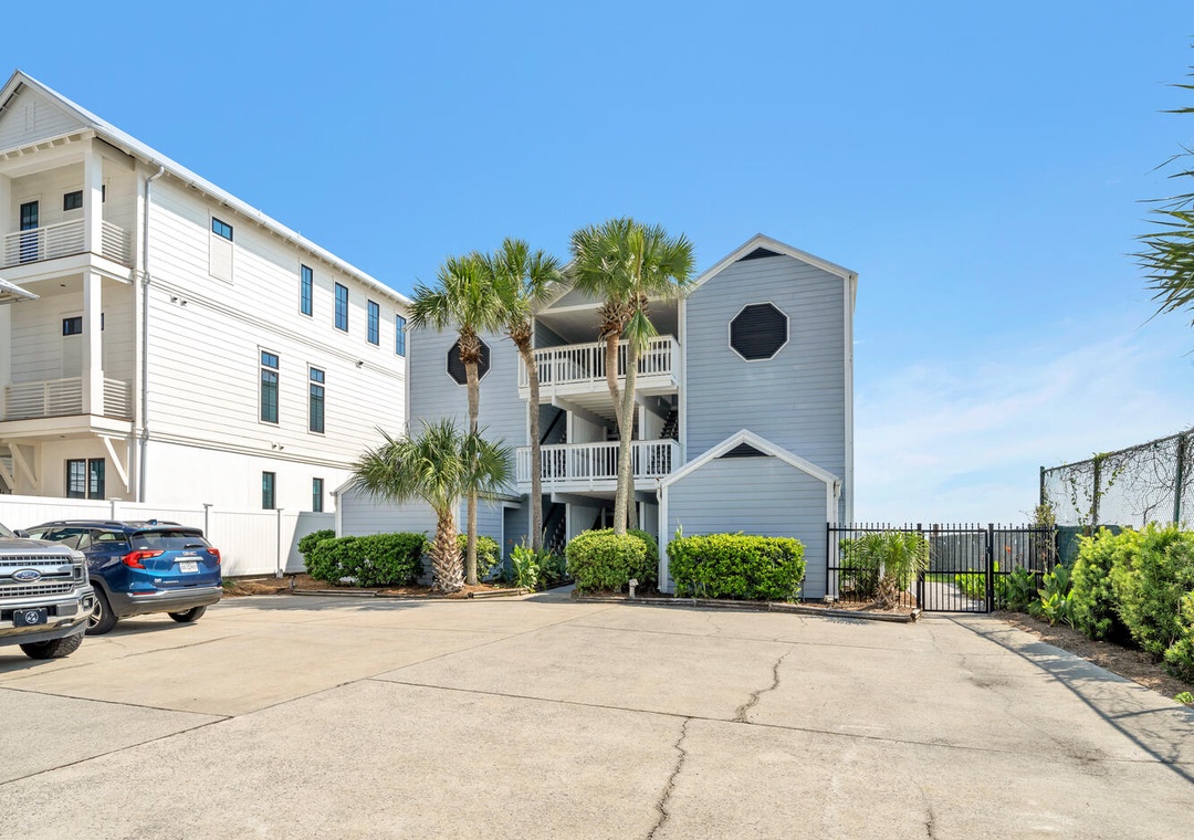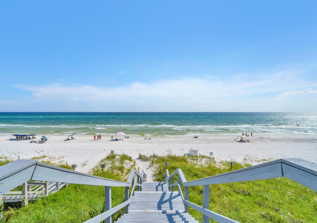 The beach was private, rarely crowded. You can walk directly out the sliding back door and onto the boardwalk/steps to get to the beach. The 2nd and 3rd floor units have to use a side gate (which was not secured during our stay) and walk beside this unit to access the beach. So there was some noise and lack of privacy, the window treatments on that side of the unit could be improved. The bedroom stays very bright and I would have loved blackout curtains on that wall!