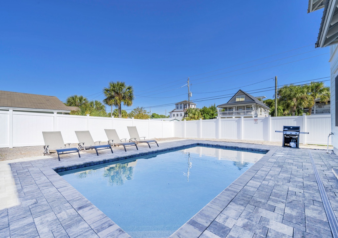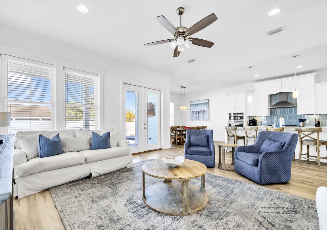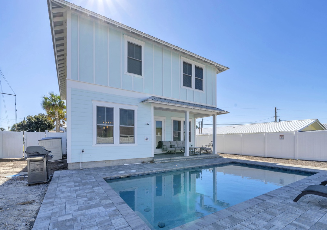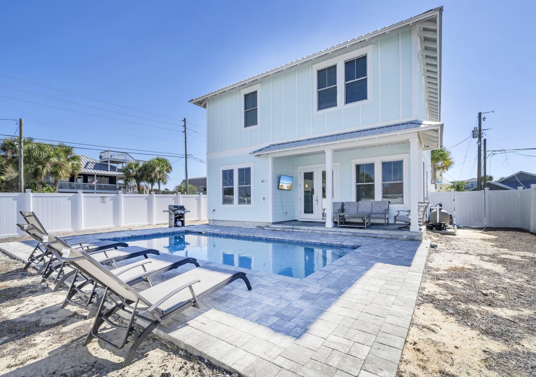 Welcome to Salty Blue, a beautifully designed and fully furnished vacation home, perfect for large families or groups. This spacious getaway features 6 bedrooms, including 2 built-in bunk rooms that are great for the kids. Step outside to enjoy your own private pool, a spacious covered patio, outdoor shower, and grill area, perfect for soaking up the Florida sunshine. Inside, the bright and airy great room features tall windows, 8-foot French doors, and stylish coastal decor. The main living area includes two sitting spaces: one for movie nights or sports, and another for quieter moments. A large dining area with shiplap walls and custom lighting makes gathering for meals a joy.