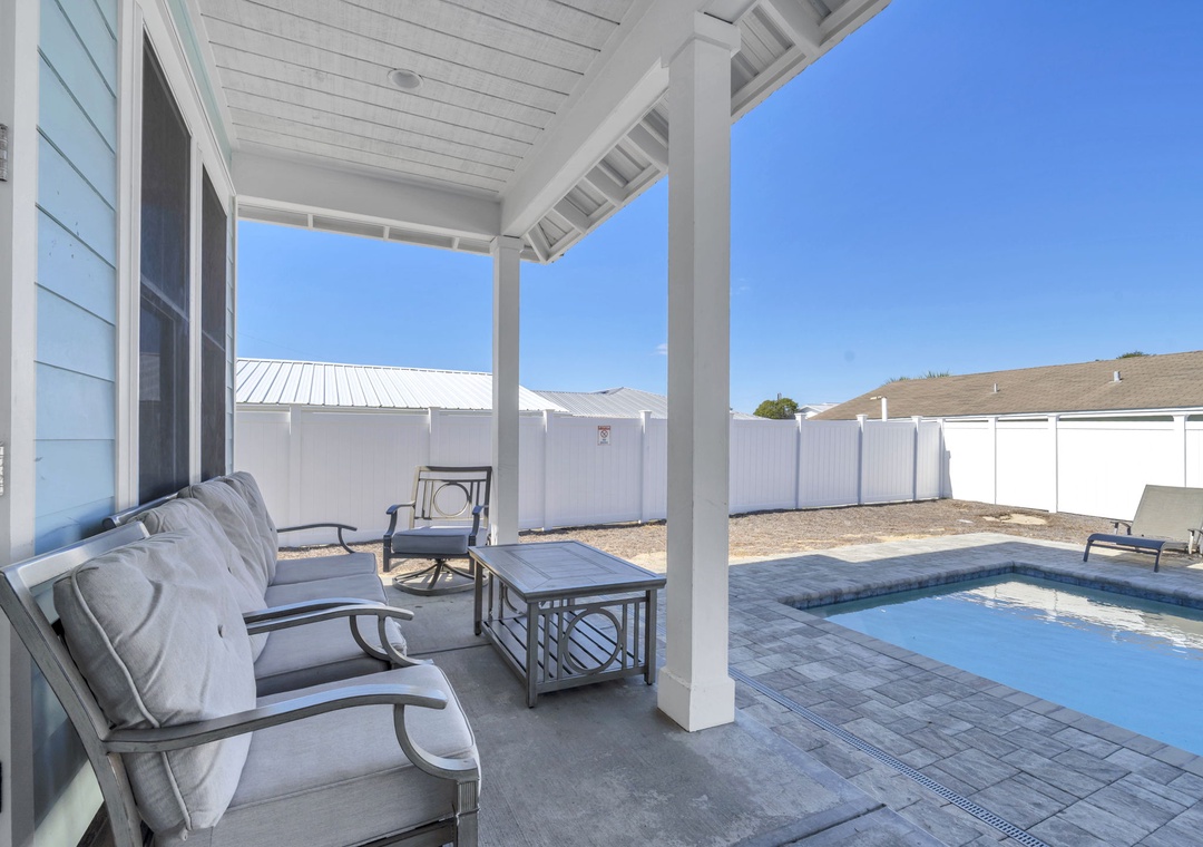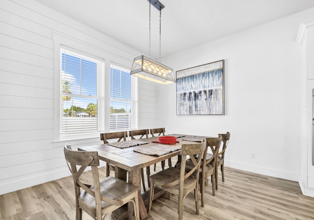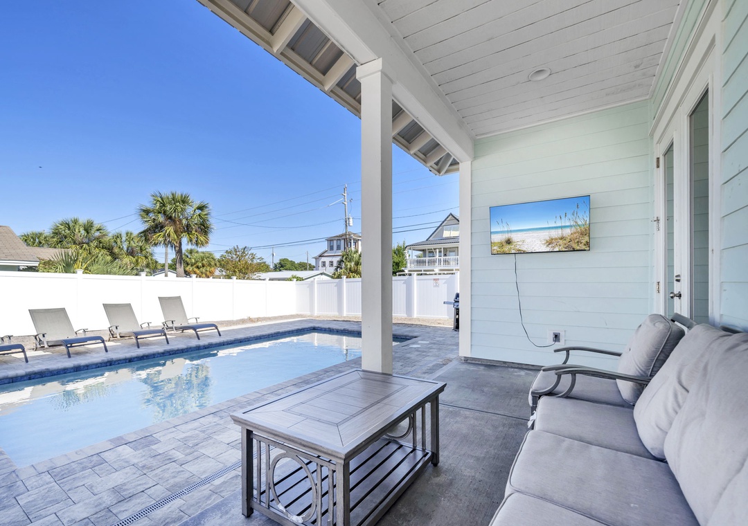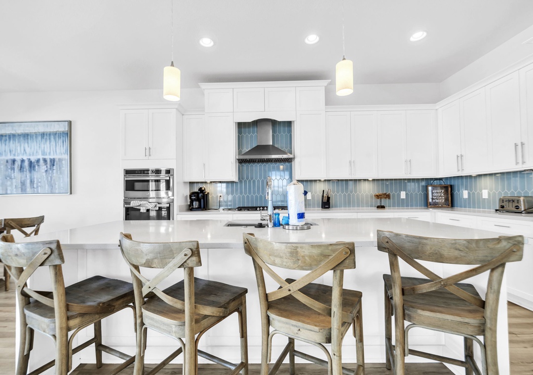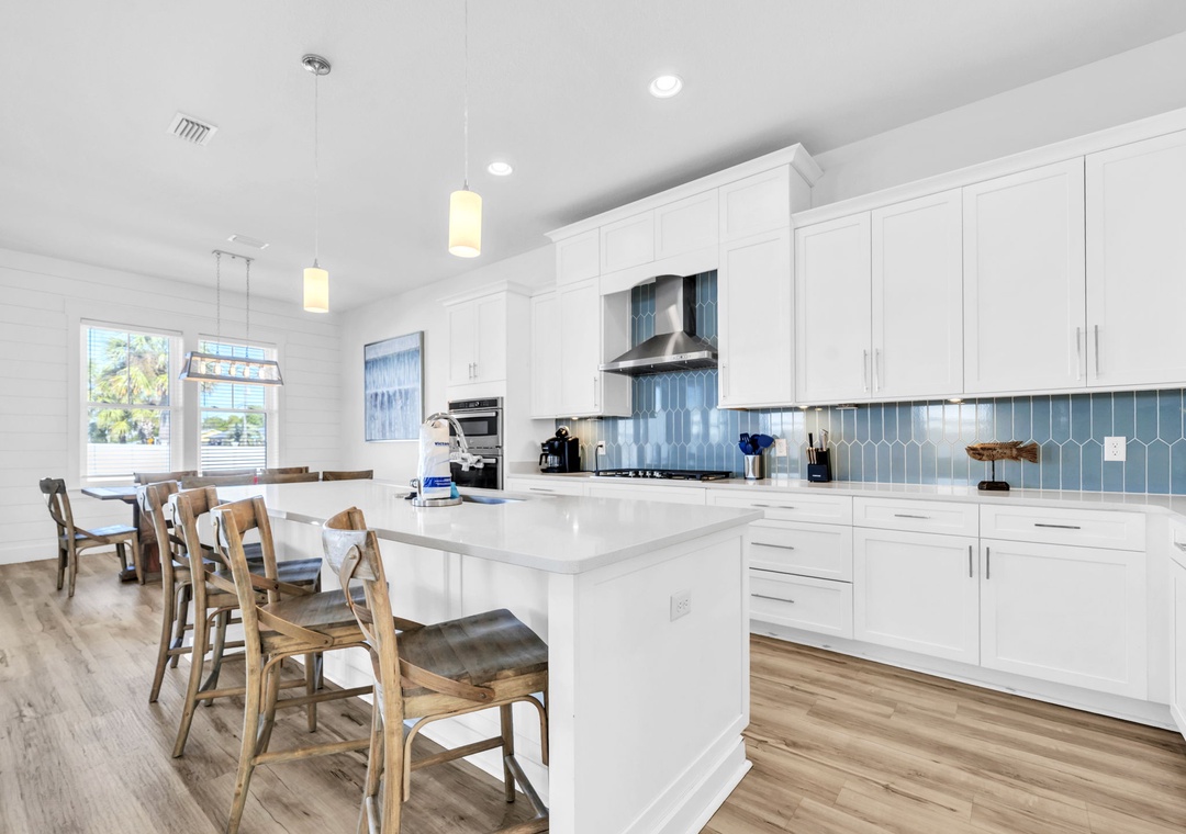 Welcome to Salty Blue, a beautifully designed and fully furnished vacation home, perfect for large families or groups. This spacious getaway features 6 bedrooms, including 2 built-in bunk rooms that are great for the kids. Step outside to enjoy your own private pool, a spacious covered patio, outdoor shower, and grill area, perfect for soaking up the Florida sunshine. Inside, the bright and airy great room features tall windows, 8-foot French doors, and stylish coastal decor. The main living area includes two sitting spaces: one for movie nights or sports, and another for quieter moments. A large dining area with shiplap walls and custom lighting makes gathering for meals a joy.