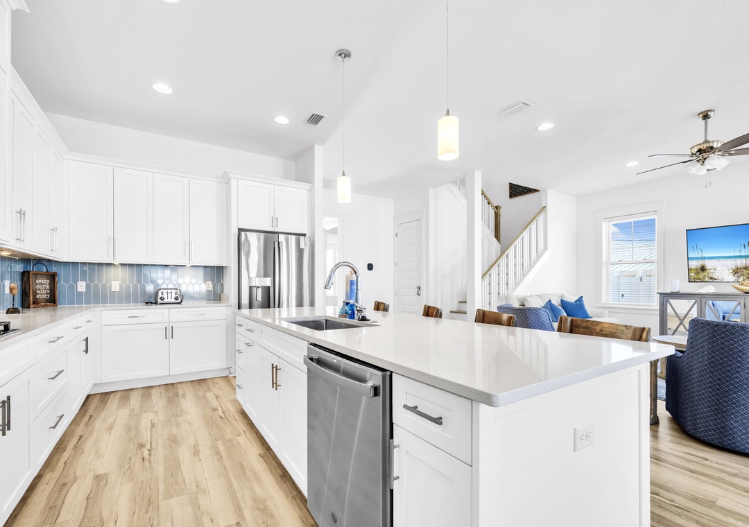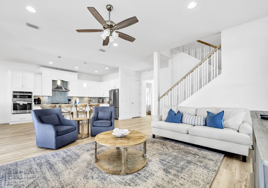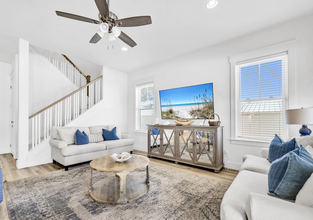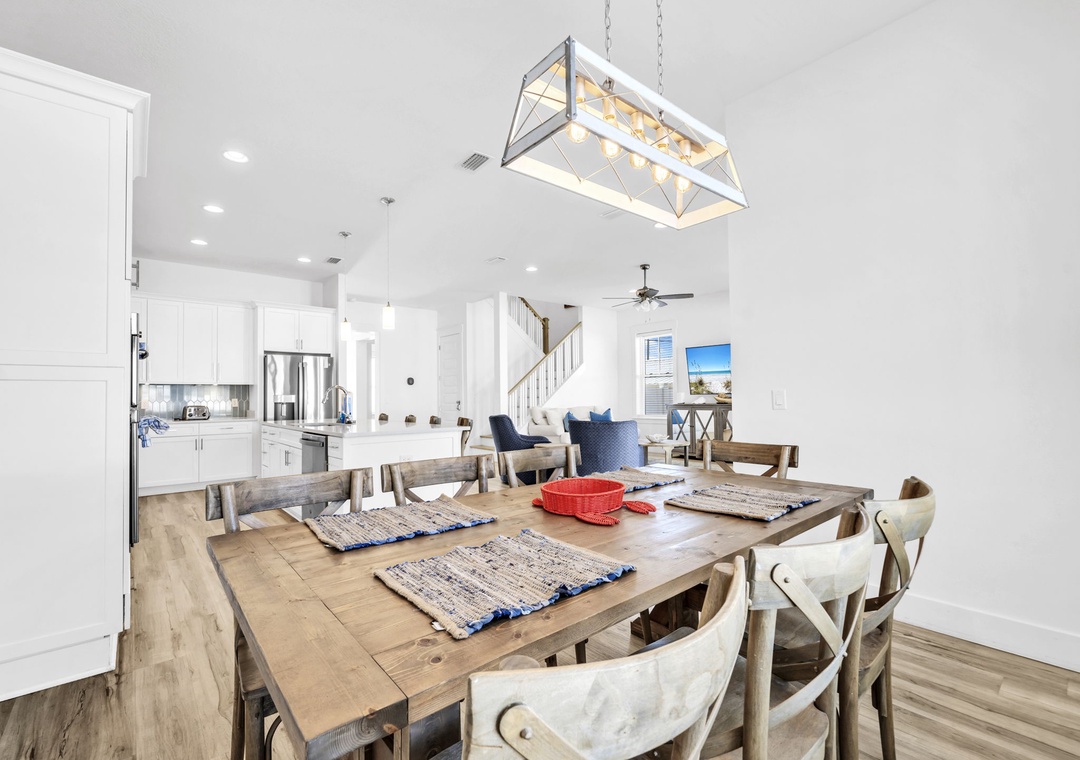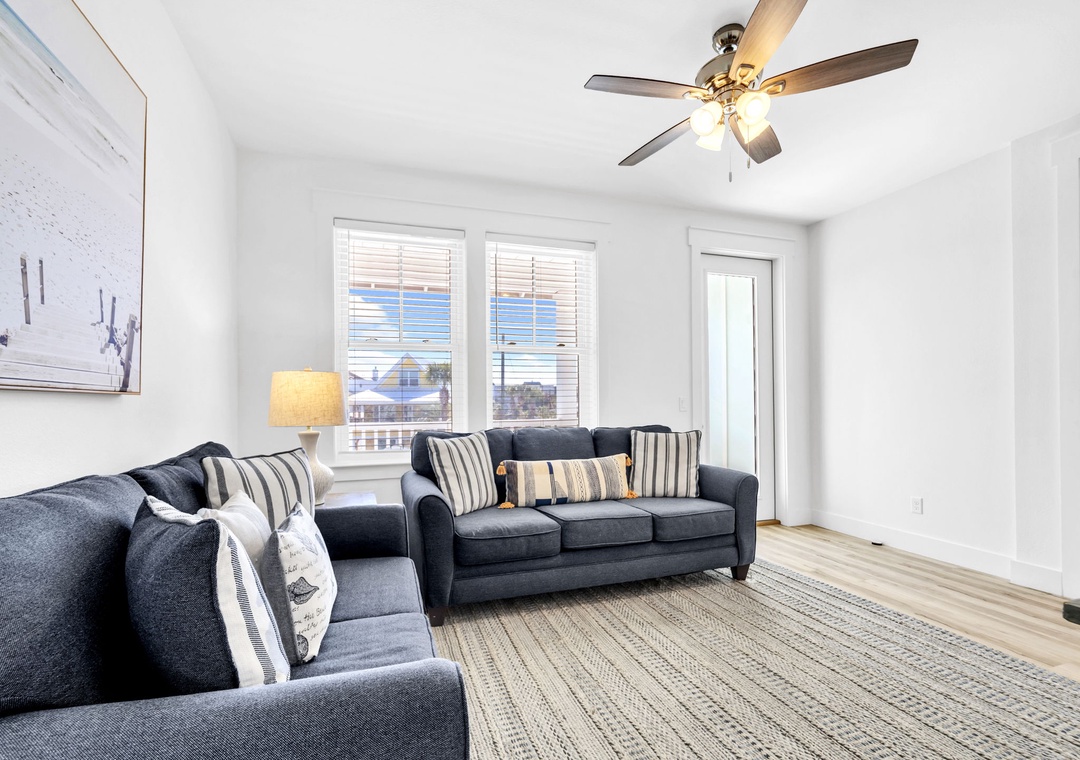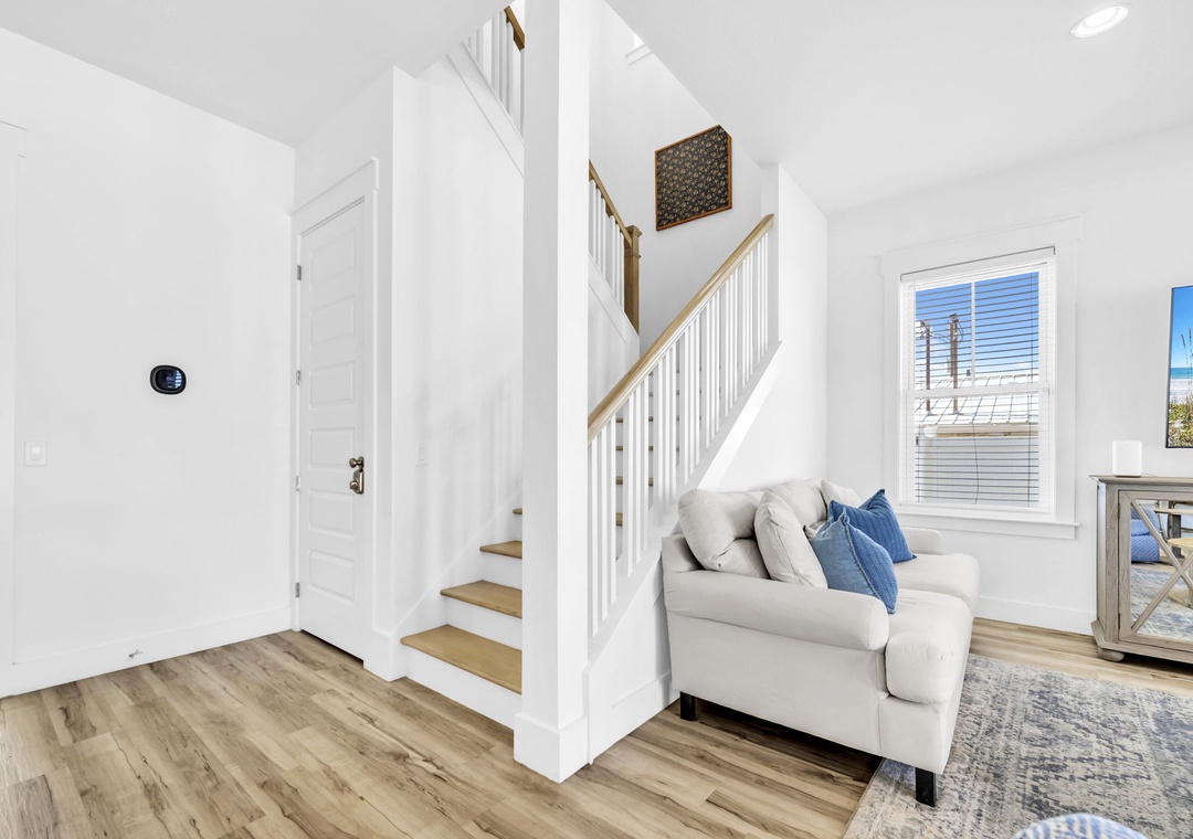 Salty Blue comfortably sleeps a crowd with six well-appointed bedrooms spread across two floors. On the first floor, you'll find a bedroom with a full-over-full bunk bed and another with a king bed. Upstairs, the master suite features a king bed, joined by two additional king bedrooms and another full-over-full bunk room, perfect for kids or extra guests. Whether you're planning a beach vacation or a relaxing retreat, Salty Blue offers the perfect blend of comfort, style, and fun.