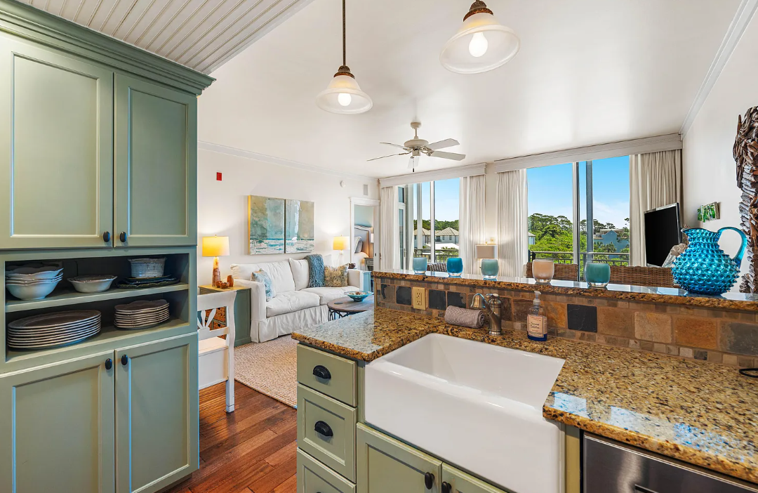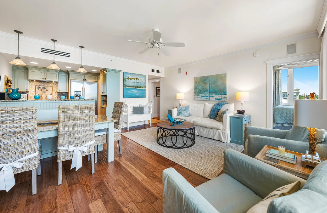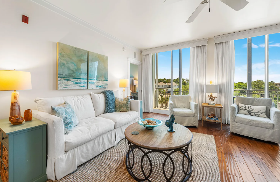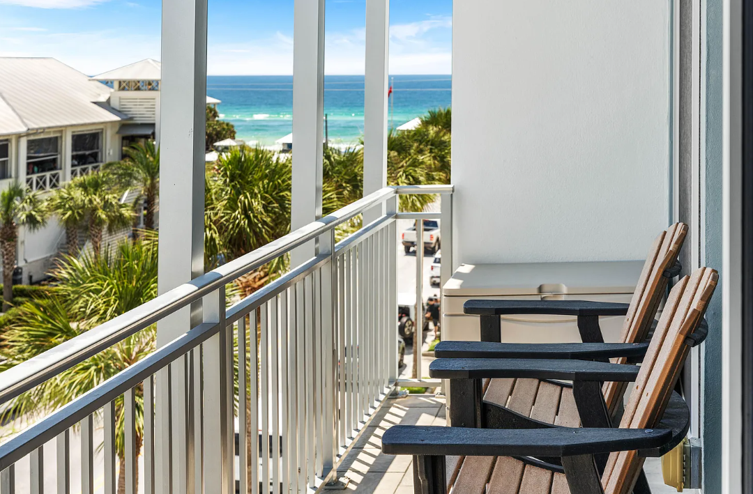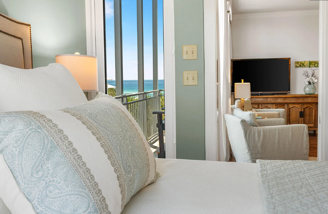 Wake up to unobstructed Gulf views from the master bedroom and living room, both of which open to a spacious covered porch—just 150 yards from the water. Sip your morning coffee while watching the sunrise or unwind with an evening cocktail as live music drifts over from nearby Shunk Gulley. Inside, you'll find chic, coastal-inspired furnishings curated by Beau Interiors, along with original artwork by local artists. The home also boasts a granite dining table with built-in banquette seating, an updated primary bathroom, stainless steel appliances, and custom blackout drapes for added comfort and privacy. Located in the vibrant community of Gulf Place, you'll enjoy access to three pools, tennis courts, local boutiques, restaurants, and of course, the sugar-white sands of the Emerald Coast—all just a short walk away. Come experience the charm and lifestyle of Salty's Six Palms 4A, your perfect beachside getaway and a place to make unforgettable memories.