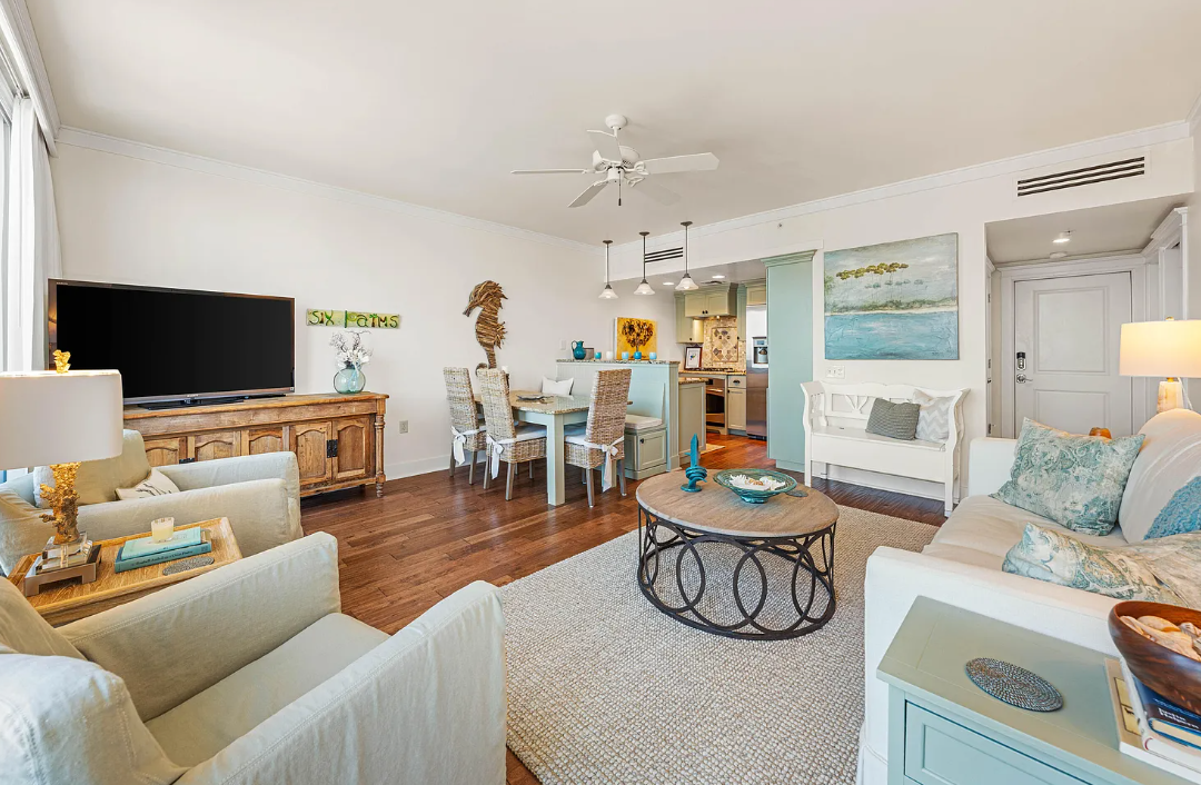 Welcome to Salty's Six Palms 4A, a beautifully appointed top-floor corner condo in the heart of Gulf Place. This inviting 2-bedroom, 2-bath retreat features a queen master suite and a queen guest bedroom, offering comfort and style in equal measure.