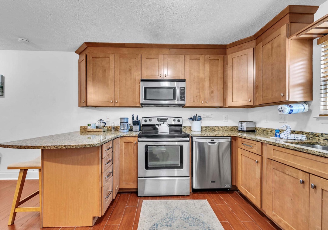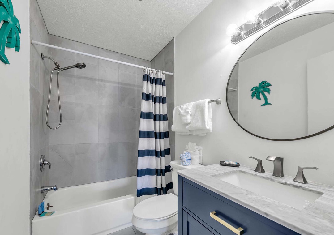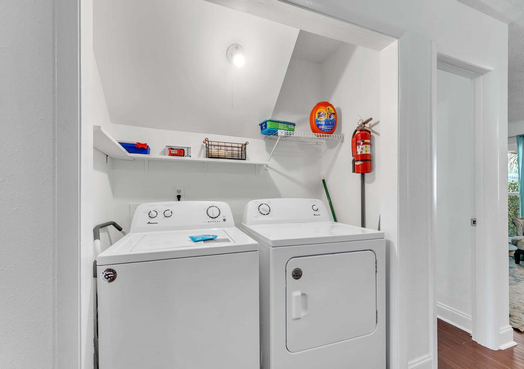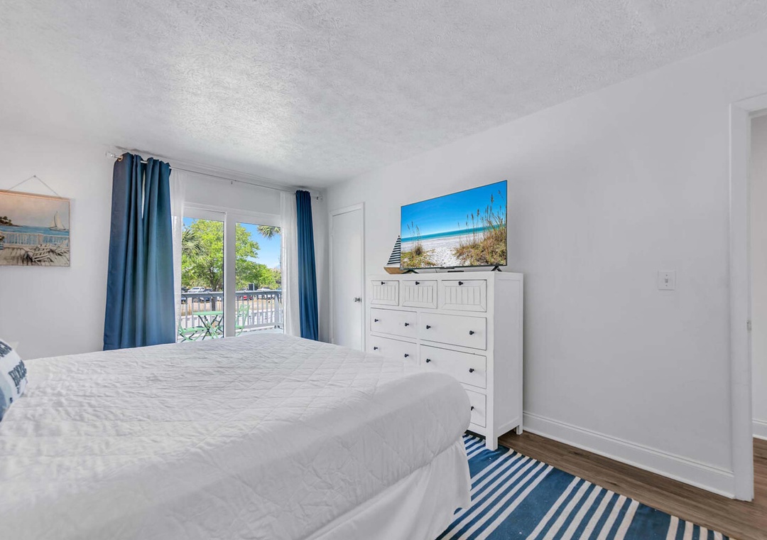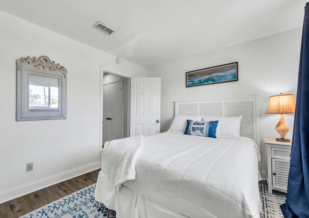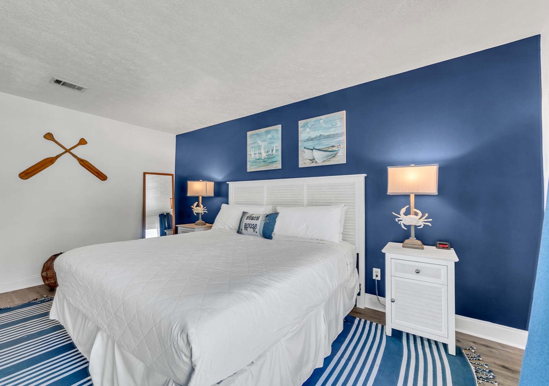 Upstairs, you’ll find a cozy Master bedroom with a king-size bed. The second bedroom, also upstairs, offers a comfortable queen-size bed, and a shared full bathroom with a tub/shower combo.