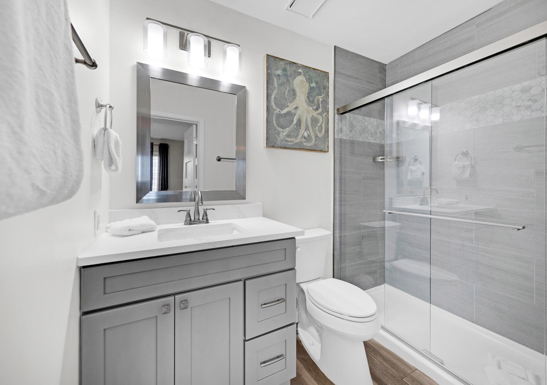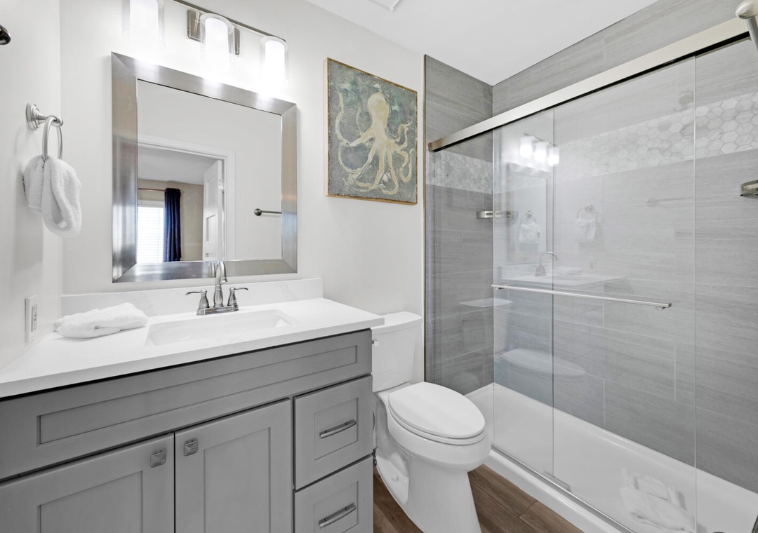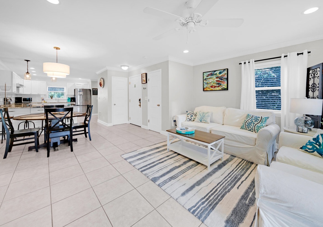 My family loved the easy access to a quiet section of beautiful beach. From the condo, it’s a short walk across the small parking lot, down a couple flights of stairs, and out onto a section on beach that you’ll share with just a few other families. My young kids also enjoyed the pool which we often had all to ourselves. The condo’s bathrooms are beautifully updated and the kitchen is comfortable. The living room was a little lacking in decor, but it was clean and comfy. There’s a handy laundry room in the garage which is stocked with beach toys if kids need them. We stayed in the same building last year, enjoying the calm ocean waves every day. This trip, we had red flags at the beach every day, meaning it wasn’t safe to swim, so we were glad to have the pool access. It’s an easy walk to the ice cream shop, bakery, natural grocery store, and bike rental shop (among other places). We enjoyed our trip and would recommend this condo to anyone looking for a quiet, relaxing piece of paradise in an otherwise very crowded area.- Reviewed On: 7/27/2021