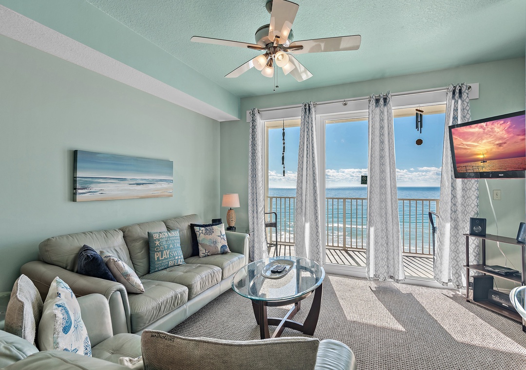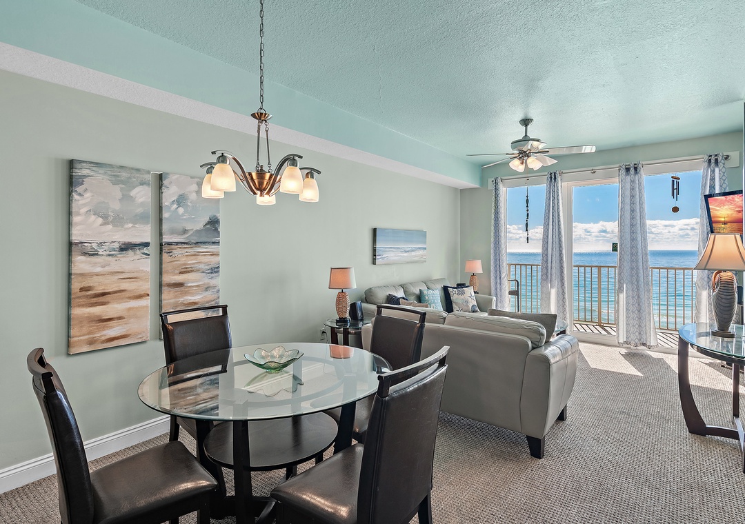 Sea Dunes 603 a beautiful top floor Beach Front condo with amazing Gulf Front views. The dining area opens into the living room for easy living. The master bedroom features a king bed, guest bedroom is a queen bed and there is a bunk room with a twin over full bed. You'll be able to see the sparkling waters and the beach from the master bedroom, living room, dining area and kitchen. Come see why families vacation year after year to beautiful Sea Dunes 603.