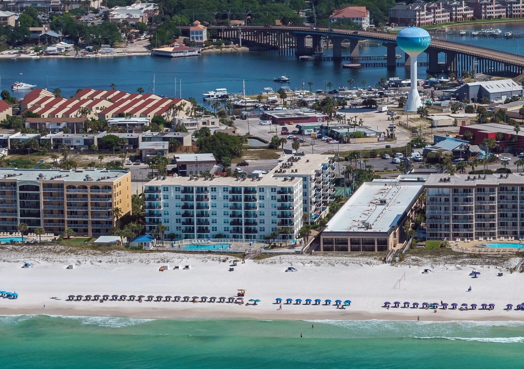 Nearby attractions within walking distance include the Okaloosa Island Fishing Pier and Gulfarium featuring live shows, restaurants such as The Black Pearl, Anglers, Fudpuckers, The Crab Trap, and miniature golf.