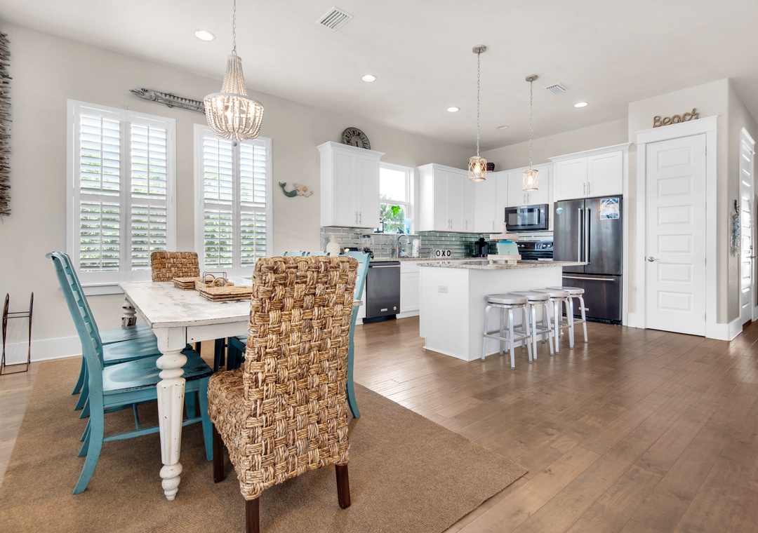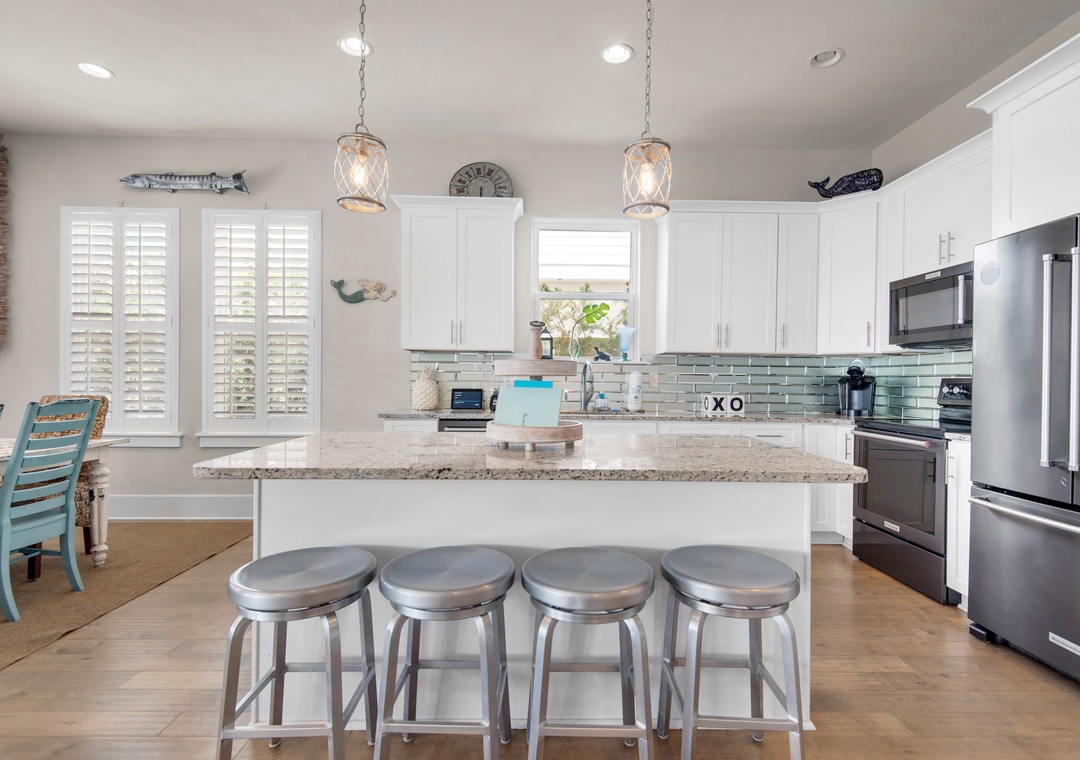 Nestled in the Villas of Frangista, Seaglass Shack is a stunning 4-bedroom, 3.5-bath home designed for unforgettable family getaways. Just a short stroll from the beach, this two-story retreat is perfect for any season. Step inside to an inviting, sunlit open-concept living room and kitchen, where warm wood floors, stainless-steel appliances, and sleek granite countertops create a welcoming space. The home comfortably accommodates guests with two king bedrooms, one queen bedroom, and a bunk room featuring two twin-over-twin bunks and a sleeper sofa—ideal for kids or extra guests. After a day of exploring the beach, unwind with a cold drink on the back patio or settle in for a cozy movie night on the flatscreen TV. For added convenience, an optional golf cart rental makes it easy to cruise around and head to the shore effortlessly. Start making unforgettable memories at Seaglass Shack—your perfect coastal escape.