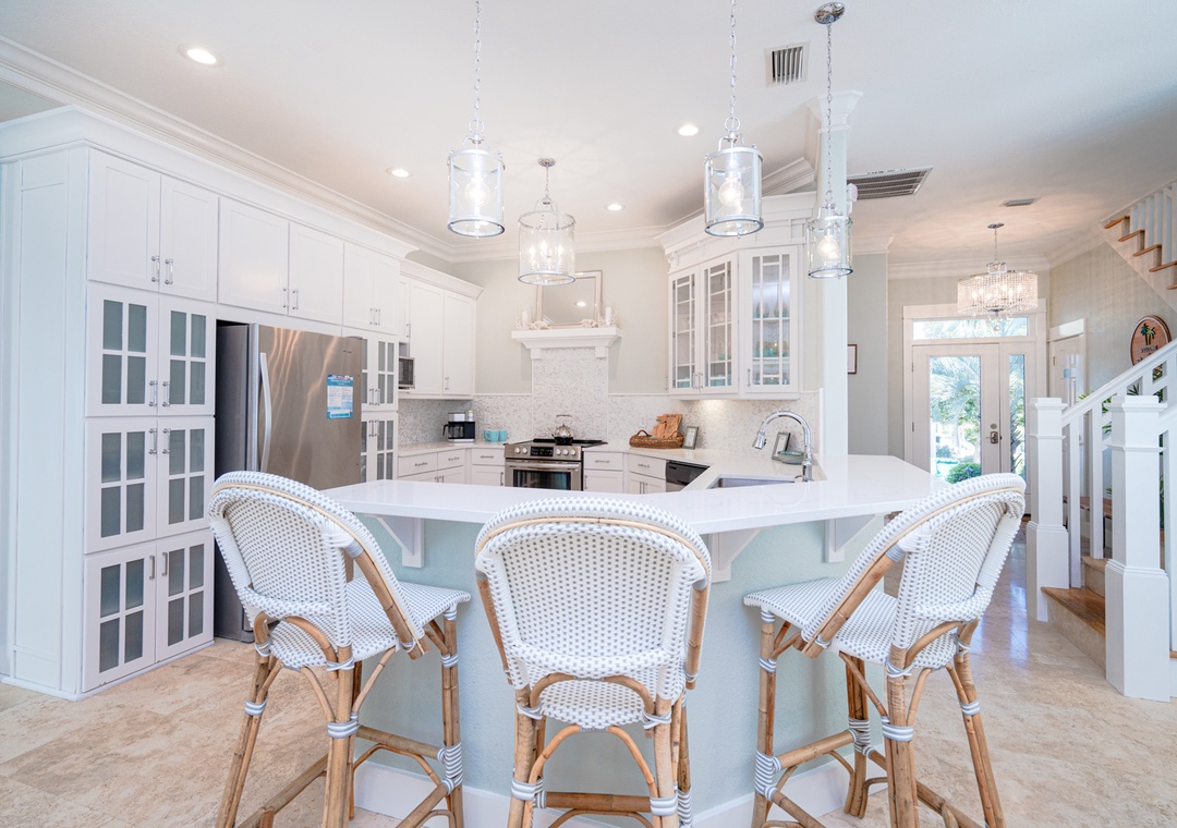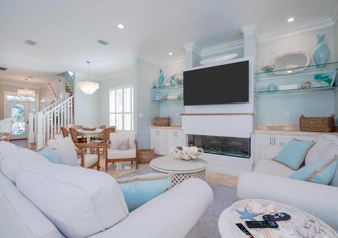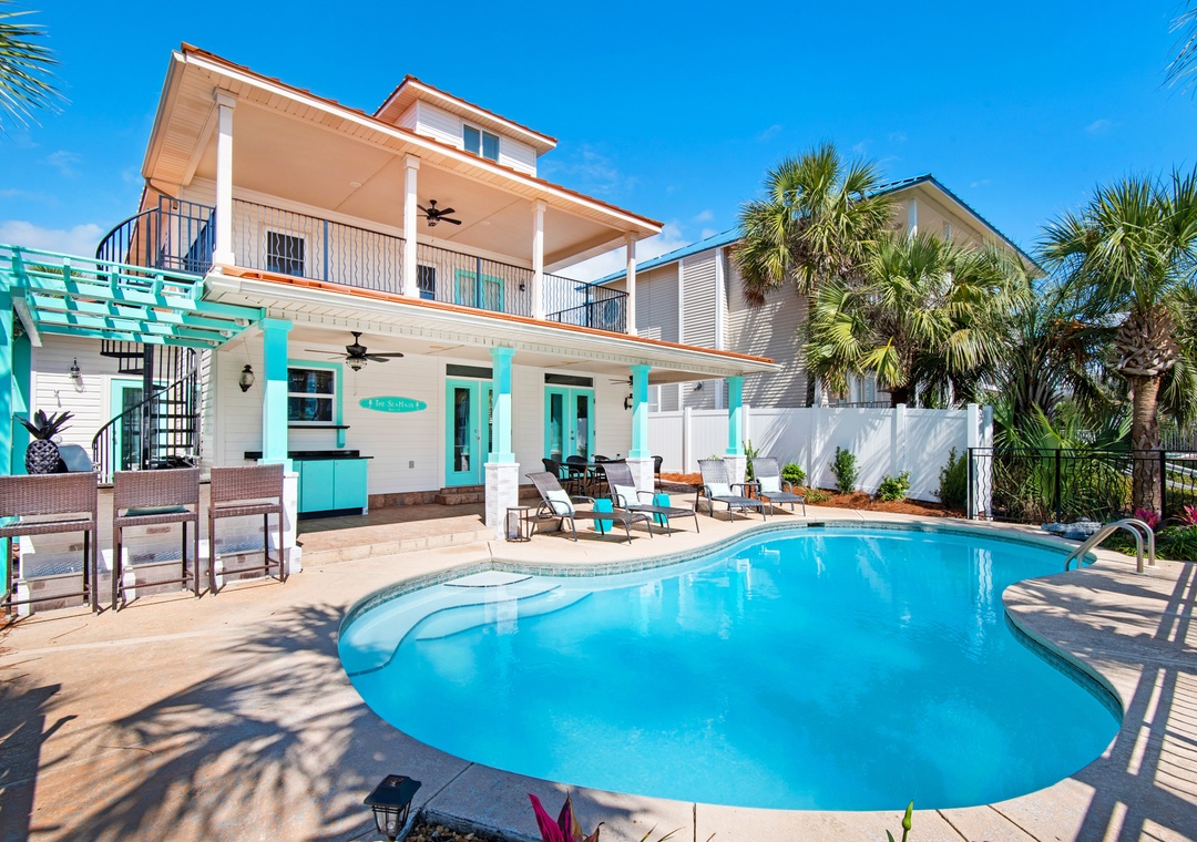 Welcome the elegance and fun at the beach with SeaHaus - an adorable Key West-style beach house located in the Crystal Beach neighborhood in Destin. This spacious 5-bedroom, 5-bath home features three stories and a private pool. Featuring a king master suite, queen bedroom, and living room with sleeper sofa on the first floor; queen and king master suites on the second floor; and a bunkroom with two sets of twin bunks on the third floor, up to 14 guests can sleep comfortably. Entering SeaHaus is like a breath of fresh air with cool coastal tones and beachy elegance. An open floor plan allows guests to use all of the space seamlessly. This spacious home is equipped with HD flat-screen TVs and Blu-ray DVD players in every room, a gourmet kitchen with granite countertops and stainless-steel appliances, a wet bar, a spacious balcony overlooking the pool, plus an outdoor kitchen. This desirable area is near fantastic restaurants and just across the highway from the Destin Commons, a highly rated shopping center with designer stores. Guests will enjoy a private pool, foosball table, and even a fireplace while just a short three-minute stroll to the sugar-white sands of the Emerald Coast. SeaHaus will be the ideal place for your next group retreat or wedding! When you want to venture out, enjoy this amazing location just 500 feet from beach access and within walking distance to delicious restaurants. Come see why Seahaus should be your next home away from home. With all of the on-site amenities and close proximity to local attractions, SeaHaus has everything you need for your perfect Destin getaway - Reserve now!