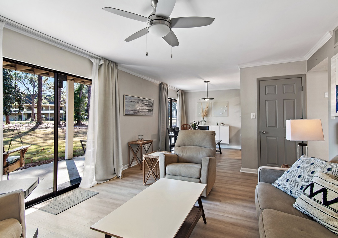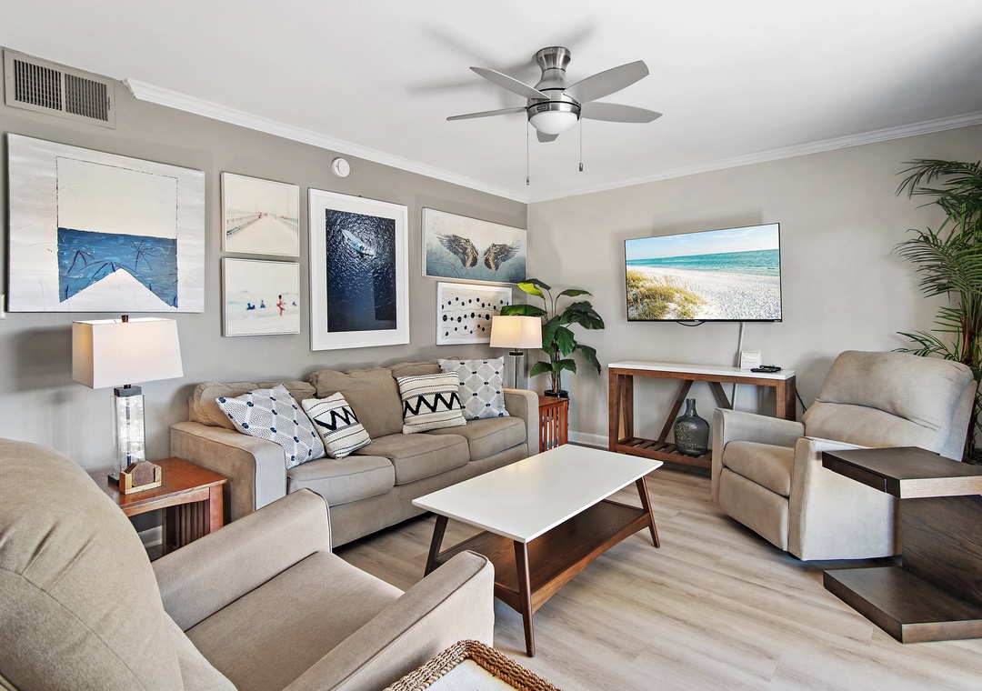 Seascape Golf Villas 91B is just steps away from pristine beachfront. This ground-level condo is located in the beautiful Seascape Resort community and offers the perfect coastal escape. When you’re not relaxing on the sugary white sand, you can enjoy the many exciting activities the resort has to offer. This spacious two-bedroom, two-bath condo comfortably accommodates up to six guests and features a cozy living area ideal for unwinding after a day of adventure. The well-equipped kitchen makes it easy to whip up a delicious meal, while the private patio and porch swing invite you to relax, breathe in the fresh coastal air, and take in picturesque views. The master bedroom offers a king bed, the guest bedroom features a queen bed, and the living room includes a sleeper sofa. Start making unforgettable vacation memories at Seascape Golf Villas 91B—your perfect coastal getaway.
