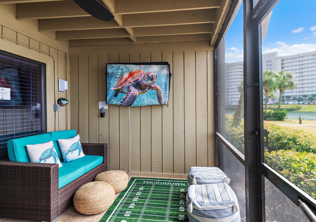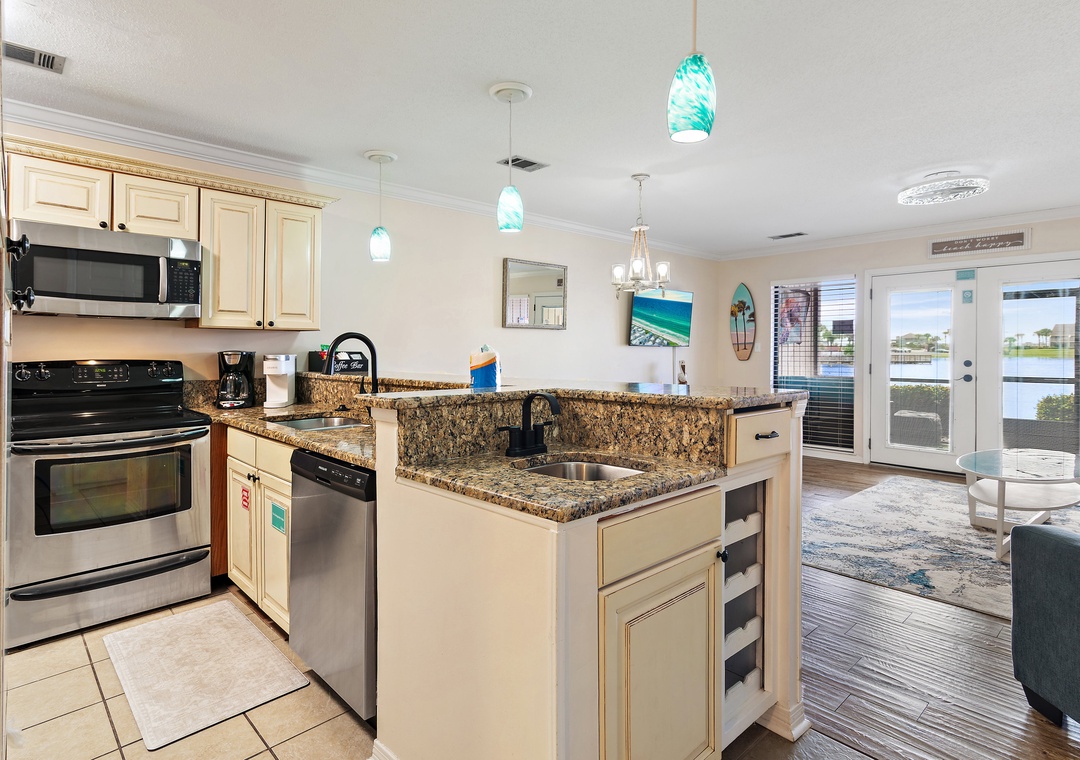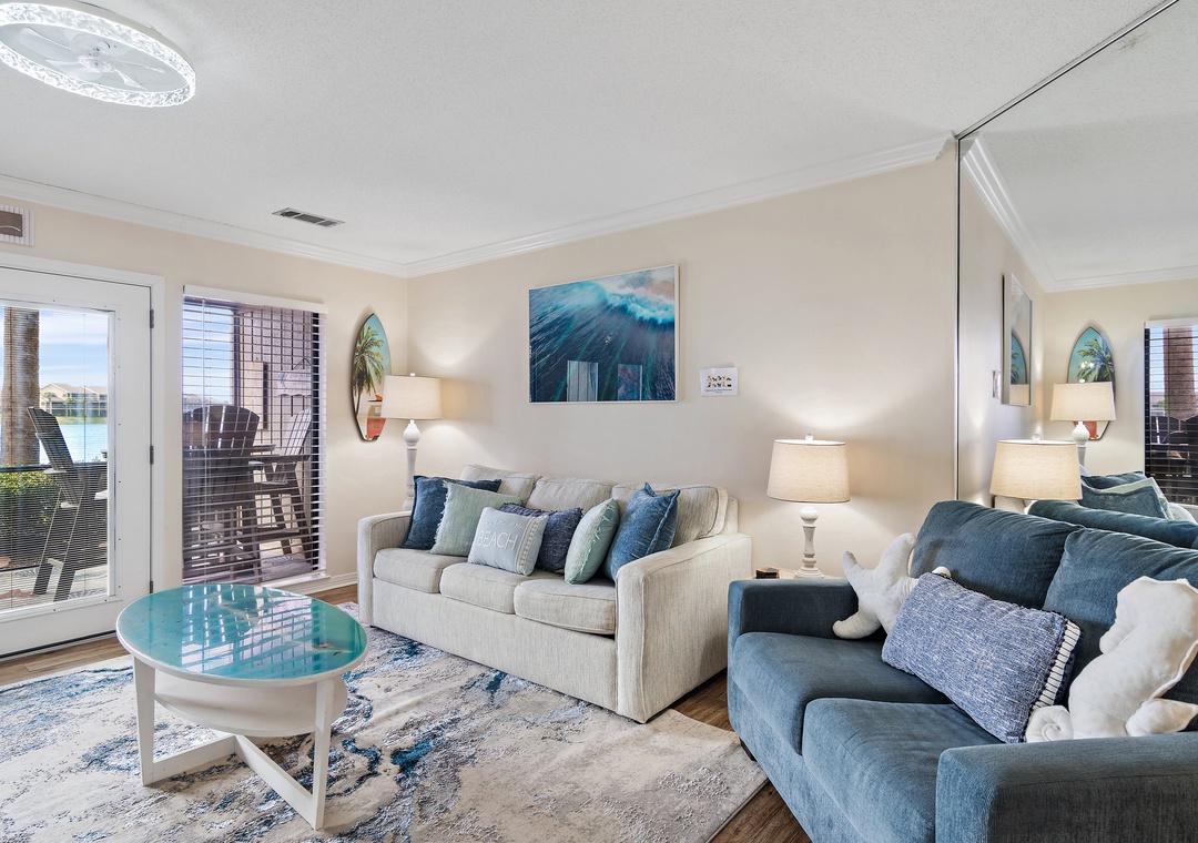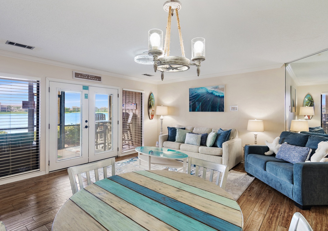 Welcome to "Don't Worry, Beach Happy" – Your Cozy Coastal Escape at Seascape Lakefront Villas. Tucked away in the picturesque Seascape Lakefront Villas, "Don't Worry, Beach Happy" is a charming 1BR/1BA ground-floor unit that combines coastal vibes with modern comfort. This cozy retreat is the perfect place to unwind and recharge. Inside, you’ll find a stylish space that feels just like home, featuring a master bedroom with a comfortable King-sized bed for a restful night’s sleep. The full kitchen, with granite counters and stainless-steel appliances, is perfect for whipping up meals after a day of fun by the sea. The living room is your spot to relax, with a sleeper sofa that boasts a brand-new gel mattress, offering additional sleeping space and accommodating up to 5 guests. As the sun rises over Stuart Lake, enjoy your morning coffee on the screened-in porch, where the panoramic views will instantly put you at ease. Plus, there's a smart TV out here, perfect for catching the game while lounging and taking in the view. When you’re ready to explore, take a stroll along the boardwalk for direct beach access or enjoy delicious seafood at the famous Whale’s Tail restaurant. Seascape Lakefront Villas offers everything you need for a fun and relaxing stay, with multiple pools, 2,000 feet of pristine beach, and a 9-hole golf course. There’s always something to do or somewhere to relax.