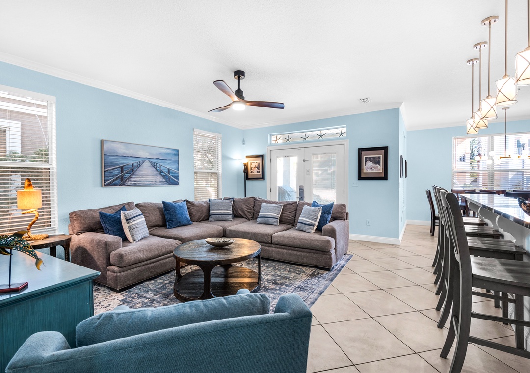 This fabulous home in Villages of Crystal Beach features a spacious open floor plan, coastal decor, a fully equipped kitchen with a large dining table, and two gorgeous balconies. Serenity is a 6BR/4BA house that sleeps up to 15 guests. There is a King bedroom on the first floor, as well as a King Master suite on the 2nd floor with newly upgraded furniture! Additionally, there are two queen bedrooms, a bunk room, and a bedroom with two twin beds. This magnificent house also has a full-size laundry room with a washer/dryer, parking spots in the driveway, as well as additional overflow parking nearby. This luxurious community is about 900 yds from Crystal Beach and includes a complimentary seasonal trolley service to take you to and from the Gulf. Enjoy your next vacation getaway at Serenity!