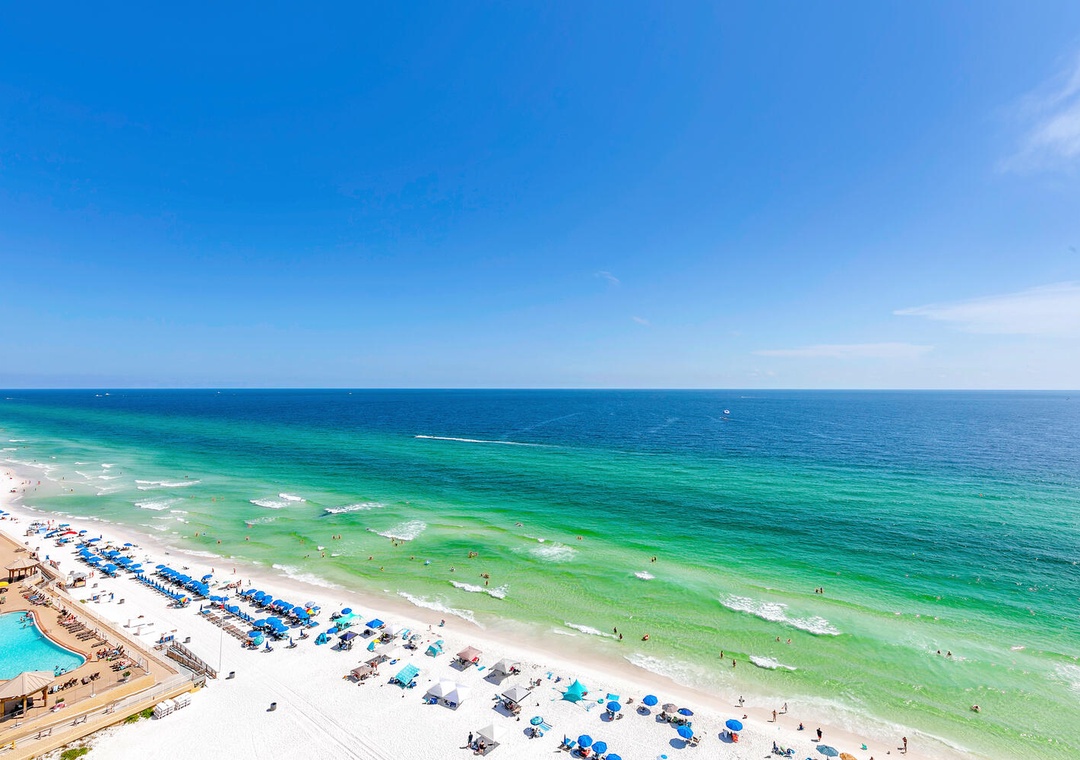Conveniently located on the family-friendly, eastern end of Thomas Drive, the beach in front of Seychelles is fabulous! It's wide and deep and reminds one of "old Florida". Less than a mile away is gorgeous St. Andrews State Park. Grand Lagoon touches the park to the north and to the south, the beautiful Gulf. Swimming and fishing are great at the park without the large crowds!