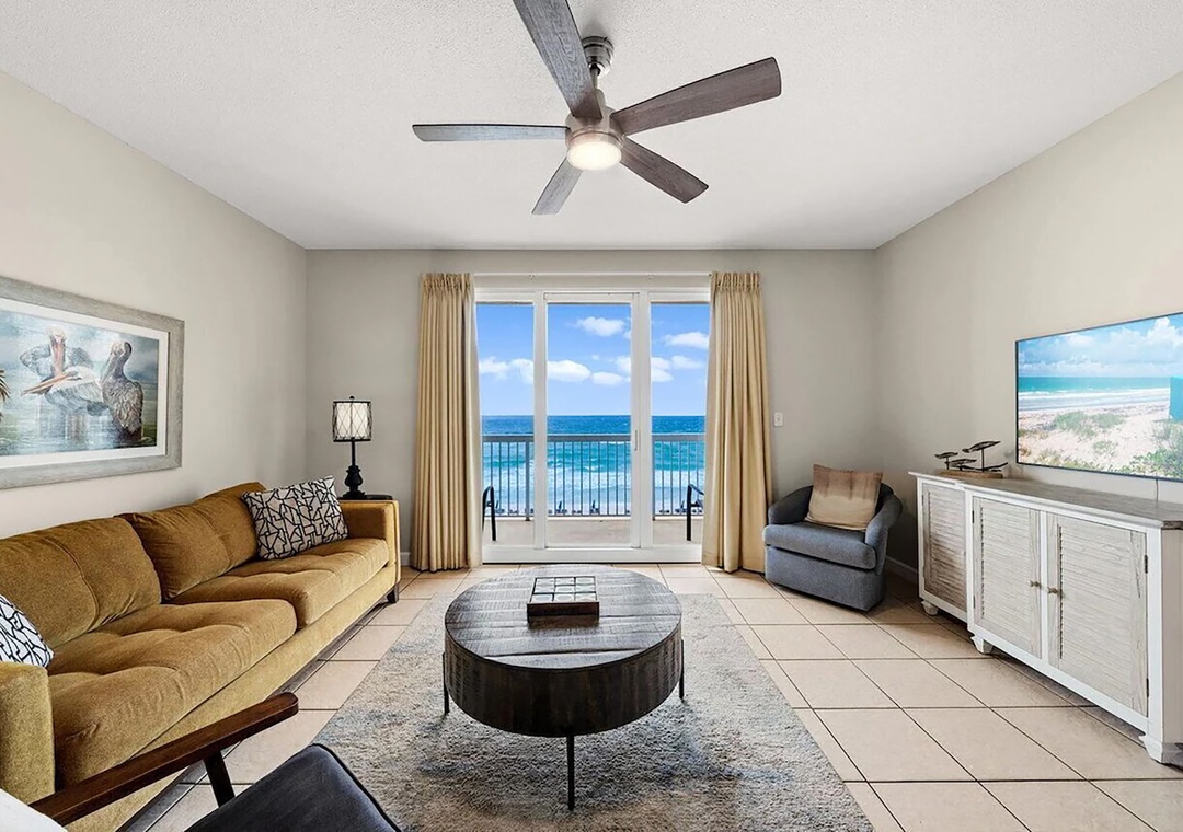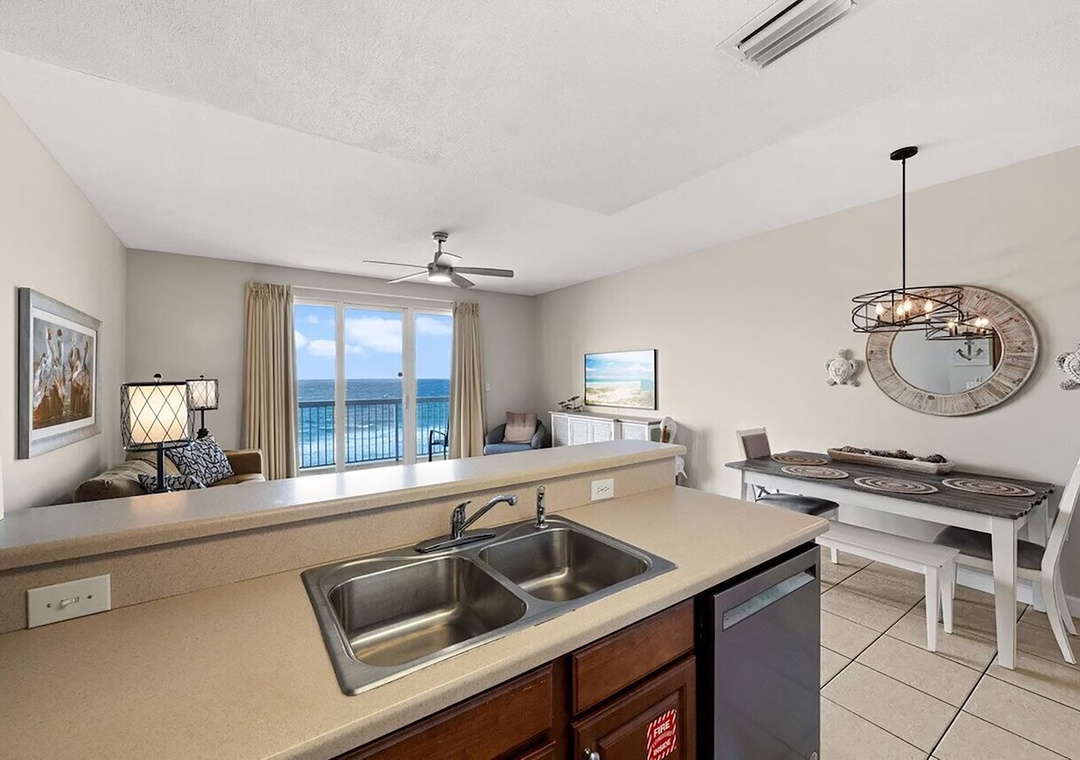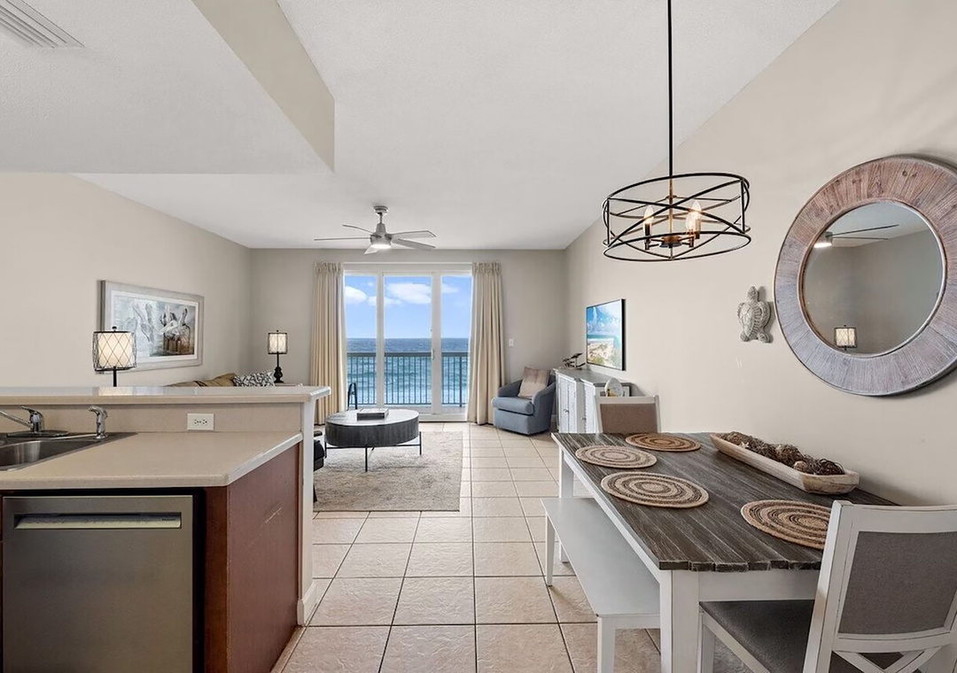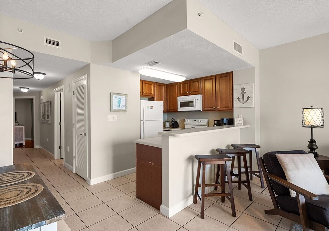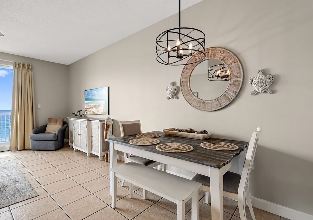 Escape to Seychelles 603, a vibrant 1-bedroom plus bunks, 2-bathroom beachfront condo that’s perfect for a family getaway, couples retreat, or a relaxing escape—because “603 is the Place to Be!” Perched on the 6th floor, this inviting retreat offers stunning Gulf views and the soothing sound of waves right from your private balcony, complete with brand-new high-top deck chairs ideal for sunset watching, outdoor dining, or simply unwinding. Inside, you’ll find a bright, cheerful space filled with playful coastal décor that creates a fun and welcoming atmosphere from the moment you arrive. Relax in the comfortable living area featuring a new 55” TV or gather with loved ones around the dining table and breakfast bar after a day at the beach. The fully equipped kitchen has everything you need for home-cooked meals, though the sugar-white sands are just steps away. The condo comfortably sleeps guests with a queen bed in the master bedroom, twin bunk beds in the hallway, and a sleeper sofa in the living room—making it the perfect spot to start creating unforgettable beach memories.
