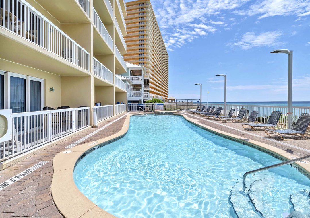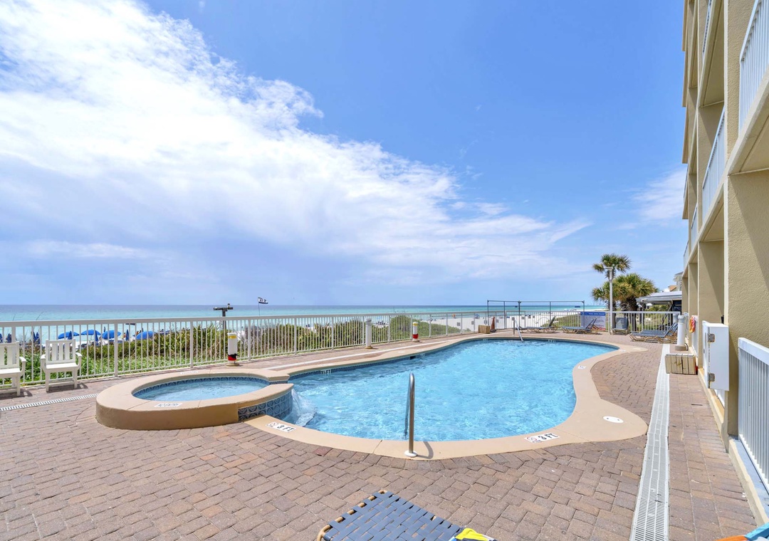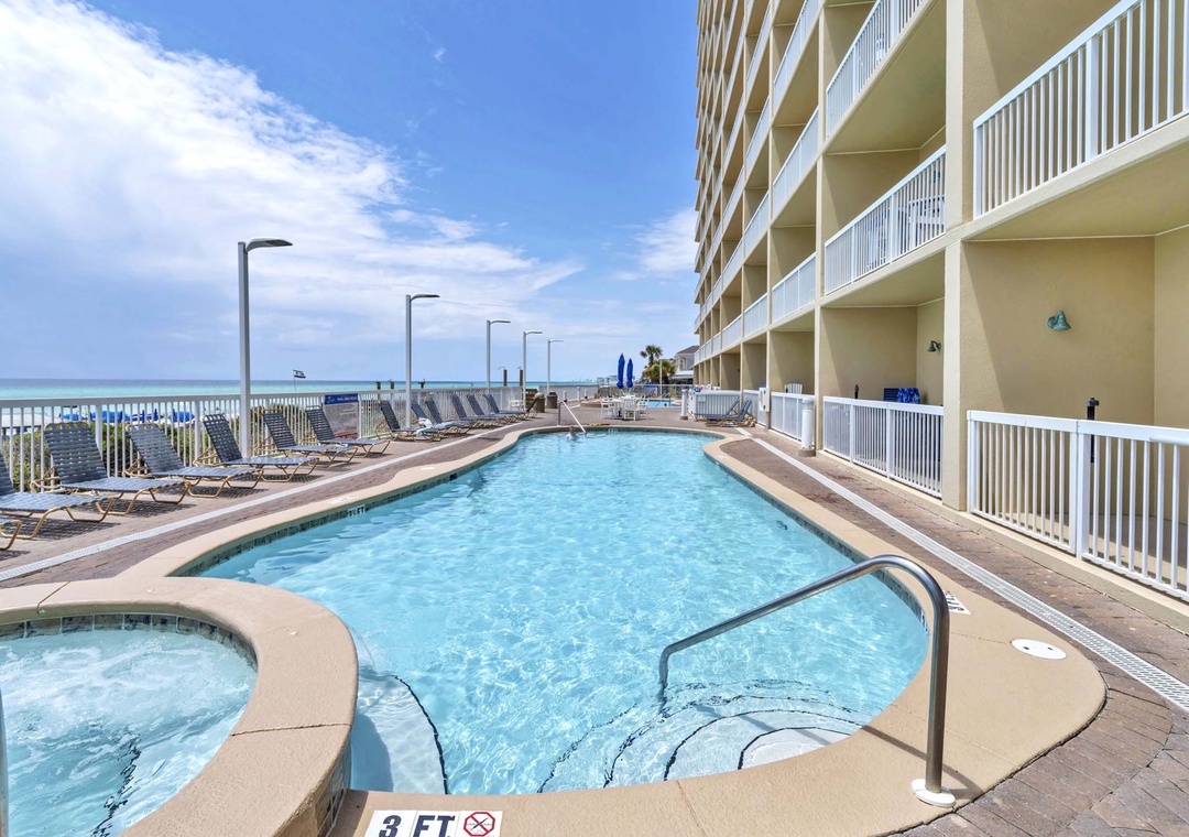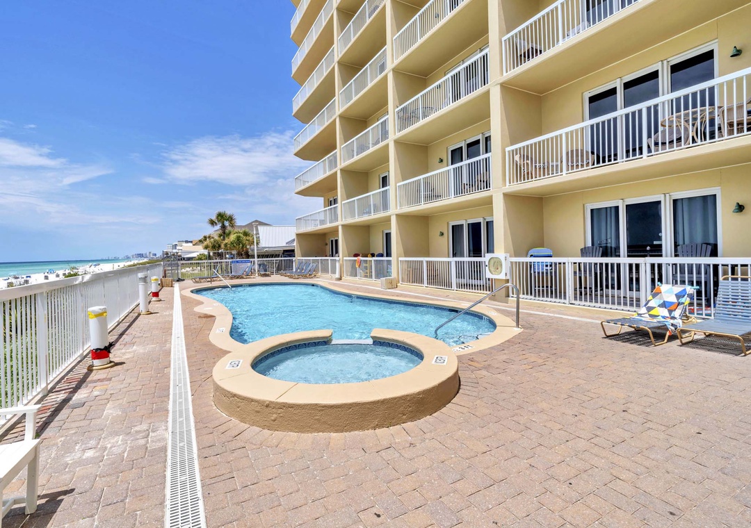 * Two beachfront pools, gazebo, fitness center, and covered parking.
