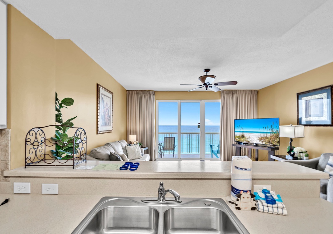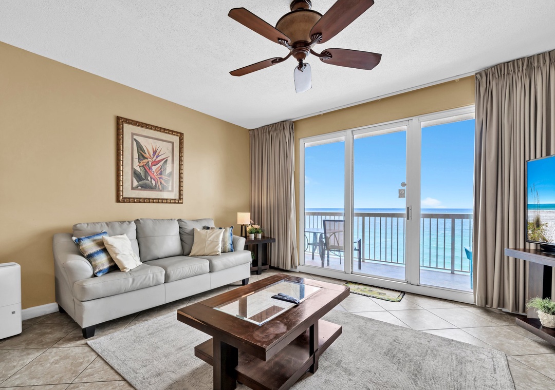 Seychelles 907 is a lovely 1 bedroom, 2 bath condo. This beachfront Panama City Beach vacation rental has one bedroom but sleeps up to six people comfortably. The bedroom is furnished with a King bed, and in the hallway, you will find twin bunk beds. There is also a queen sleeper sofa in the living room. With two bathrooms, there is enough room for everyone to vacation comfortably. What better way to spend your morning than sitting on your private balcony overlooking the community pool and the gorgeous beaches of Panama City Beach?
