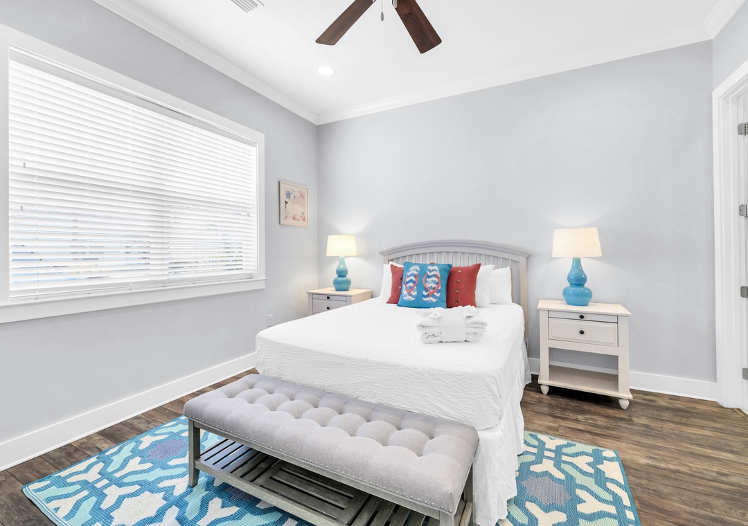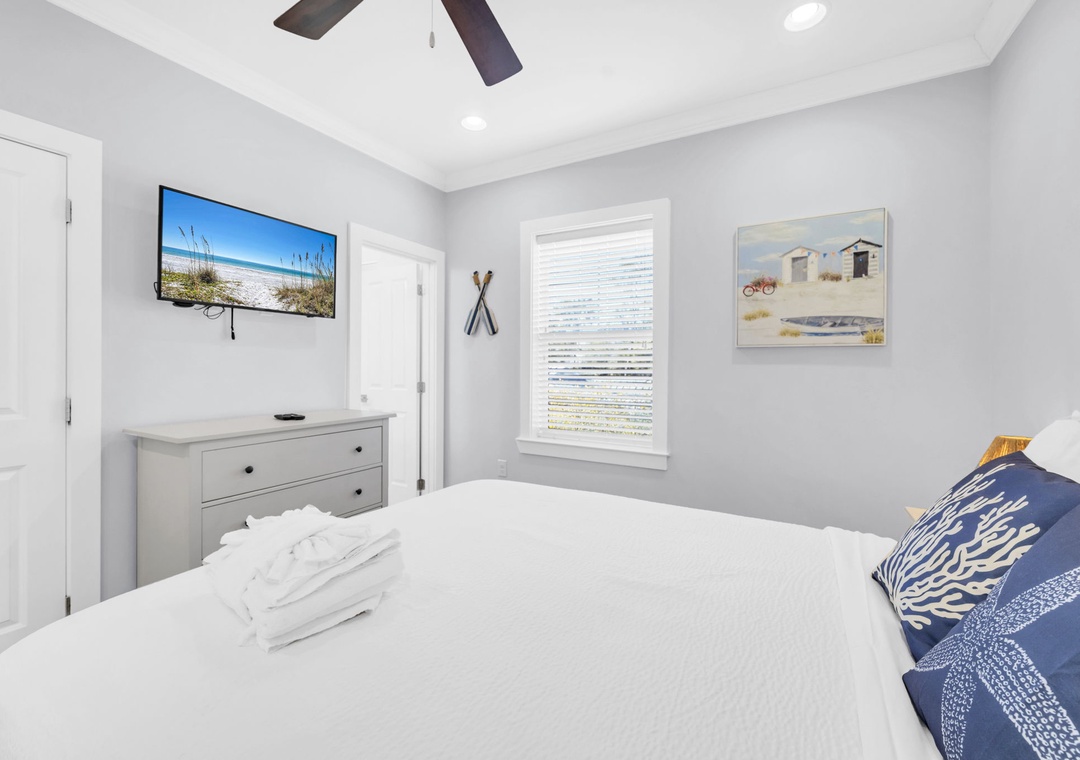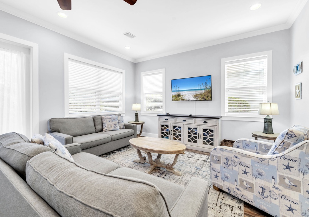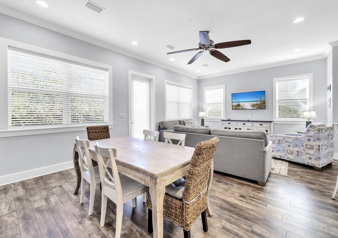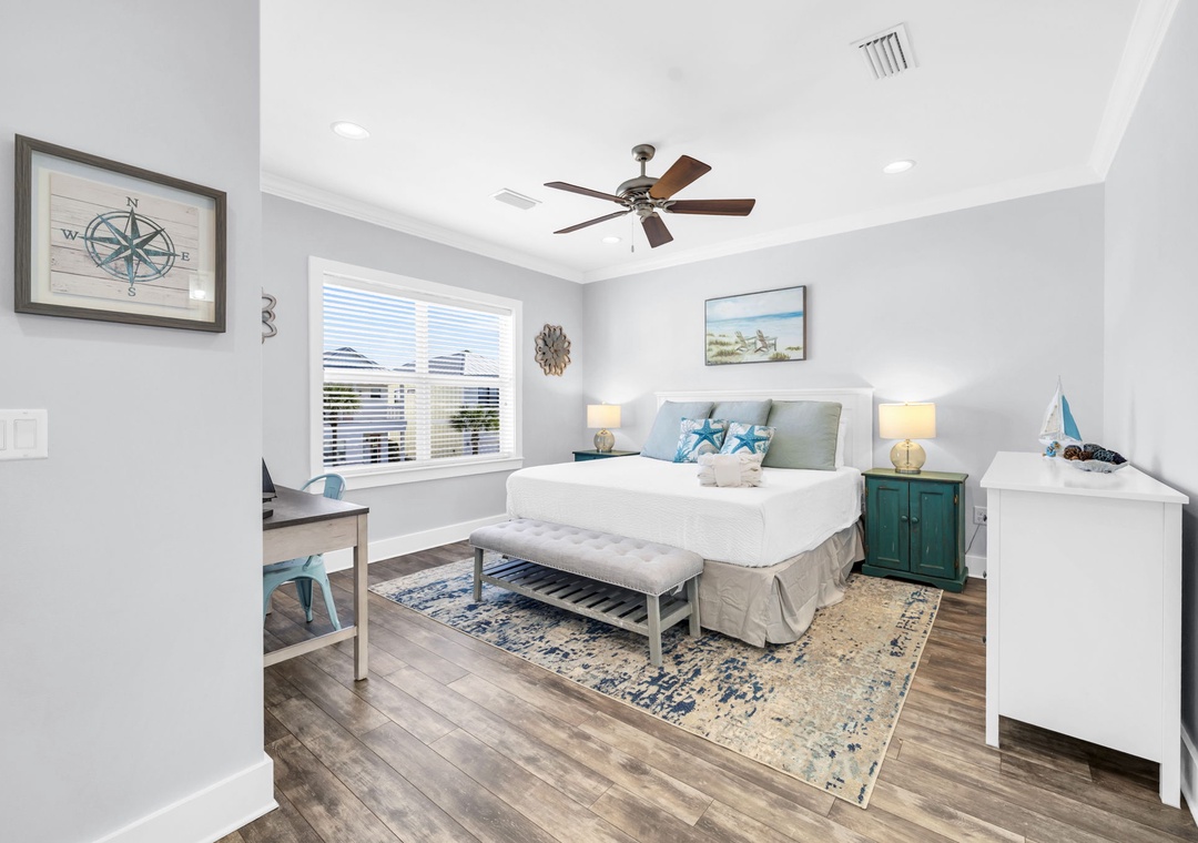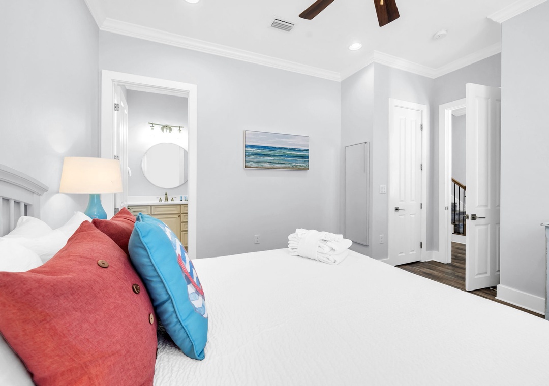 Welcome to Shore Beats Work 30A, your perfect home away from home! This stunning 4-bedroom, 4.5-bath retreat is nestled in the Gulf Reflections community, just off Highway 30A near Gulf Place. Only a few blocks from the beach, this beautiful home features a bright, open living and dining area ideal for gathering with family and friends. Start your mornings in the fully equipped kitchen, complete with an extended breakfast bar, perfect for cooking and enjoying breakfast together. The first floor offers a comfortable guest bedroom with a queen bed, while the second floor features a spacious king master suite with private balcony access, a second guest bedroom with a queen bed, and a fun bunk room with two twin-over-twin bunk beds — sleeping up to 10 guests comfortably. Every bedroom includes its own ensuite bathroom for added privacy and convenience. When you’re not relaxing indoors, take a dip in the community pool or enjoy a stroll to the nearby beach. Make unforgettable memories and enjoy the vacation of a lifetime at Shore Beats Work 30A!