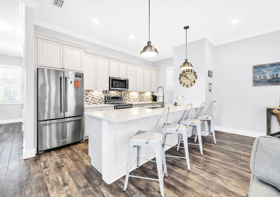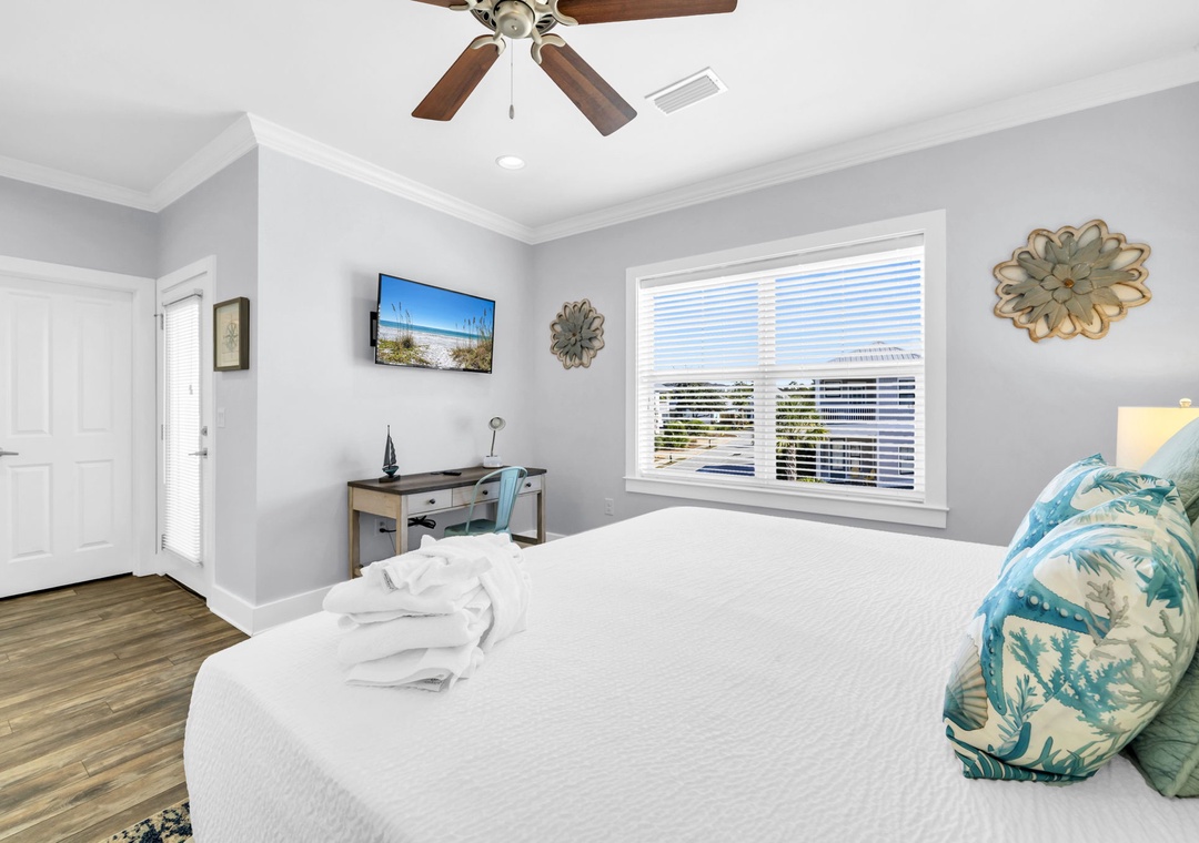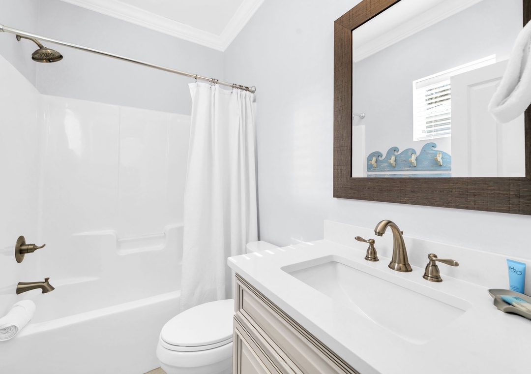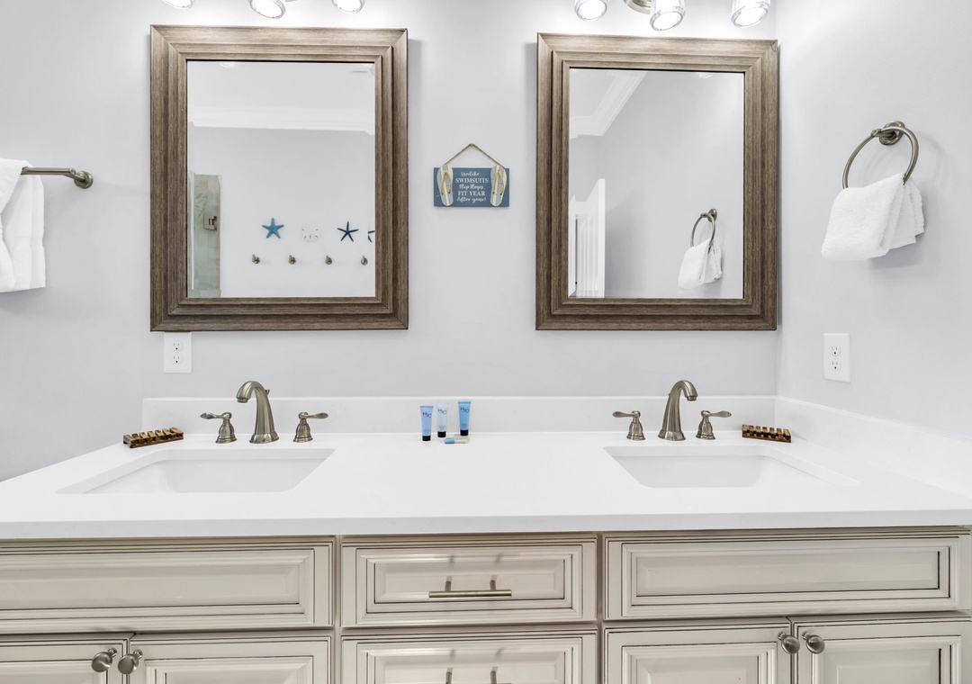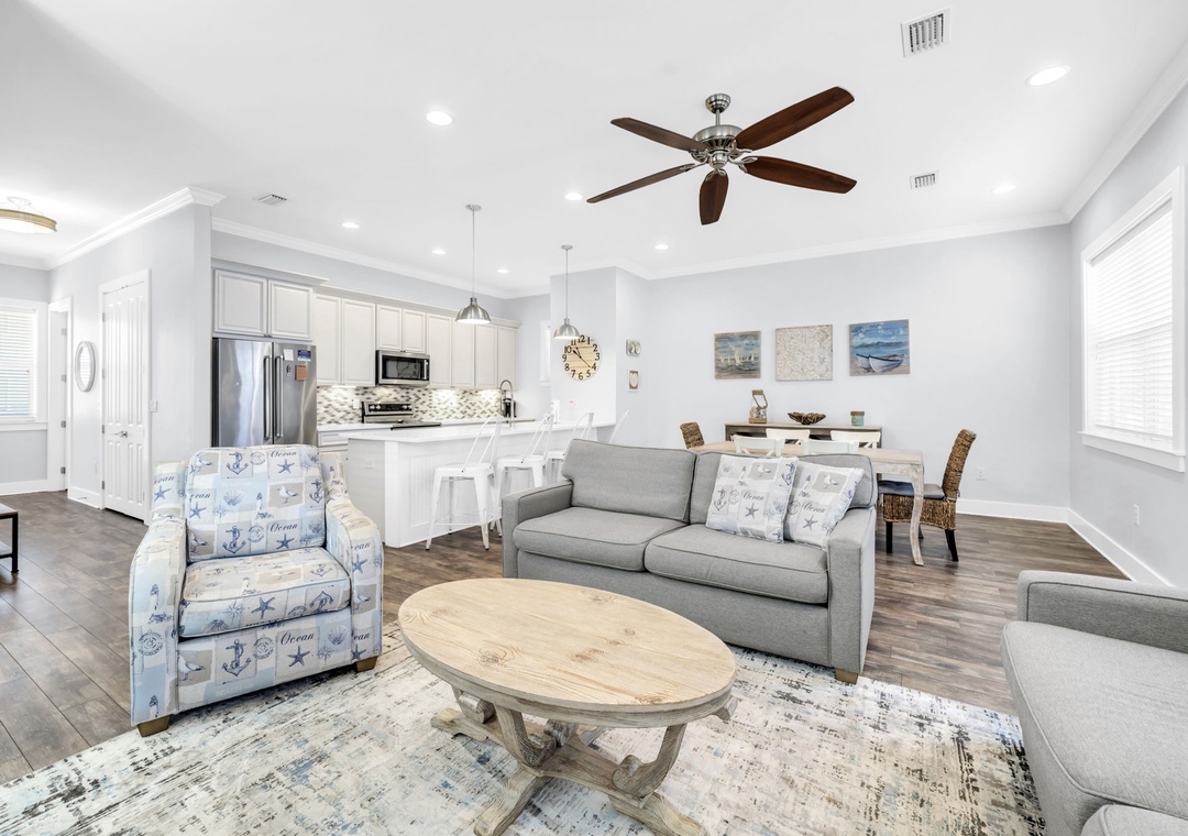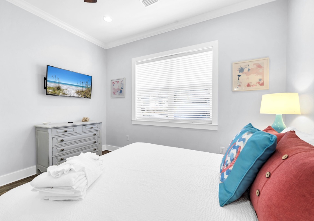 Welcome to Shore Beats Work 30A, your perfect home away from home! This stunning 4-bedroom, 4.5-bath retreat is nestled in the Gulf Reflections community, just off Highway 30A near Gulf Place. Only a few blocks from the beach, this beautiful home features a bright, open living and dining area ideal for gathering with family and friends. Start your mornings in the fully equipped kitchen, complete with an extended breakfast bar, perfect for cooking and enjoying breakfast together. The first floor offers a comfortable guest bedroom with a queen bed, while the second floor features a spacious king master suite with private balcony access, a second guest bedroom with a queen bed, and a fun bunk room with two twin-over-twin bunk beds — sleeping up to 10 guests comfortably. Every bedroom includes its own ensuite bathroom for added privacy and convenience. When you’re not relaxing indoors, take a dip in the community pool or enjoy a stroll to the nearby beach. Make unforgettable memories and enjoy the vacation of a lifetime at Shore Beats Work 30A!