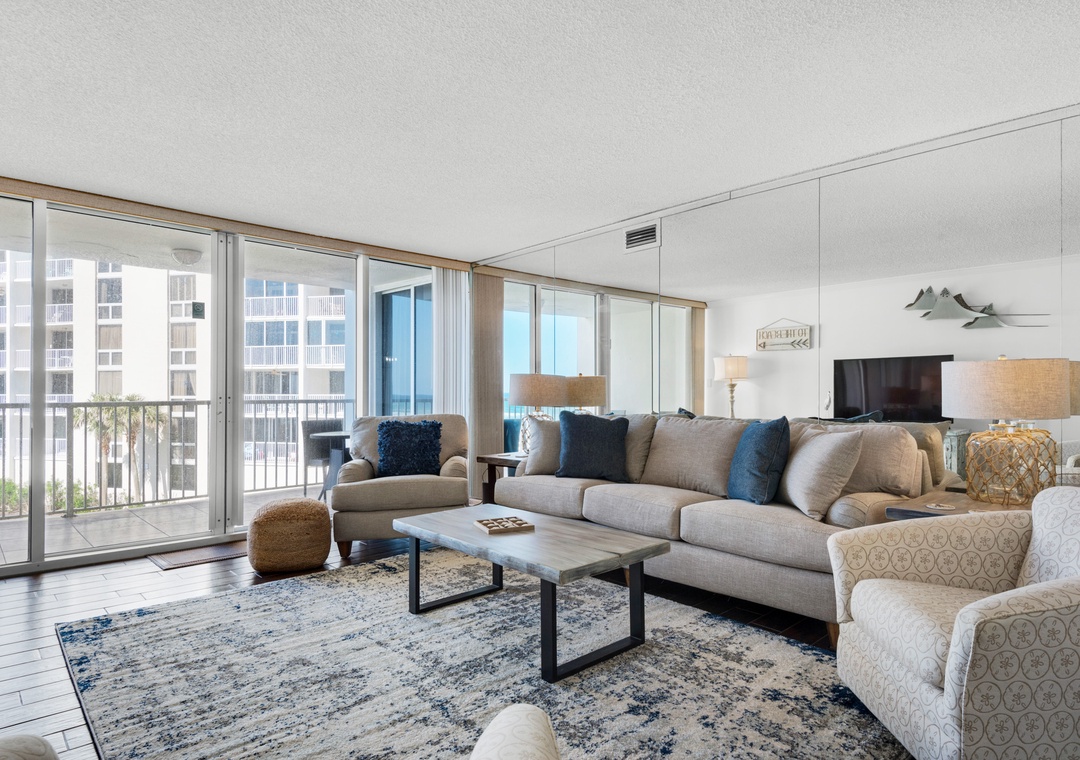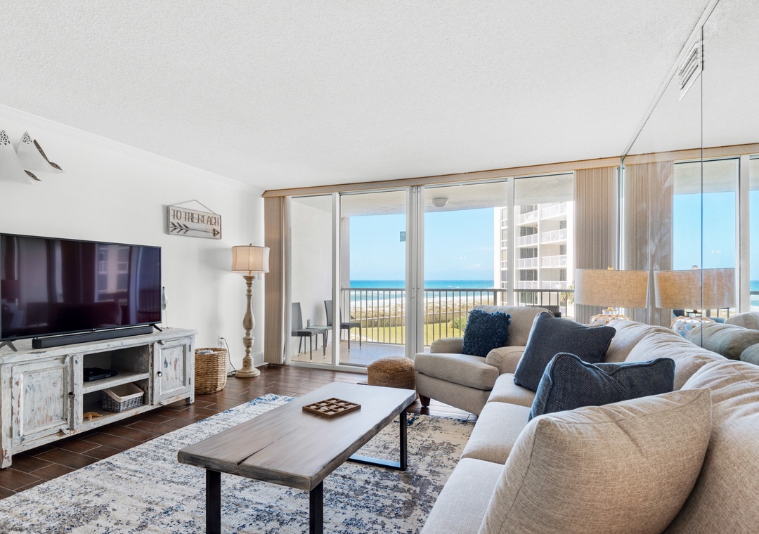Relax with spectacular beachfront views at Shoreline Towers 1035. Shoreline Towers 1035 is a newly remodeled 2BR/2BA condo. Located on the 3rd floor, this beautiful condo features a king size bed in the master and two queen beds in the guest room, sleeping 6 guests comfortably. Guests will enjoy a spacious living and dining room, and the resort amenities will make your stay unforgettable. Stay at Shoreline Towers 1035 for your next beach vacation.