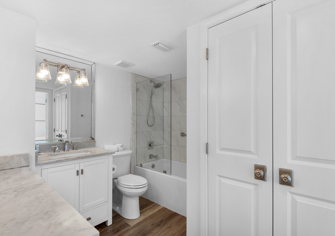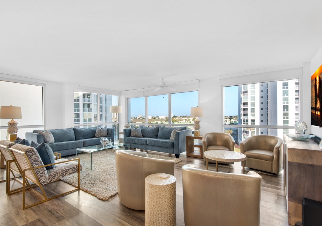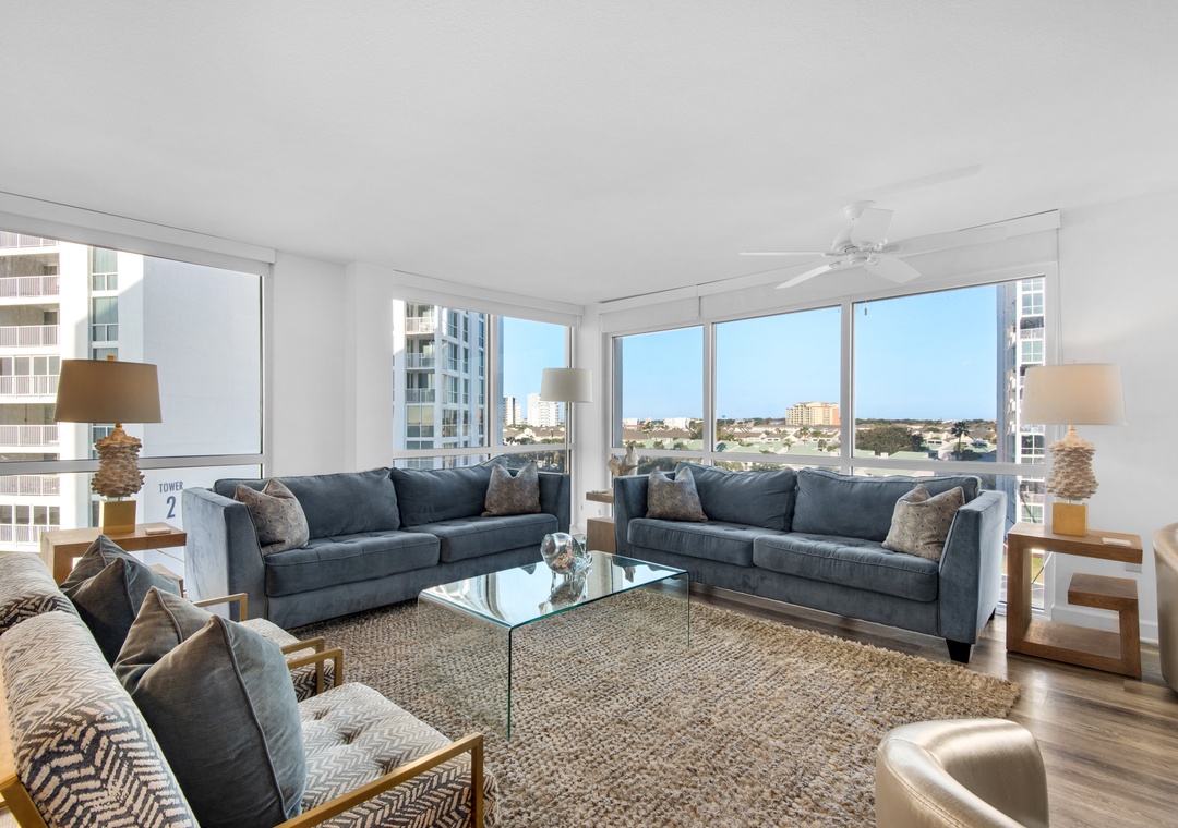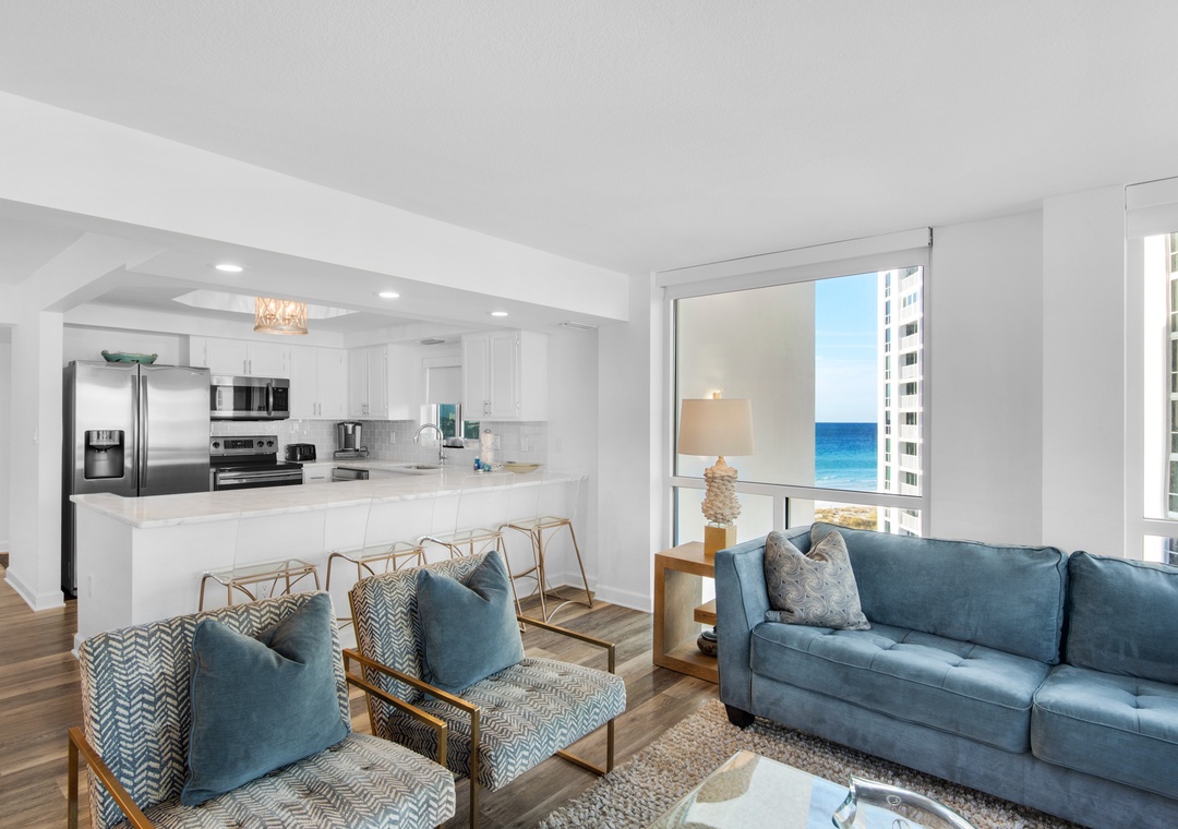 Escape to Paradise at Shoreline Towers 1066, a spacious 3-bedroom, 2-bath condo designed for comfort and relaxation. This beautiful condo features an open-concept layout that allows natural light to flood the space, enhanced by coastal décor throughout. Enjoy breathtaking views from every angle, with stunning Gulf vistas from the bedrooms, and sweeping city and harbor views from the living room. The inviting living area is the perfect spot to unwind after a day at the beach. Gather around the elegant dining table for a shared meal, prepared in the fully equipped kitchen featuring sleek stainless steel appliances and luxurious marble countertops. The condo offers flexible sleeping arrangements to accommodate up to 8 guests comfortably: two spacious master bedrooms, each with a King bed and en-suite bathroom, a cozy Queen guest bedroom, and a third bedroom with two twin/full bunk beds—ideal for families or kids. Plus, a convenient sleeper sofa in the living room ensures everyone has a comfortable spot to rest. With the perfect combination of style, comfort, and spectacular views, Shoreline Towers 1066 is your ideal getaway for making unforgettable beach memories. Enjoy everything that the Shoreline Towers complex has to offer with amenities including a private beach, fitness facility, and a community pool with sundeck. There is also a community grill and picnic area for those who like to cook out. Come see why the fun never stops at Shoreline Towers 1066!