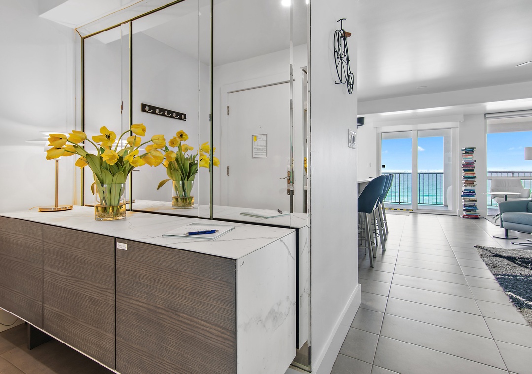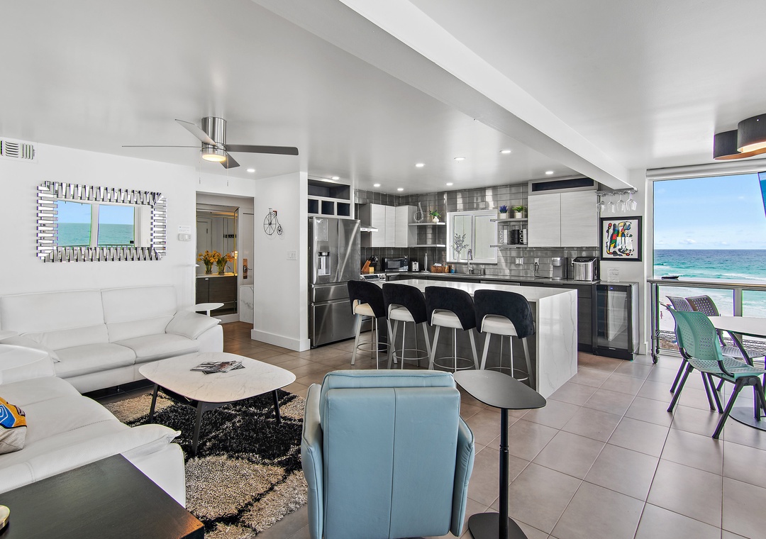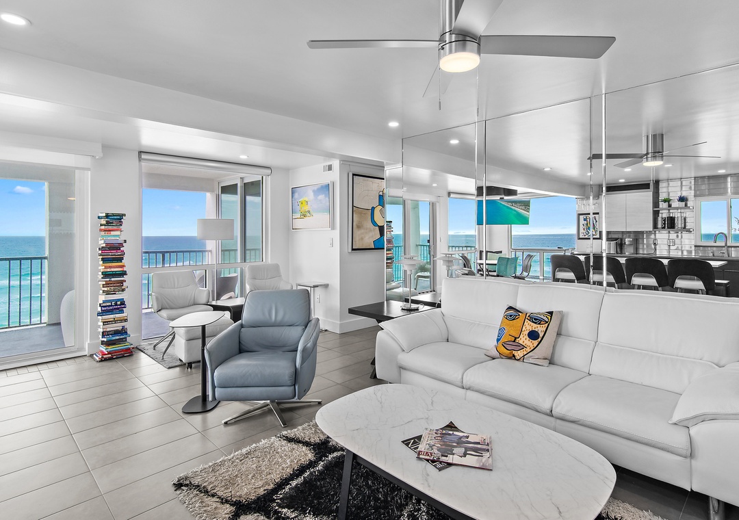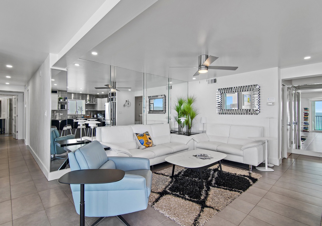 Inside, the residence has been thoughtfully reimagined with sophisticated coastal design and high-end finishes throughout. The open-concept living and dining space is both elegant and inviting, featuring designer furnishings and expansive glass doors that frame the Gulf like a living masterpiece. Every detail has been curated to create a refined yet relaxed atmosphere ideal for entertaining or unwinding in style.