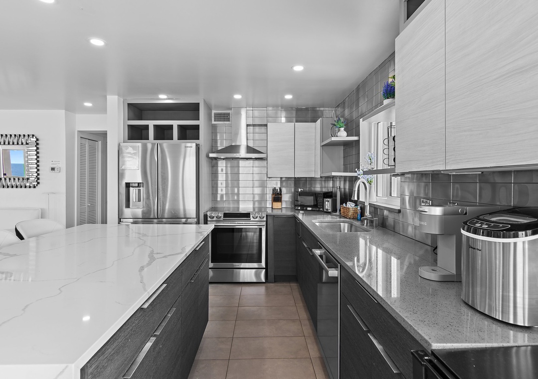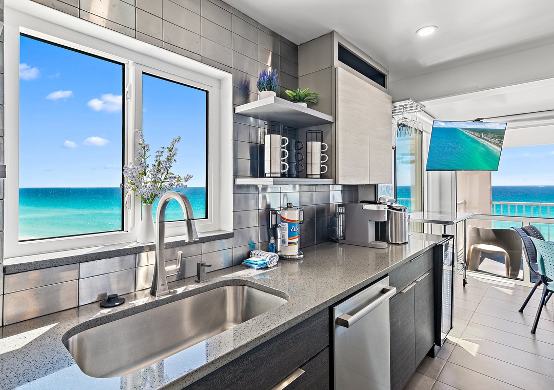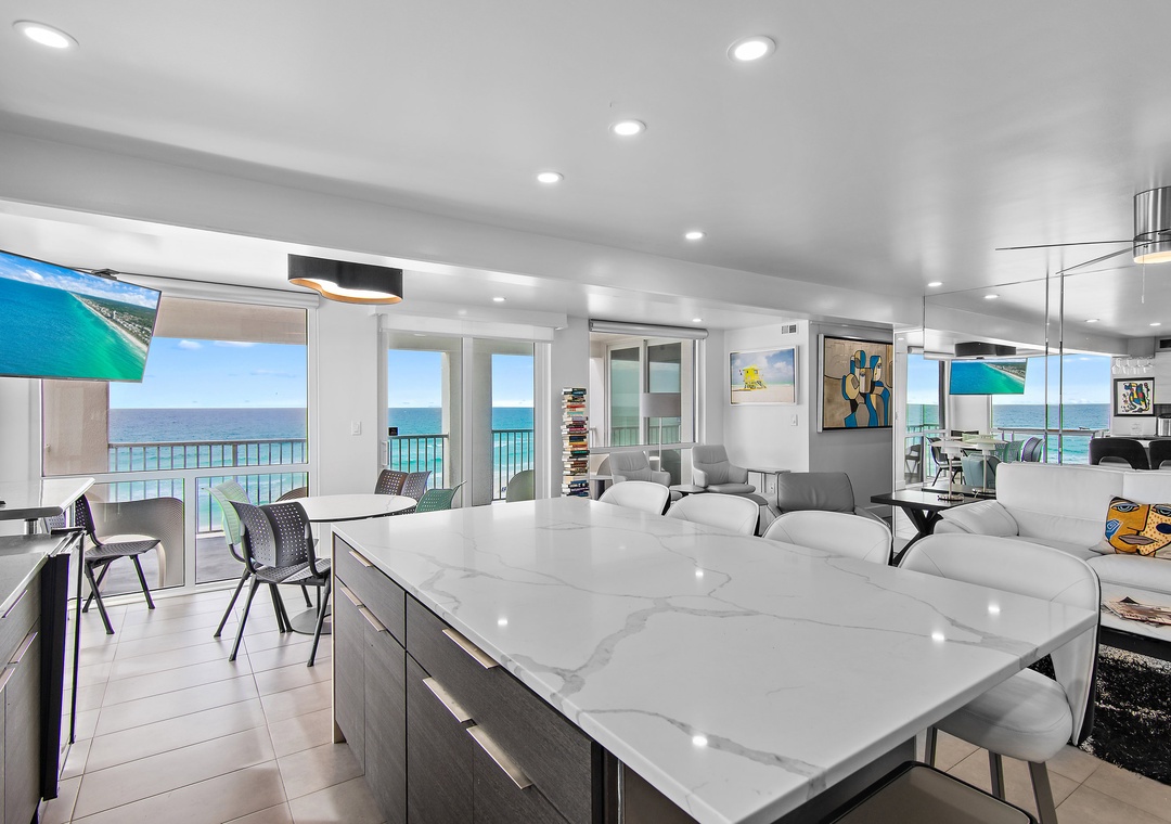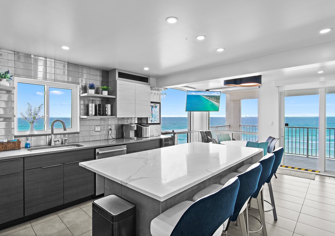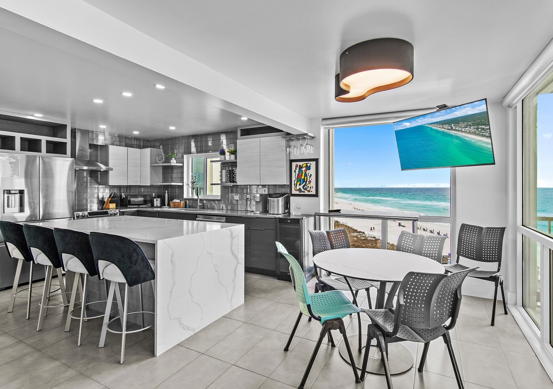 The chef’s kitchen rivals those found in luxury homes, appointed with sleek stainless-steel appliances, premium finishes, and everything needed to craft unforgettable meals with the Gulf as your backdrop.