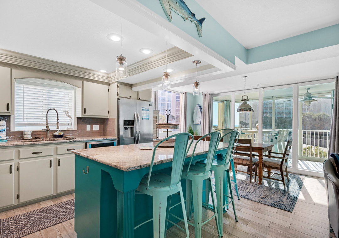 We loved our stay and would highly recommend to anyone. It is not ocean front but is ocean view. Good enough knowing that the inside was so good! The kitchen was as well stocked as my own. Everything you need! We prepared breakfast and enjoyed the use of the griddle each morning. And the stock pot came in handy when we made a low country boil. The beds were so comfy but be warned...you have to climb up because the beds are so high. Stools would have been a nice touch in each room. I worry that elderly guests wouldn’t be able to get in beds and I don’t remember that being stated when I booked. I loved the chargers for personal use placed at the bedside. Used the washer and dryer and are of top notch quality. 😊 Love the enclosed balcony/porch. Used everyday of our stay and the “big kids” loved the Pac-Man. Liked the beach service of two chairs and umbrella but make sure you go early. It’s first come-first serve and when we used, only 4 left and we got 3rd row. Not bad just didn’t know process on how to utilize. Overall, great time and would definitely stay again!- Reviewed On: 5/25/2021