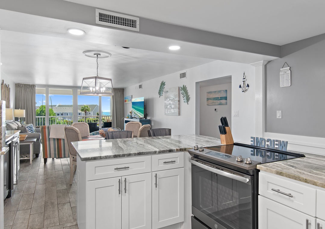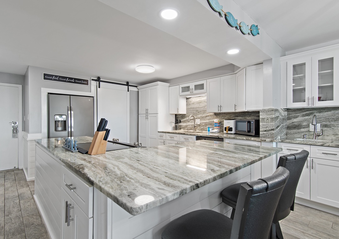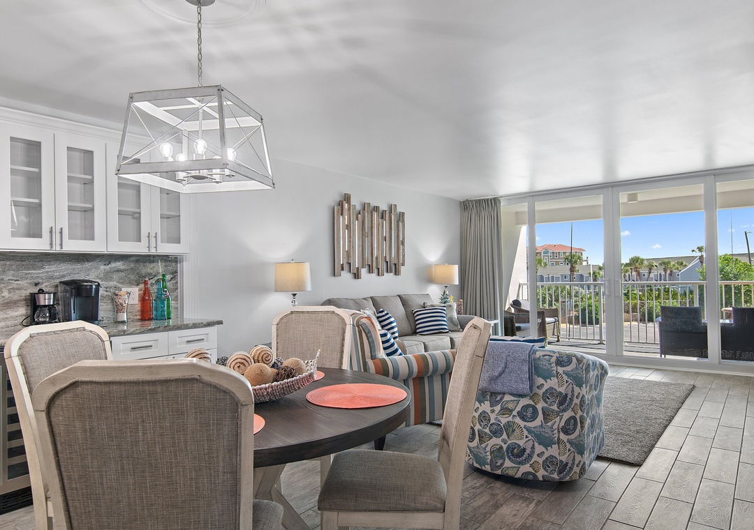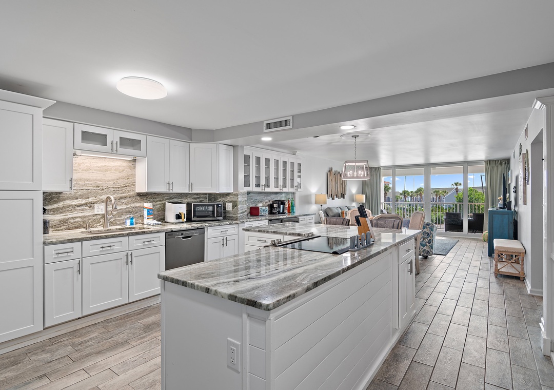 Welcome to the newly renovated Shoreline Towers 3033, a spacious beachfront retreat offering two bedrooms, two full bathrooms, and accommodations for up to six guests, as permitted by the HOA. Step into a beautifully updated kitchen featuring granite countertops, stainless steel appliances, and all the essentials for a comfortable stay. Enjoy meals at the generous breakfast bar or gather in the adjacent dining area. Just off the kitchen, a convenient wet bar includes a sink, wine cooler, and ice maker — perfect for entertaining. Soak in the vibrant coastal colors and serene Gulf views from your private balcony, an ideal spot to unwind any time of day. When evening falls, the inviting living room offers a cozy place to relax, complete with a queen sleeper sofa for added flexibility. The spacious primary suite boasts a king bed, stunning Gulf views, and direct access to the balcony. The guest bedroom features two queen beds, providing plenty of space for family or friends.