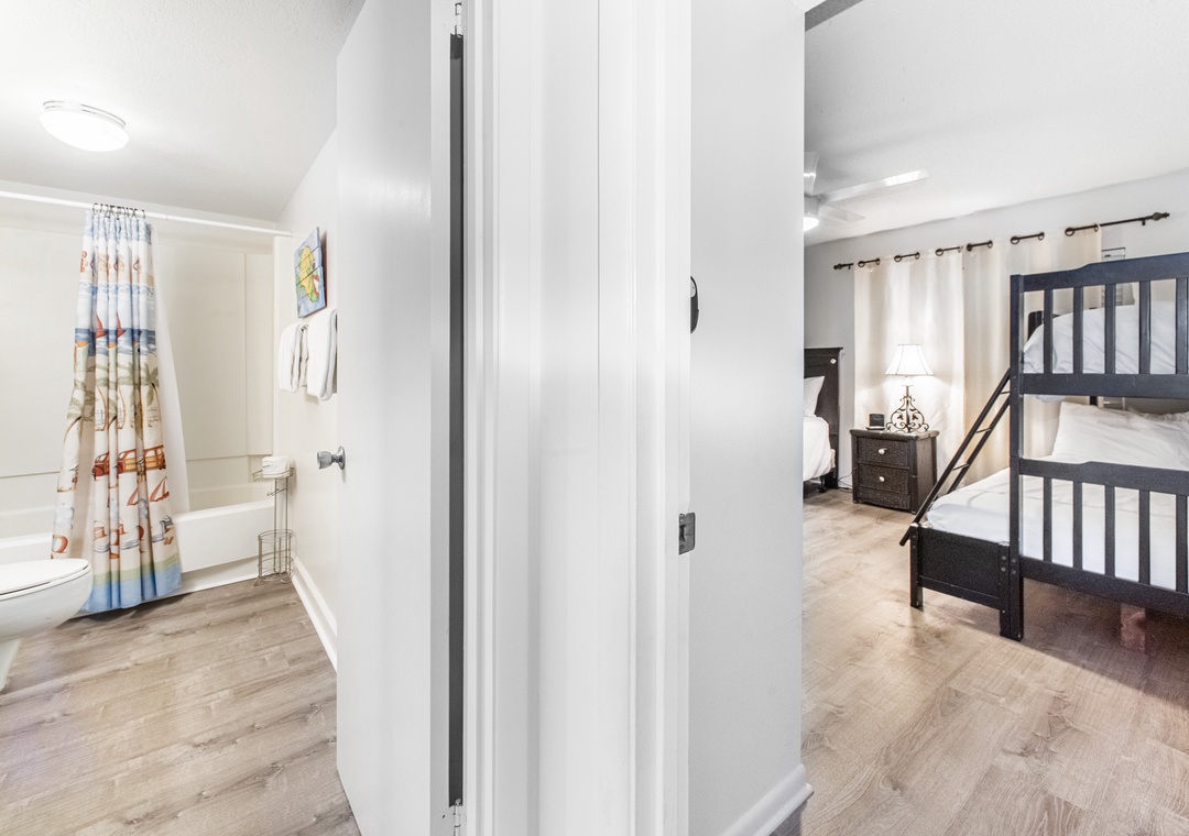Shoreline Towers 3083 is a two bedroom/two bath condo just footsteps from the sugar white beaches and emerald waters in Destin, Florida. With a high-end, oversized queen size bed in the master, a queen and twin over full bunk in the second bedroom, and a sleeper sofa in the living room, this beautiful condo sleeps 6 comfortably! Recently updated, this beautiful condo now offers all new living room and patio furniture, new TV and ceiling fans, new artwork, and refinished kitchen cabinets! The gulf views, private balcony, eat-in kitchen and resort amenities will make your stay special. Head to the beach, enjoy the sauna, a lap around the pool, a game ofshuffleboard, a barbeque, or a picnic overlooking the lake! Come to Shoreline Towers 3083 for a family favorite vacation!