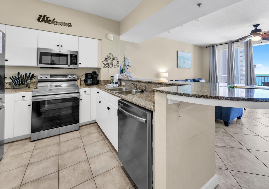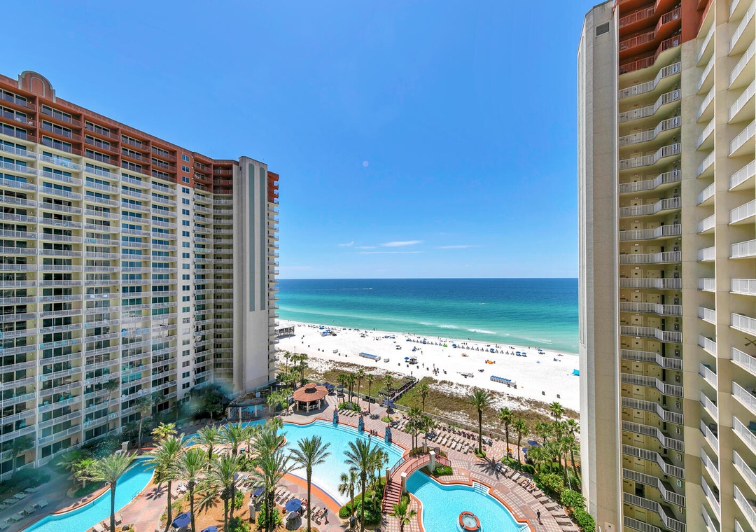 Welcome to Sunshine Getaways at Shores of Panama 1212. This 12th floor beautifully renovated 2 bedroom, 2 bath condo has been redesigned to offer a family- oriented layout and amenities. The master bedroom offers gulf views, Smart TV, a king bed, and En suite. A bunk room provides a twin over twin bunk, and additional sleeper sofa in the living room to accommodate up to 6 guests comfortably. Enjoy the view while relaxing on your XL private balcony or while curled up on the couch in the living room enjoying a movie on the Smart TV. The chef will enjoy a fully equipped updated kitchen featuring stunning granite countertops, stainless steel appliances, and seating for 5 up at the bar. Enjoy convenient parking outside of the condo, and a washer and dryer in the second bathroom. Let the view coax you downstairs and spend your days in the sand, soaking up the warm sunshine, and enjoying all the amenities that Shores of Panama has to offer. Visit Sunshine Getaways today!